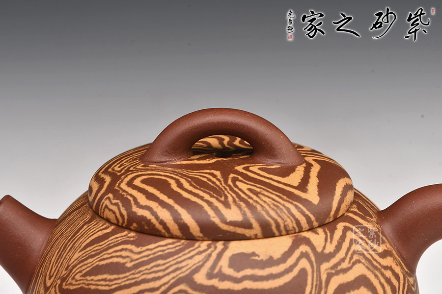 形象飽滿富態(tài),口蓋嚴(yán)絲合縫,在蓋面布局花紋,著力打造絢麗的花朵造型,給人以十分舒暢的視覺效果。鈕流把作拱橋狀,自然和諧,顯得豐腴、成熟和飽滿。
