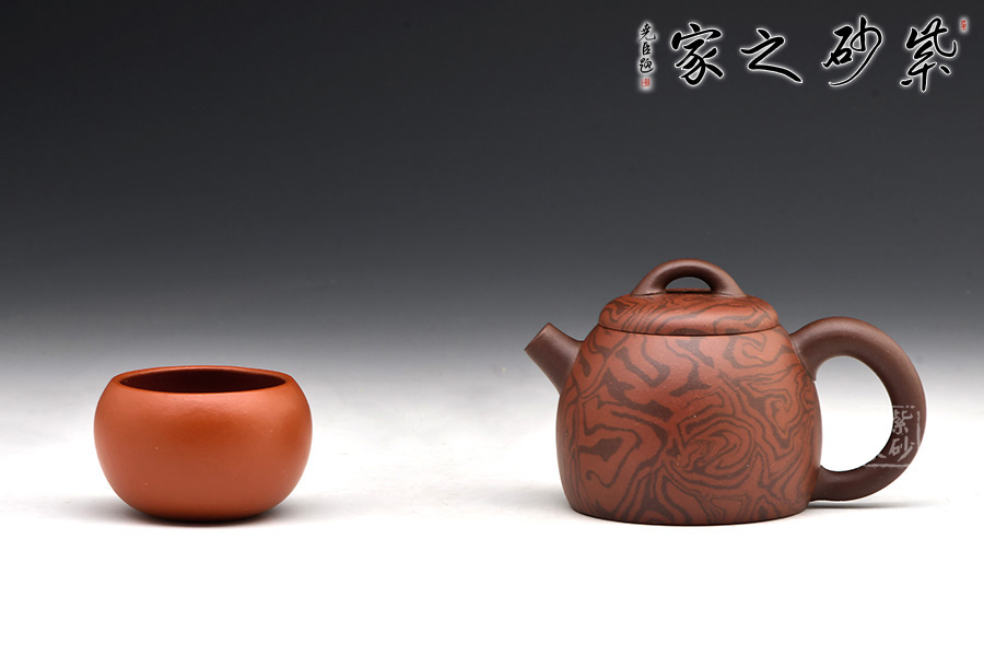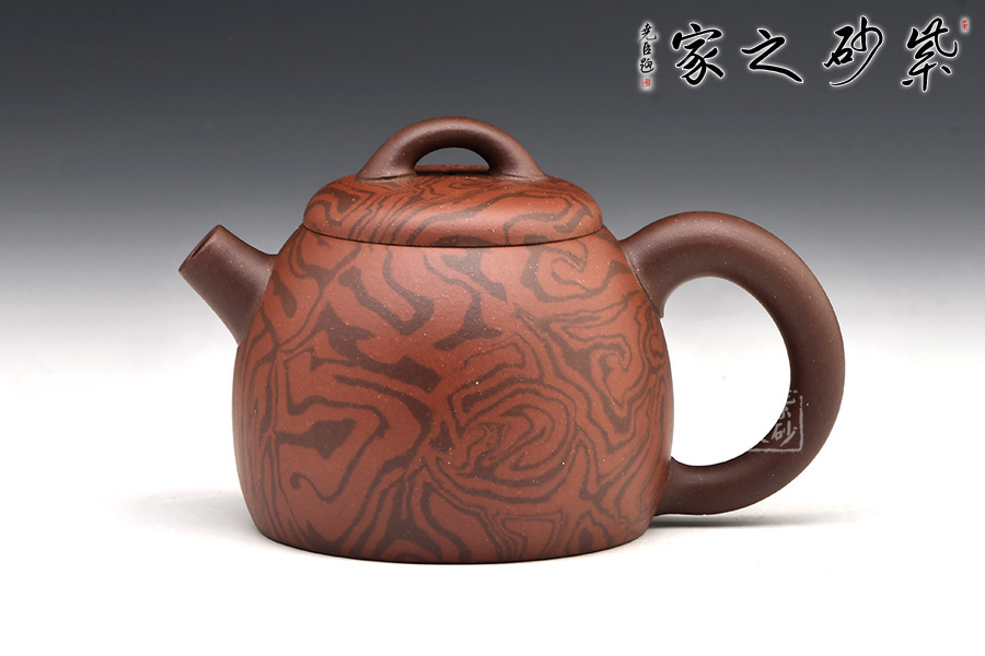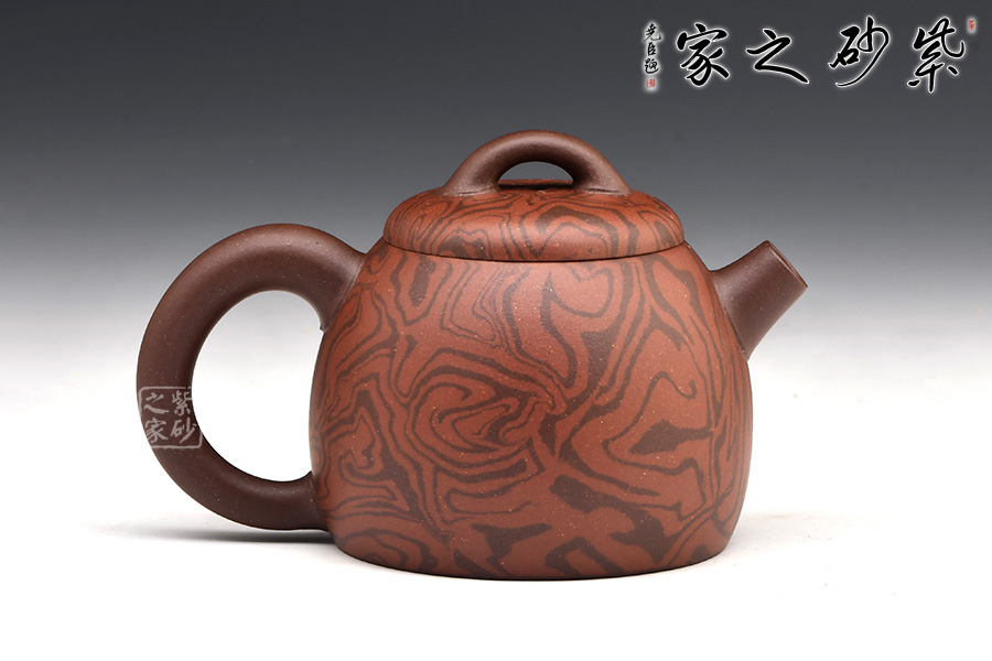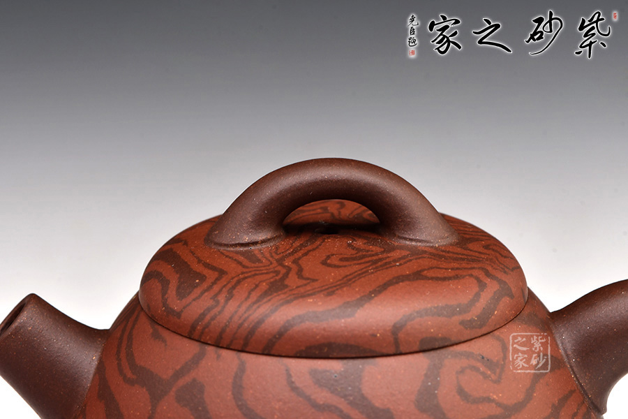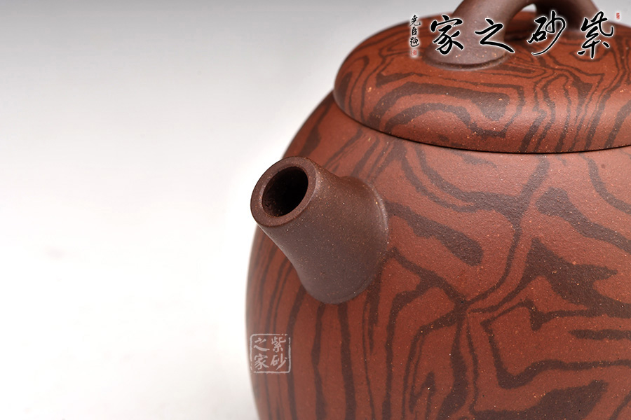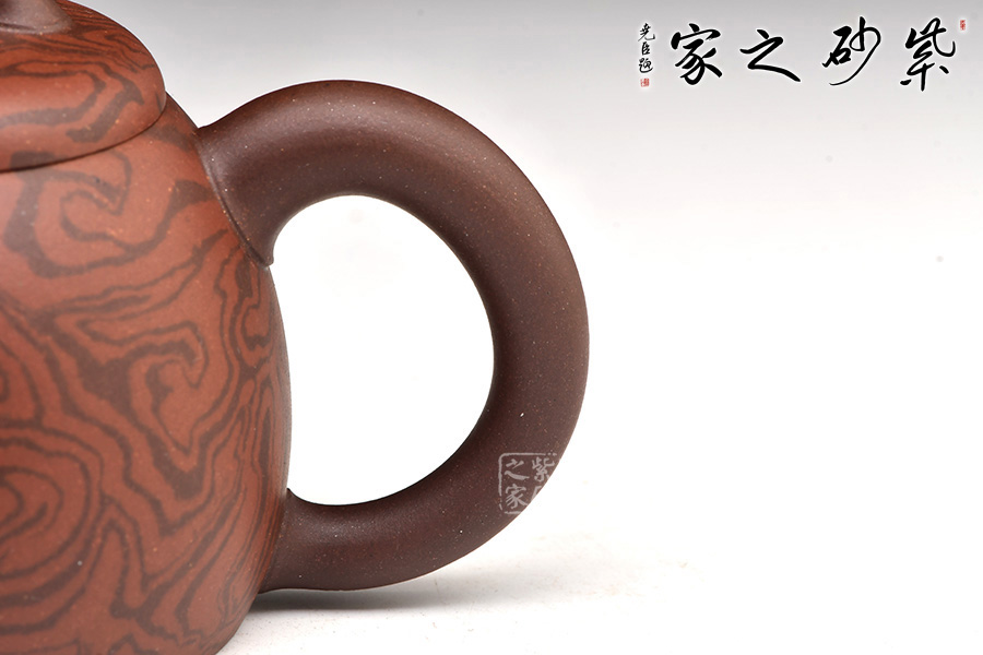 榮華,濮晨作品。師從中國(guó)陶瓷藝術(shù)大師呂俊杰、研究員級(jí)高工談躍偉,此壺為秦權(quán)樣式。秦權(quán)造型來(lái)源于秦朝秤砣,古色古香,應(yīng)有的神韻與氣度一點(diǎn)不差;一彎嘴自然胥出,嘴頭齊整,干脆利索,出水順暢;耳形把粗細(xì)適中,端握舒適;截蓋讓壺身更完整,橋形鈕孔如秤砣的穿繩孔,精巧別致;壺身飽滿,裝飾花紋,端莊大氣。
