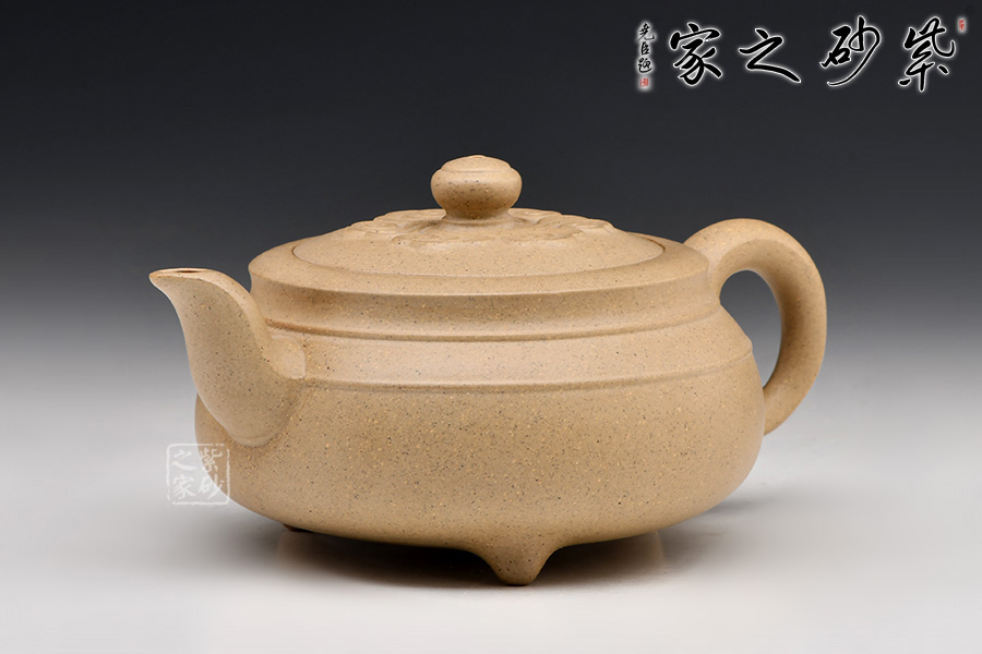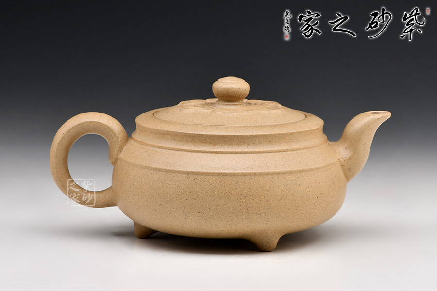 壺身成香爐狀,下闊上收,底有三足,彎流嘴胥出,耳形把拿捏合適,內(nèi)嵌形壺蓋,上有一圓形鈕,與壺造型相似,相得益彰。