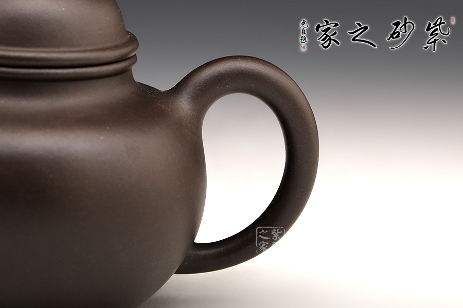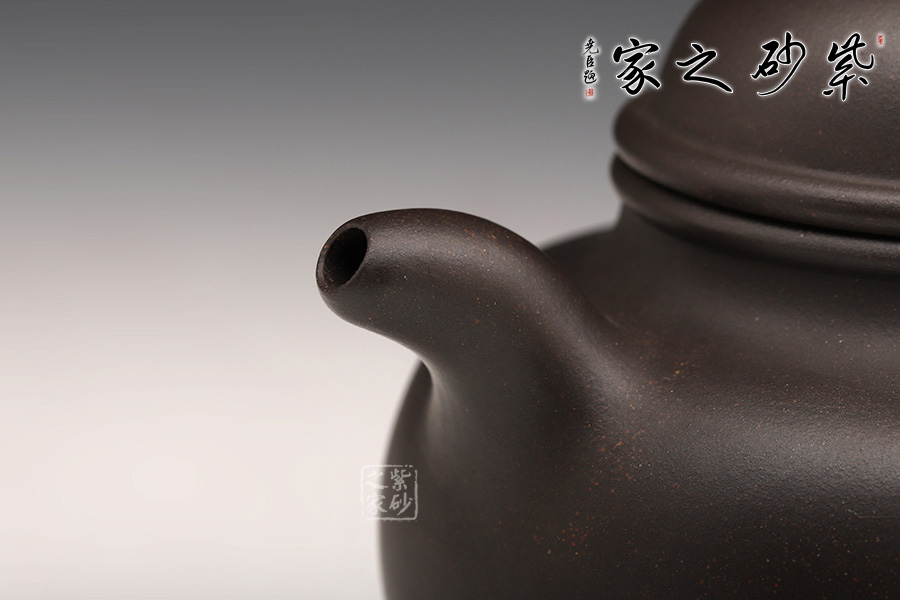 經(jīng)典的掇球器型,此壺有著渾圓的壺身,半圓的壺蓋,圓鈕,線條流暢,比例得當(dāng),壓蓋略微渾厚,點線之間見出魅力,子母線口蓋溫和嚴密,骨肉亭勻,簡練大方,制作頗見功力。彎流嘴胥出,在端頭下壓,柔美之姿明顯,壺柄略微上抬之后優(yōu)雅滑落而下,形成一條圓潤飽滿的弧線,樸雅大方。