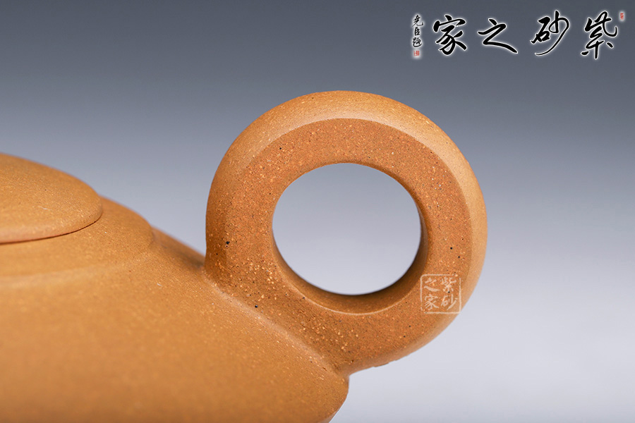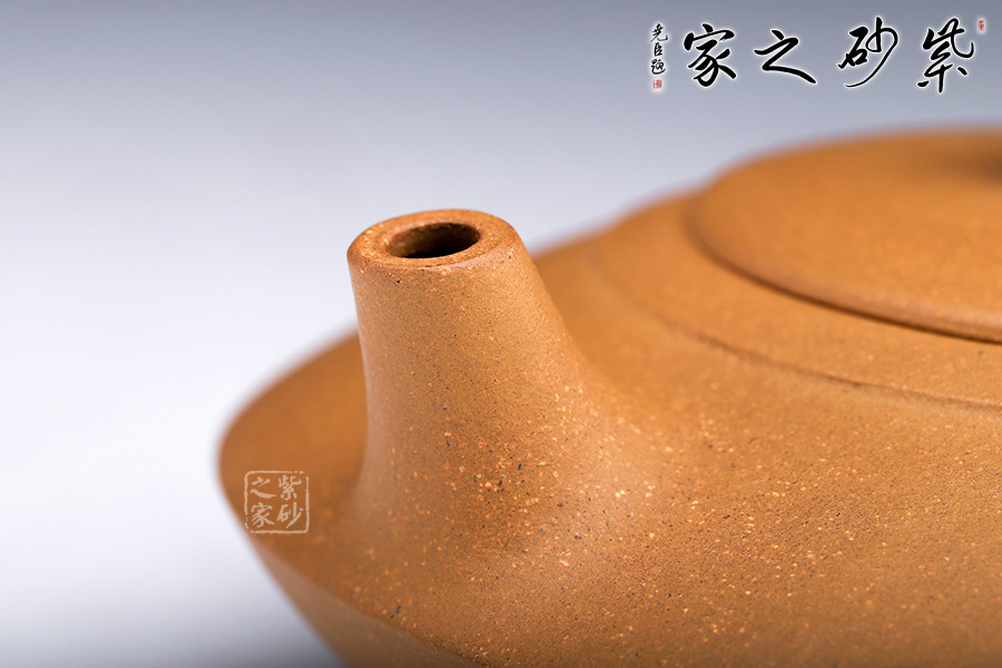 此壺線條優(yōu)美,壺腰的線條極致突出,壺身整體像一對(duì)合好的銅鑼,連接的完美無瑕,這種弧度成型,難度非常高,可見功力之深厚。壺把跟壺鈕是兩個(gè)大小不同形狀相同的圈,圈也是圓,寓意團(tuán)團(tuán)圓圓。壺蓋嵌在其中,完美無瑕,飽滿圓潤。壺嘴沿著壺身的角度直線延申,暗接自然。設(shè)計(jì)巧妙,寓意美好。