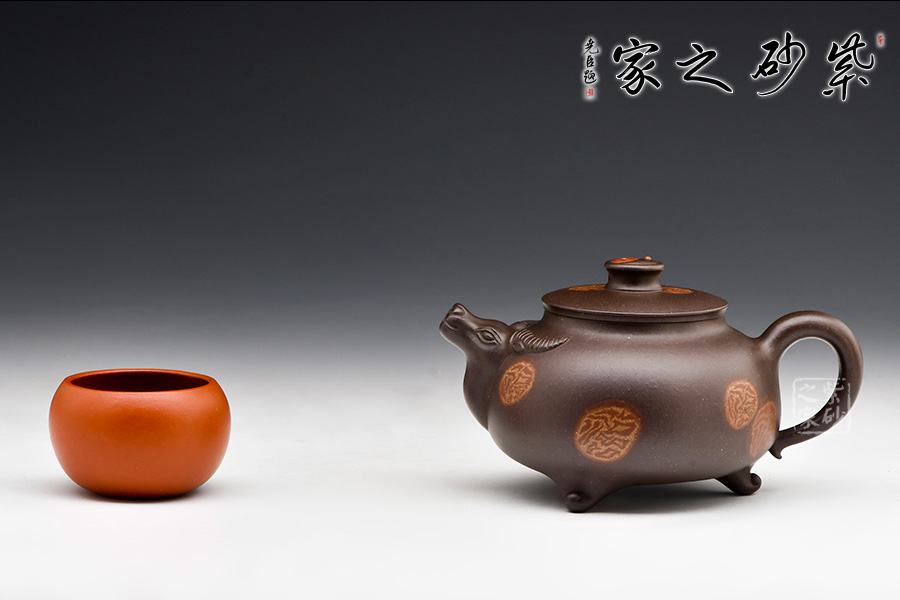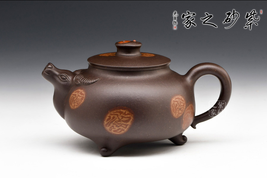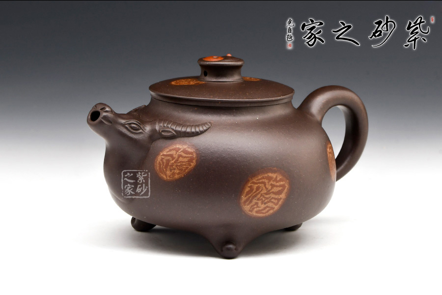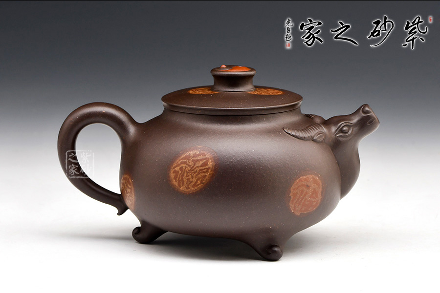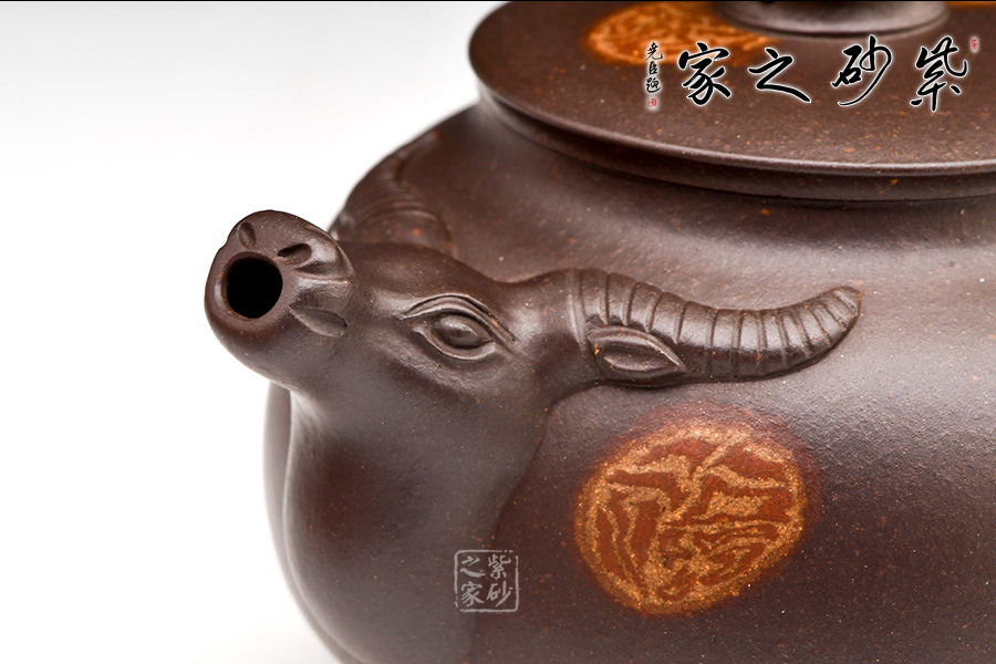 壺嘴牛頭,兩角伸出,兩側(cè)點(diǎn)眼。圓壺為牛身,輪廓清晰,方中寓圓。圓把做牛尾,卷曲有致。平肩高頸壓蓋,以太極陰陽(yáng)魚(yú)做鈕,逼真自如。定能六六大順,扭轉(zhuǎn)乾坤!