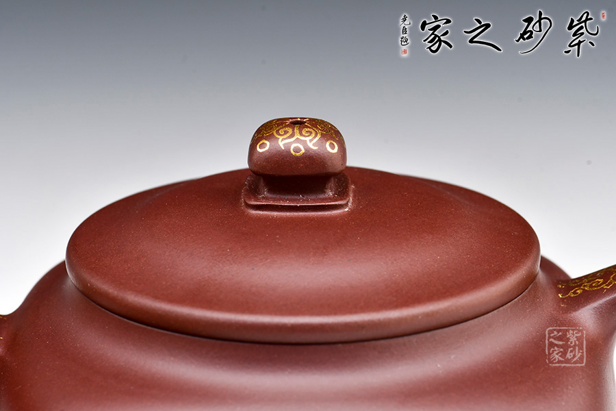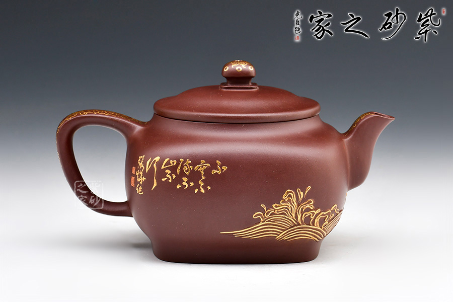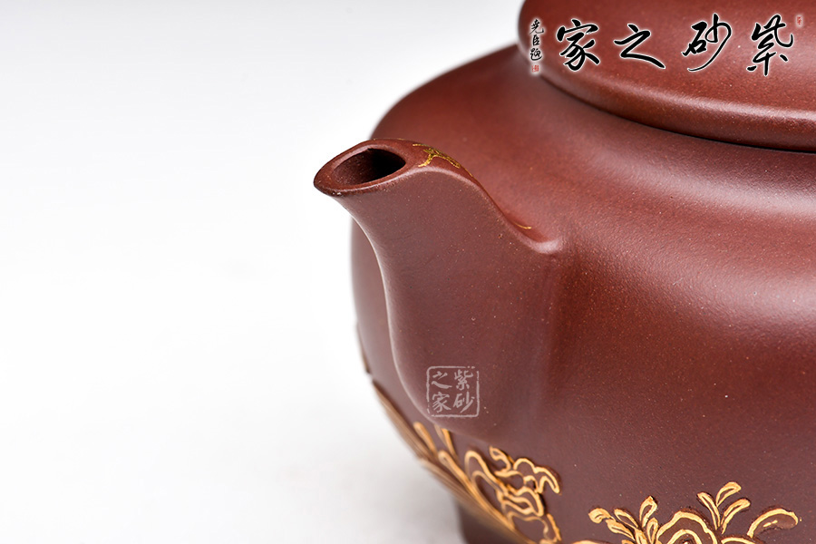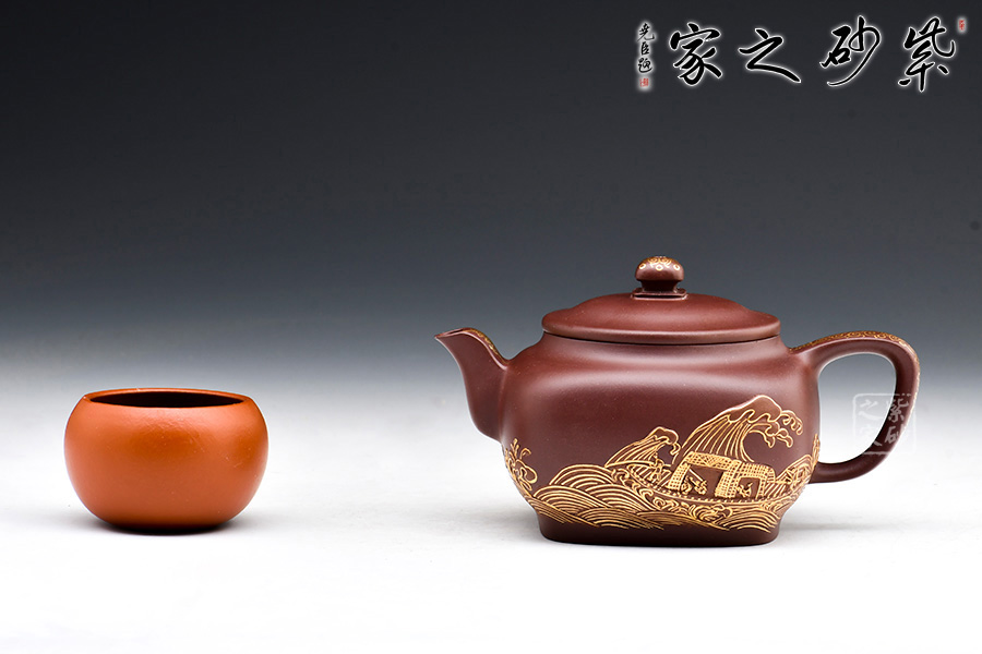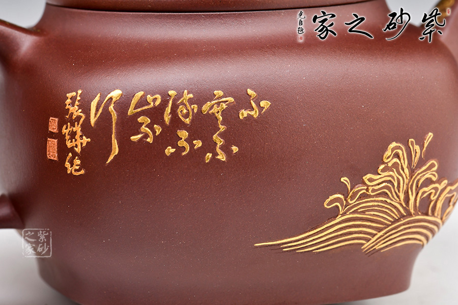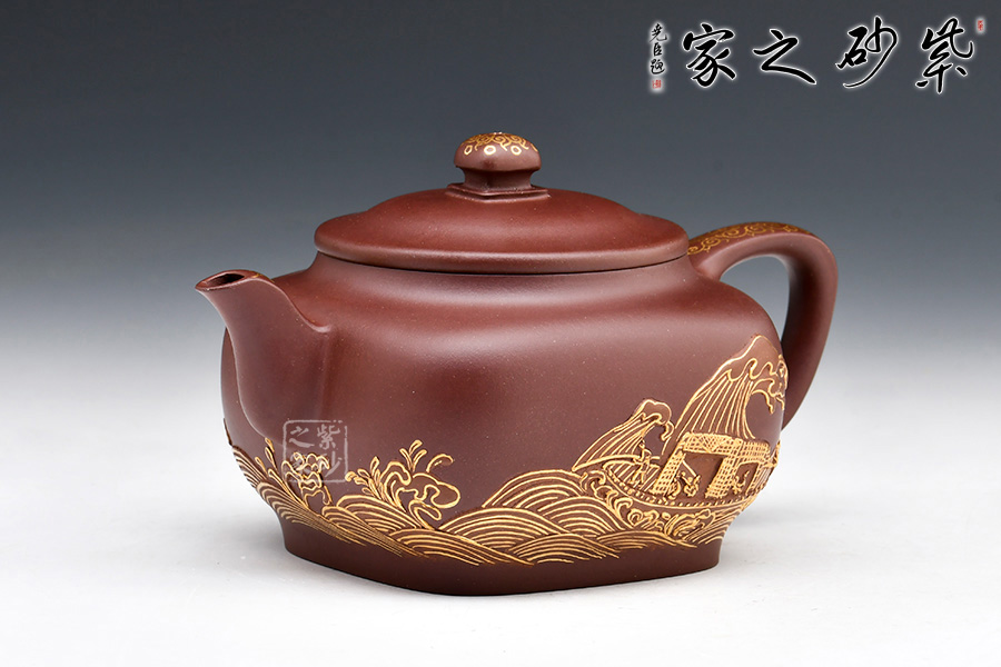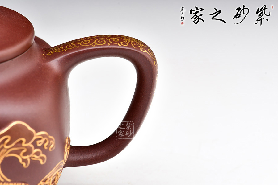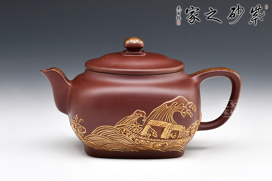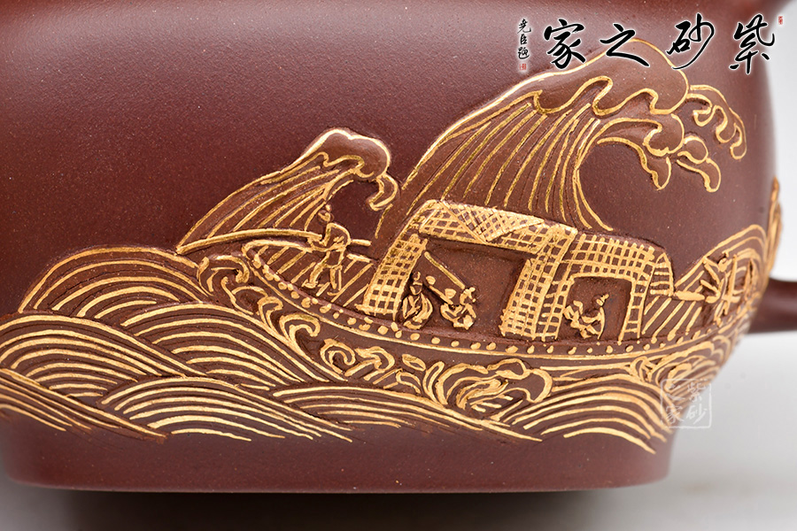 此壺選用原礦紫泥精致而成,造型飽滿,方中孕圓;壺嘴與壺把暗接,平蓋咬合緊密,中心凸起,上置一蘑菇型壺鈕,造型精美。壺身描金紋理,繪制風(fēng)浪與眾人操作船只,寓意同舟共濟(jì),乘風(fēng)破浪的合作精神。