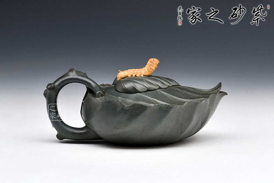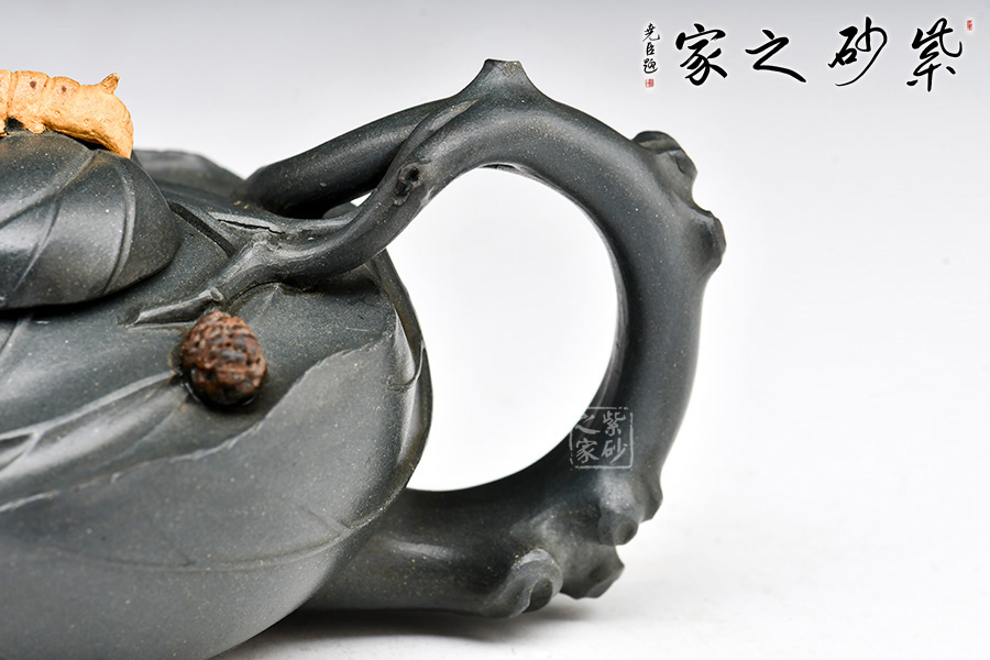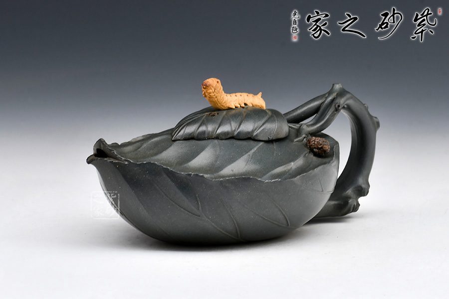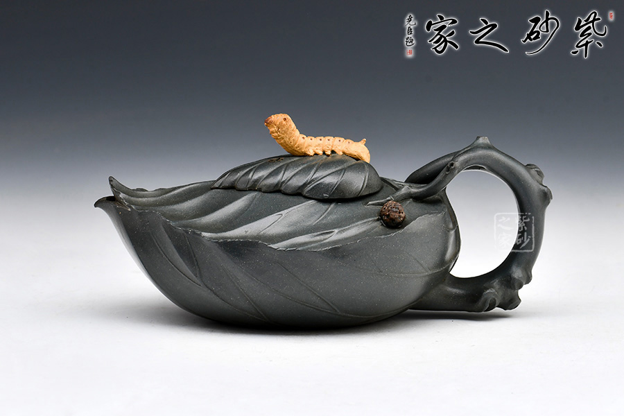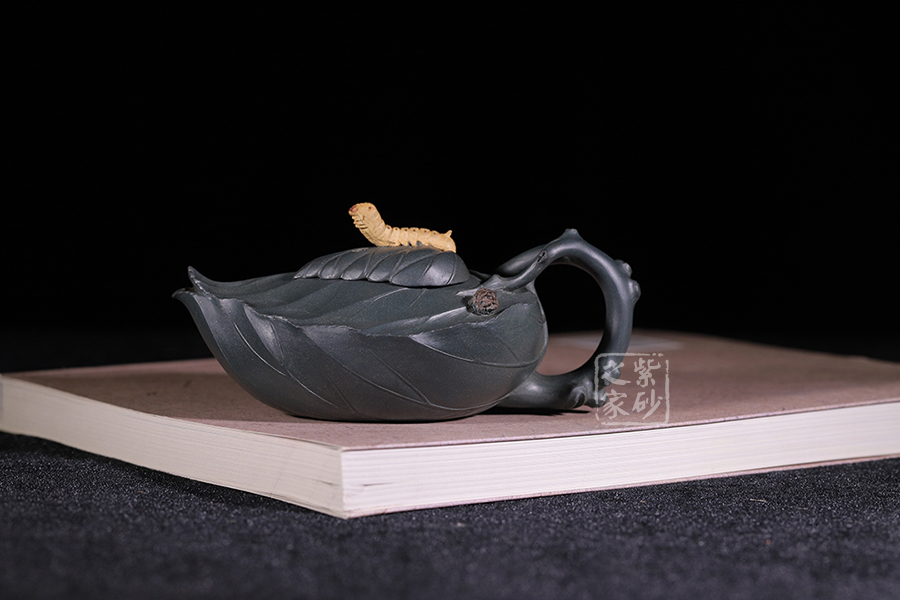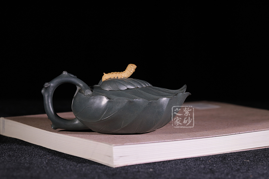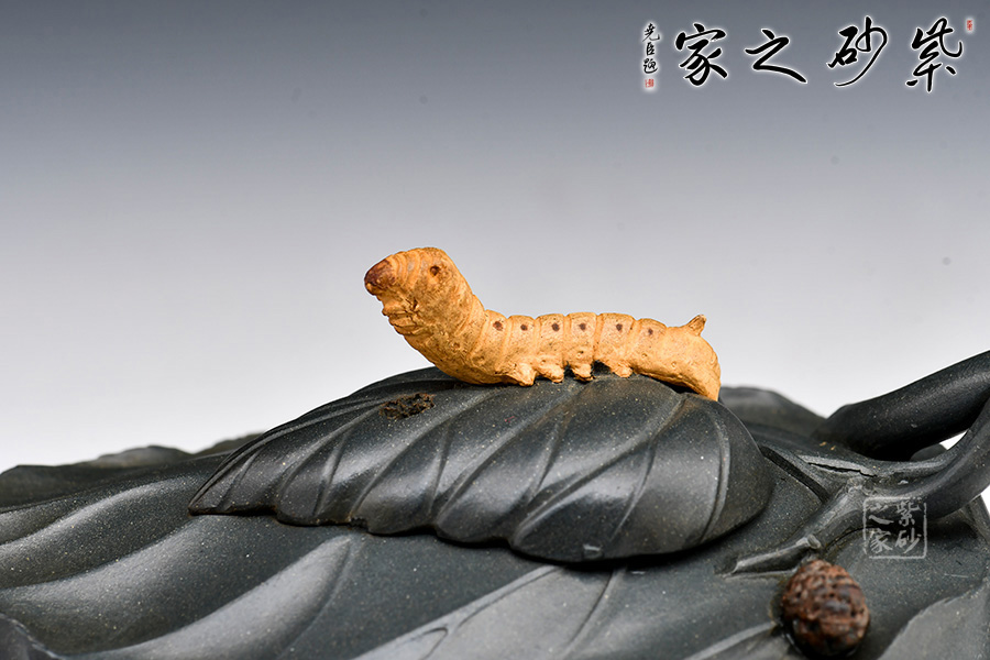 桑寶壺是謝曼倫老師的經典代表作之一,此壺的創(chuàng)作來源于老師對生活的發(fā)現,整器以一片樹葉為型,樹葉紋理清晰自然,十分逼真細膩,壺蓋以略小樹葉設計,壺蓋上的蠶寶寶作昂首狀,正汲取生命之養(yǎng)分;壺體上碩大的桑果栩栩如生,令人垂涎欲滴,顯示了大自然旺盛的生機,同時也留下許多兒時的回憶!