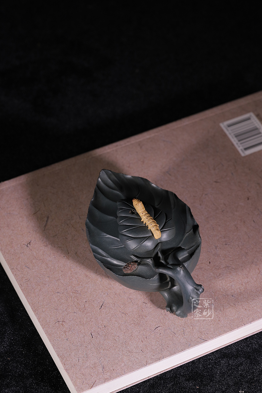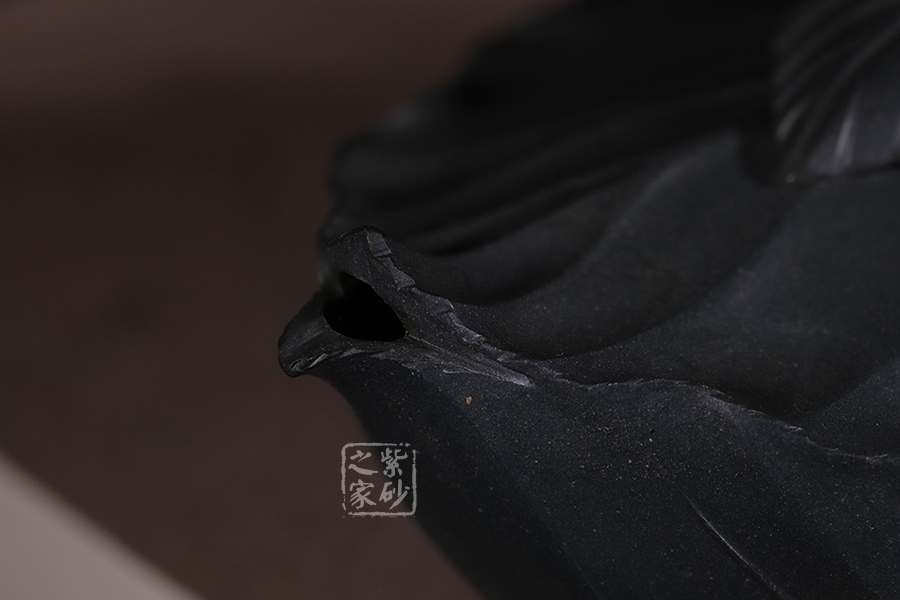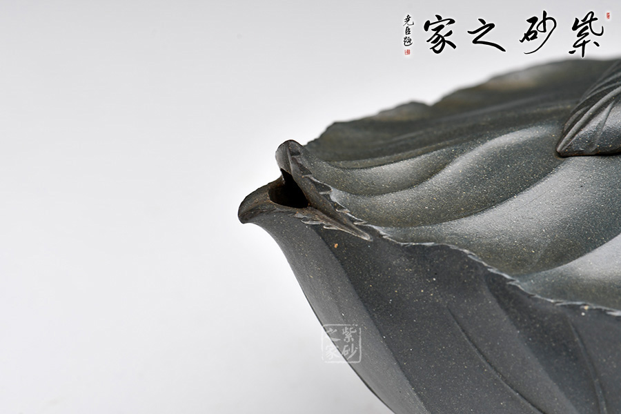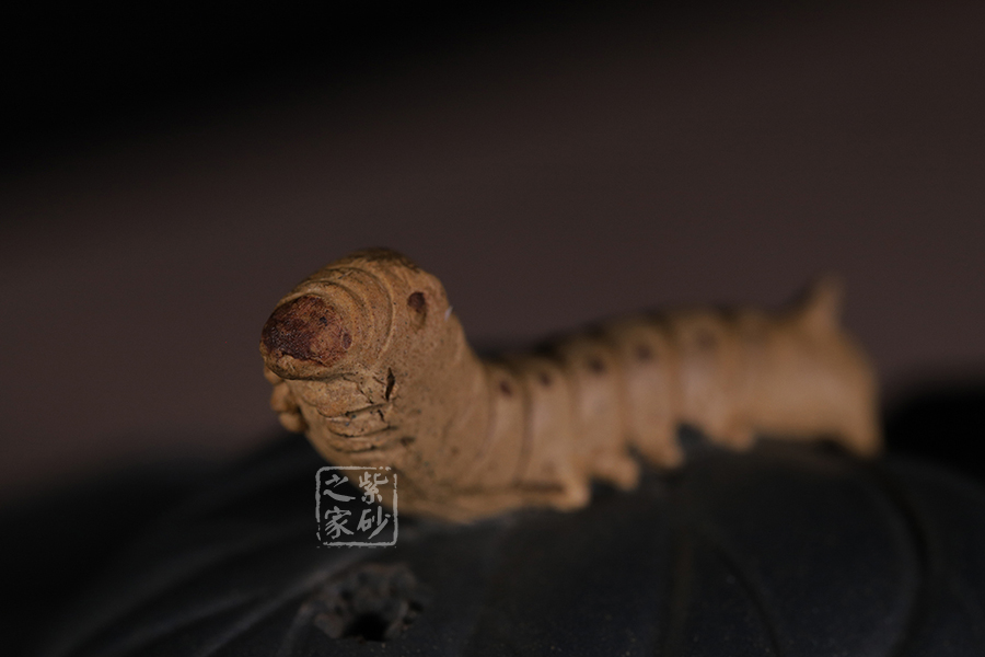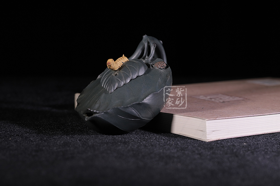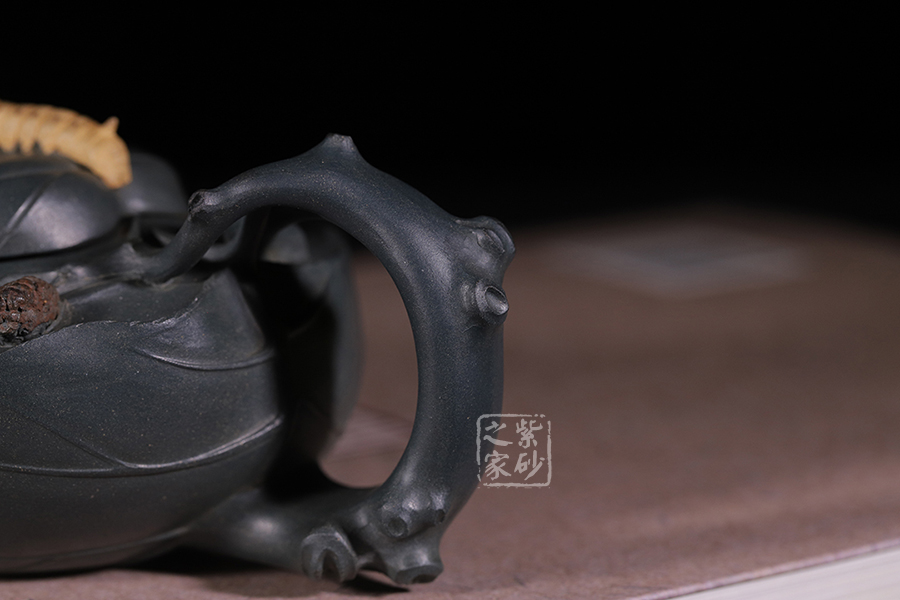 桑寶壺是謝曼倫老師的經典代表作之一,此壺的創(chuàng)作來源于老師對生活的發(fā)現,整器以一片樹葉為型,樹葉紋理清晰自然,十分逼真細膩,壺蓋以略小樹葉設計,壺蓋上的蠶寶寶作昂首狀,正汲取生命之養(yǎng)分;壺體上碩大的桑果栩栩如生,令人垂涎欲滴,顯示了大自然旺盛的生機,同時也留下許多兒時的回憶!