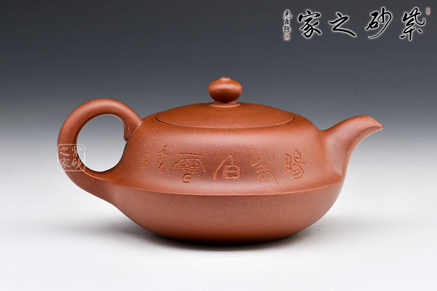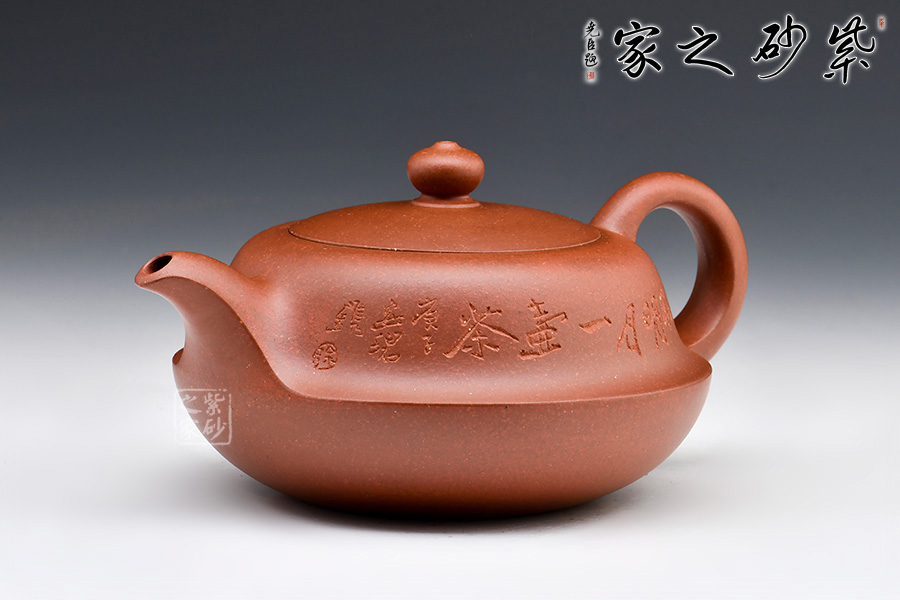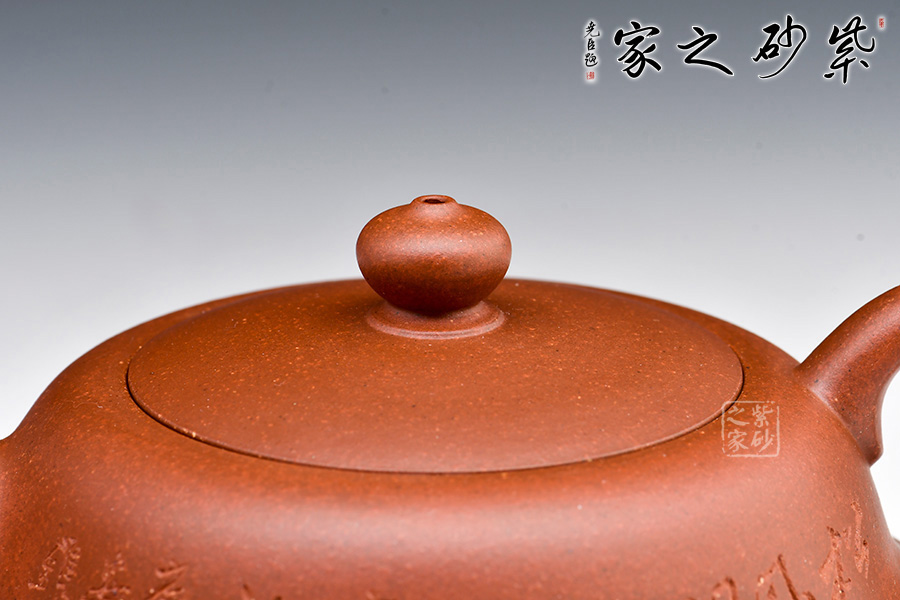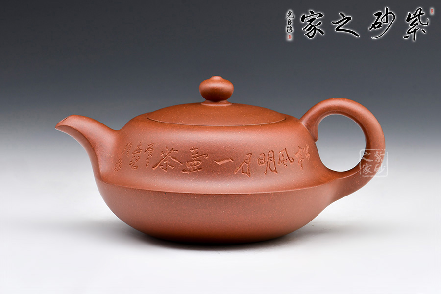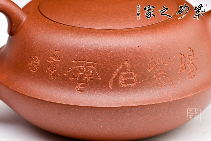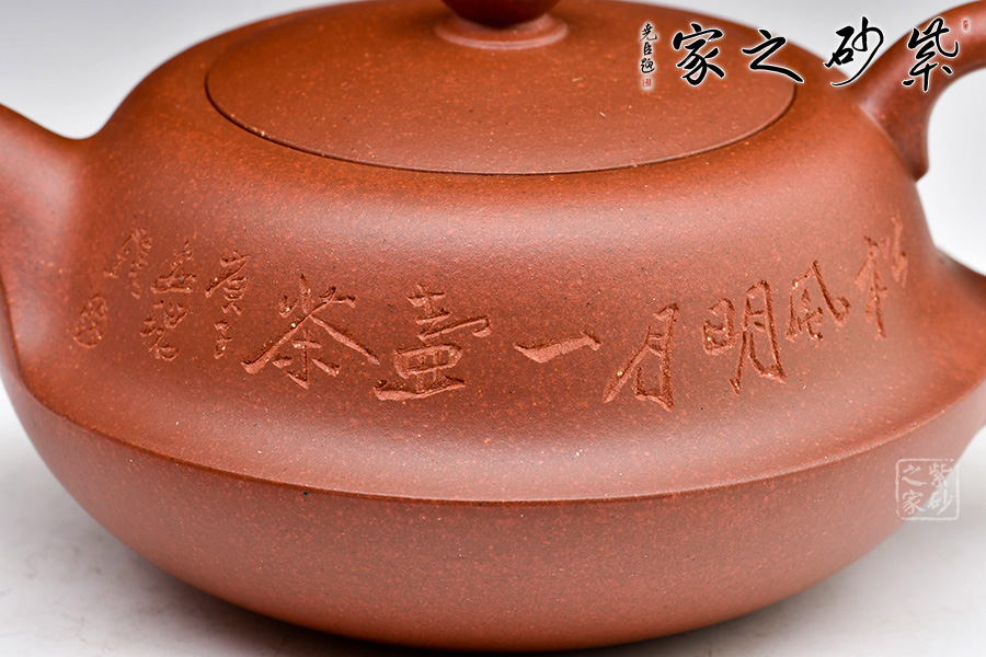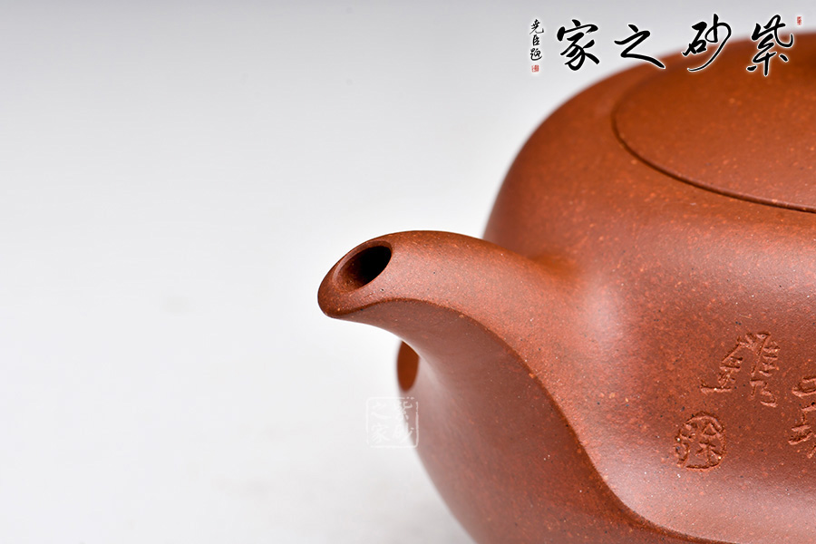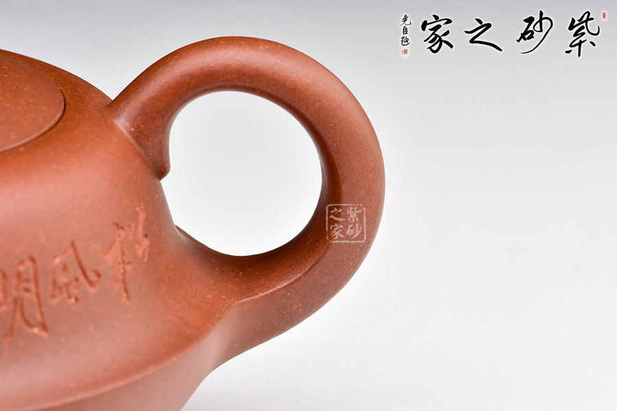此壺圓潤扁實(shí),壺身有兩段結(jié)成,上斂下豐。壓蓋設(shè)計(jì)嚴(yán)絲合縫,加一寶珠壺鈕,壺把、一彎壺嘴與壺身過度的非常自然、漂亮,使整個(gè)器形愈加經(jīng)典耐看。作品構(gòu)思巧妙、瀟灑自如,形成一套獨(dú)特的工藝和風(fēng)格。