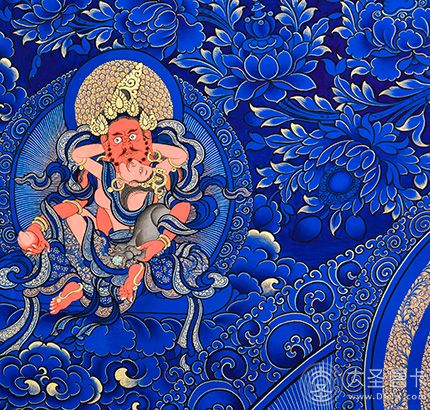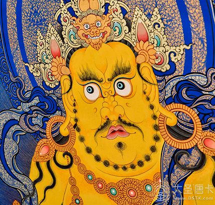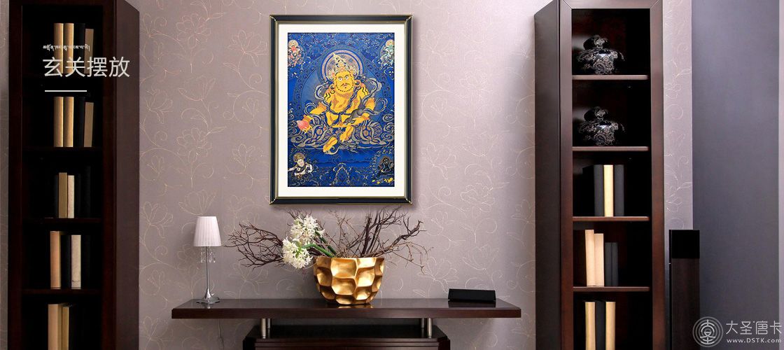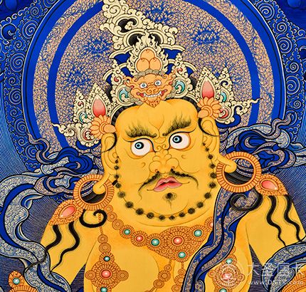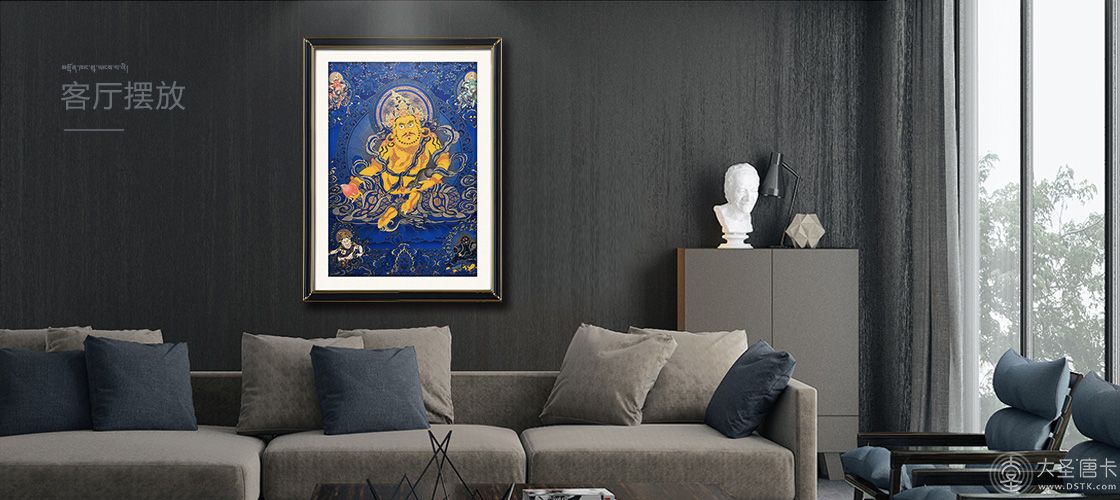 產地:熱貢 工藝:藍唐 創作年份:2021 題材:黃財神 繪制時間:5月 尺寸:*65*90cm 裝裱: 材質:織面 使用場地:茶樓