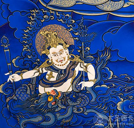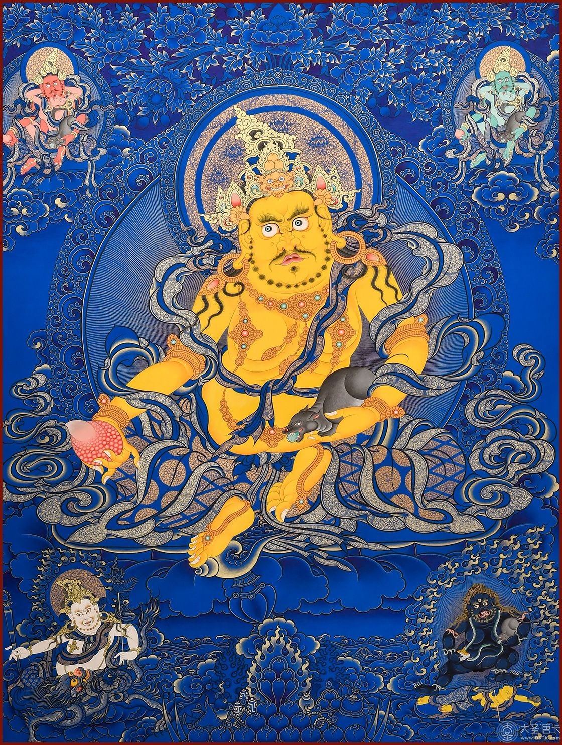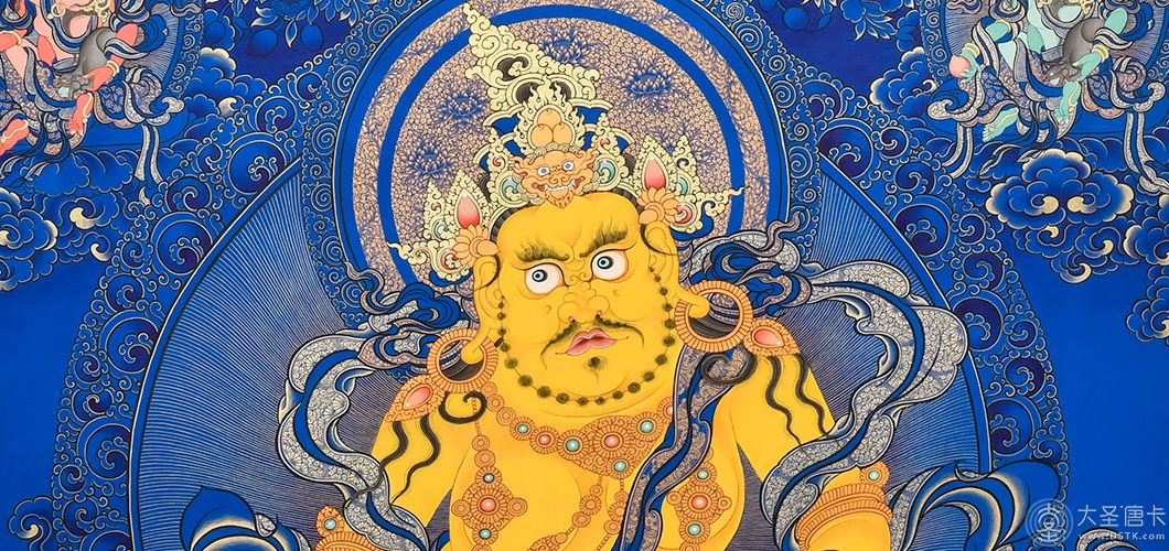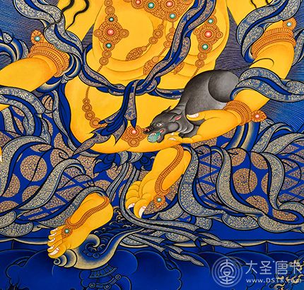 黃財神,是密教之護法神祇,諸財神之首,黃財神為藏地各大教派奉持的五色財神之一,右手持摩尼寶,象征寶光普照十方,增添眾生的福報;左手抱一只吐寶鼠,鼬的嘴里含著珠寶,象征財寶。右腳踏一只白色海螺,象征著他能入海取寶。