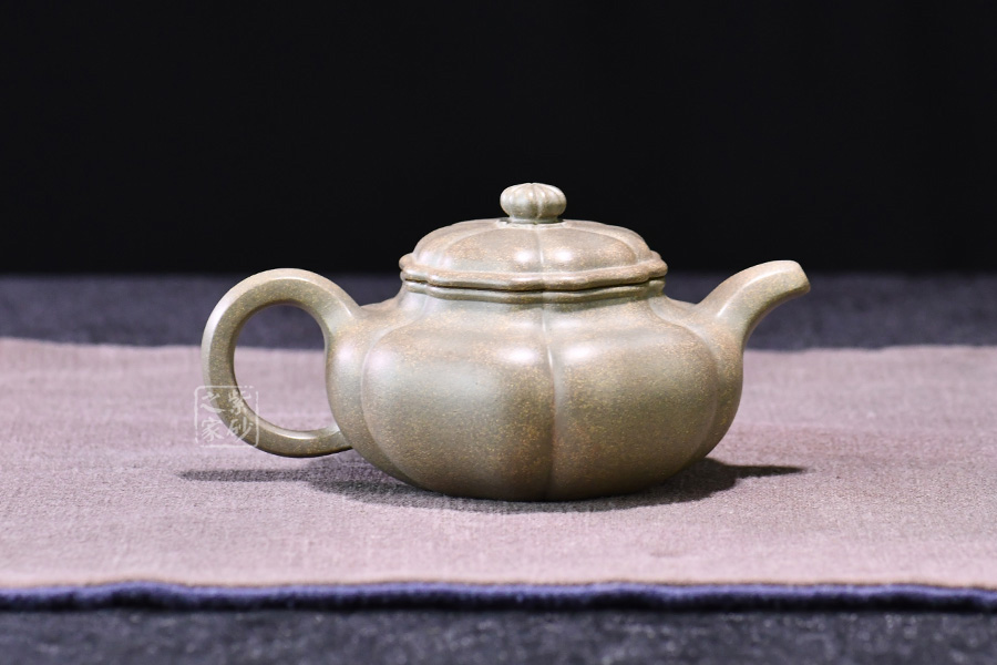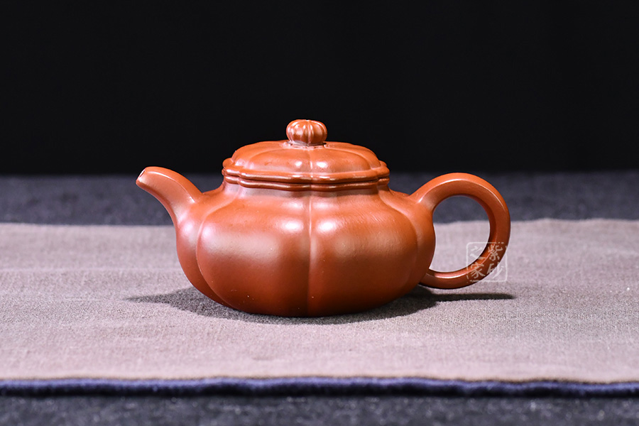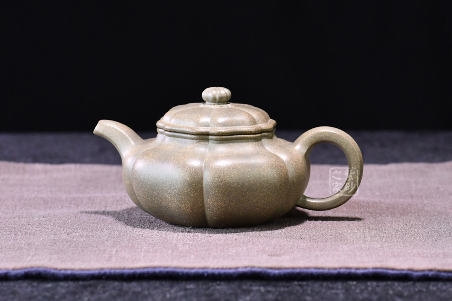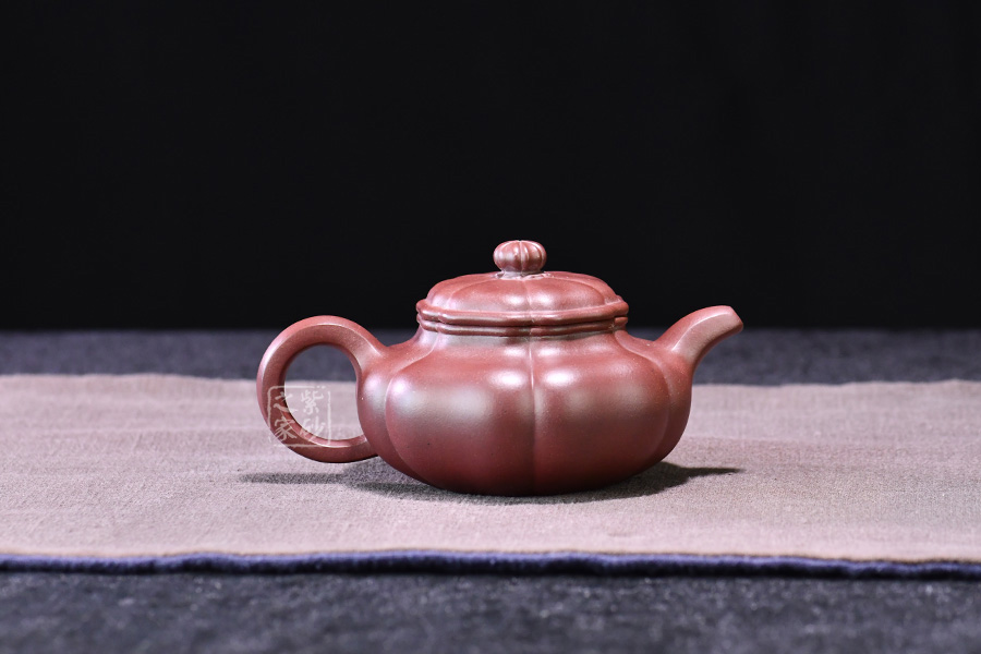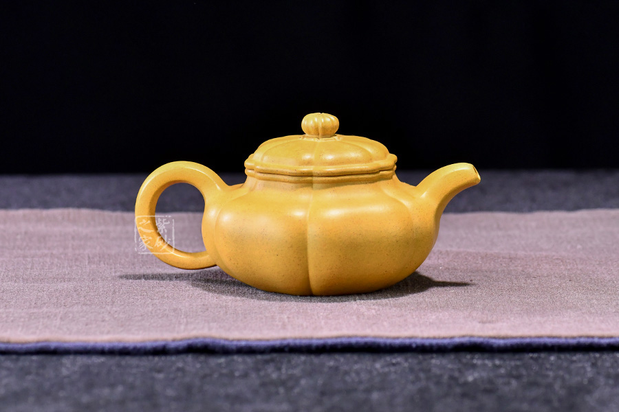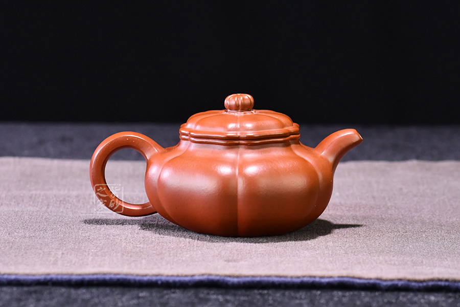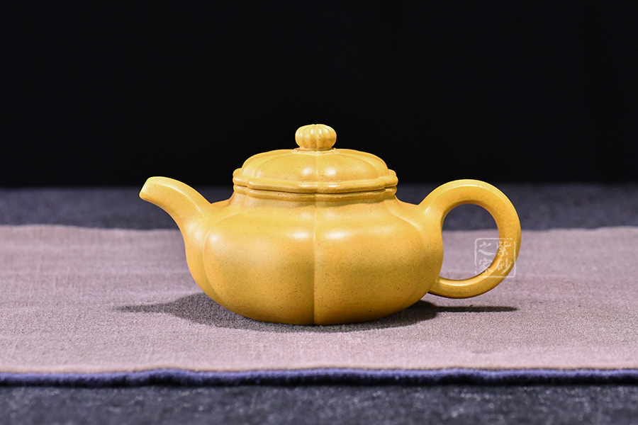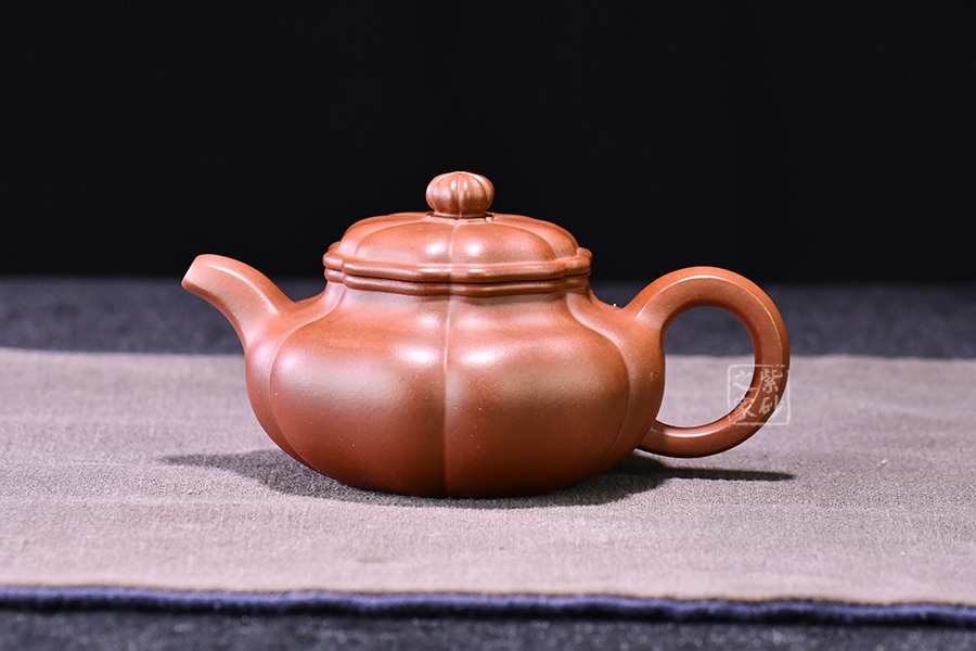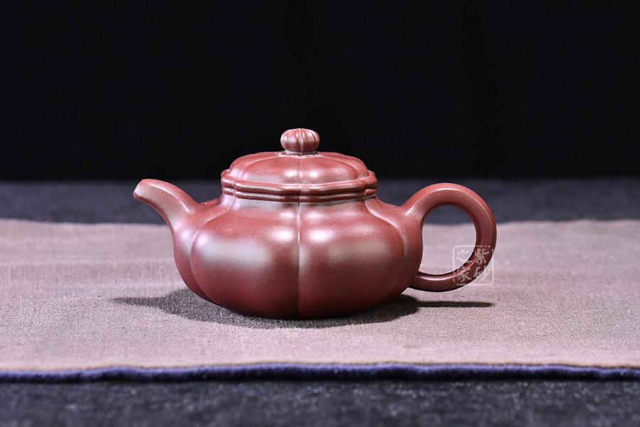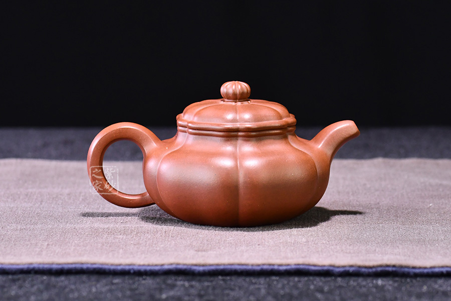壺器型為仿古壺,加之筋紋工藝,更顯古樸典雅。壺身略微扁圓形,肩頸襯托之下更覺壺身略扁,圓潤的壺鈕與壺身一致,應和之下韻味十足。而六條筋紋將整壺等分成6瓣,不差一毫,不失一里,拿捏有度,更見功底。一變嘴,耳形壺把隨身勢,線條流暢,比例得當,同時圓中見方,設計巧妙,力蘊十足。