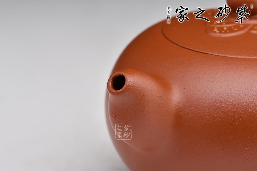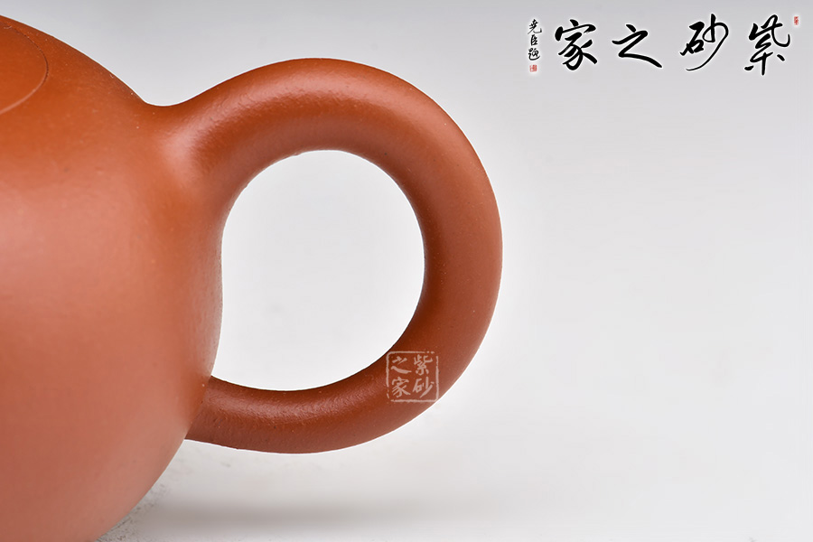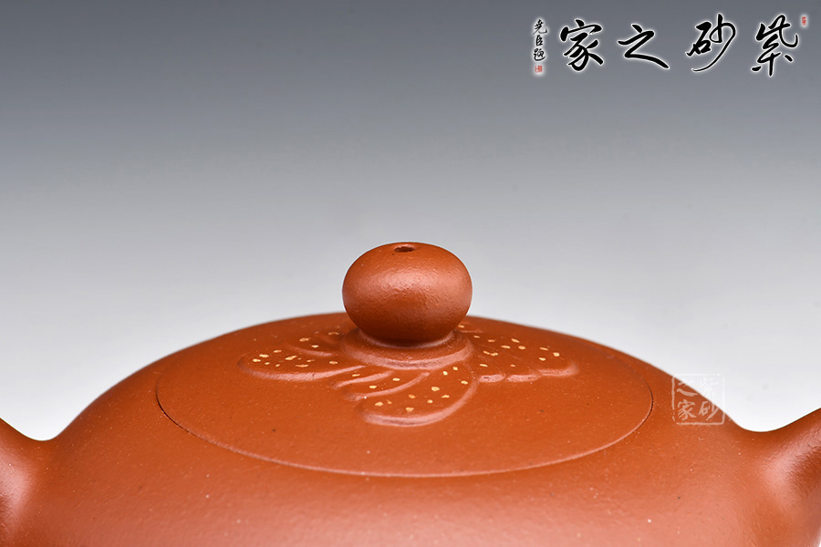 整壺采原礦紅泥制成,泥色溫潤古樸,瑩潤質(zhì)雅。以圓器為基礎(chǔ)形,壺身飽滿,壺腹微鼓,粗把、粗嘴,圓潤可愛,頗具道洪風(fēng)格。嵌蓋設(shè)計,與壺身融為一體,壺蓋點綴花蕊,精致非凡。此壺造型飽滿優(yōu)雅,氣韻充沛,值得入手。