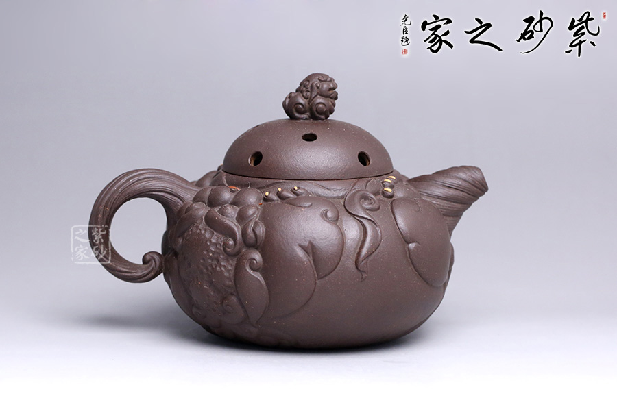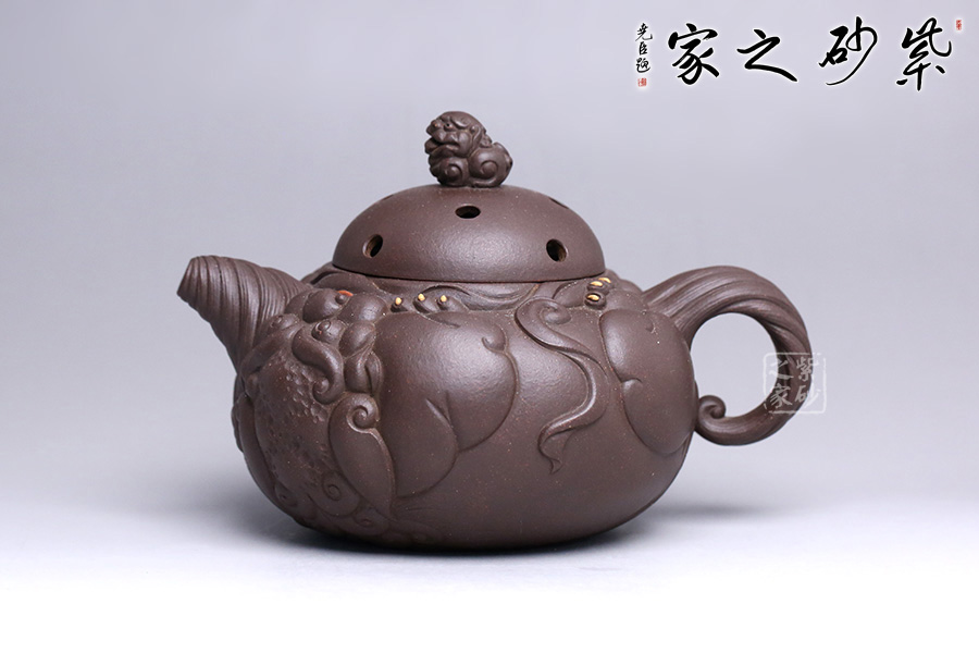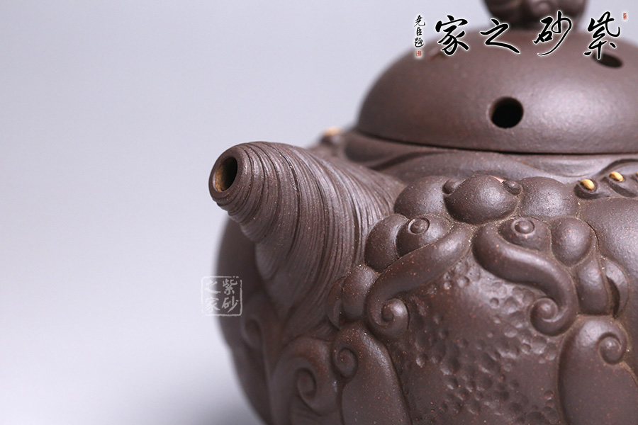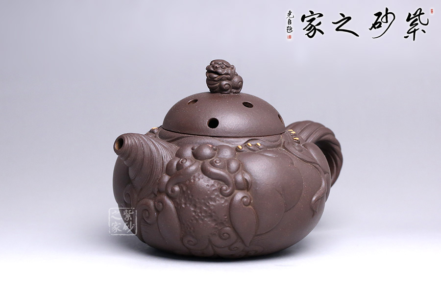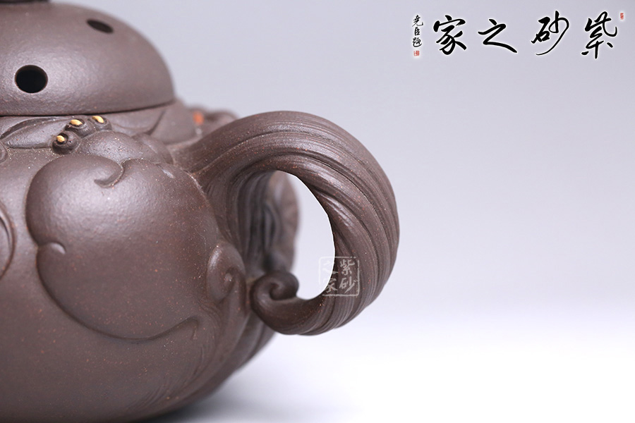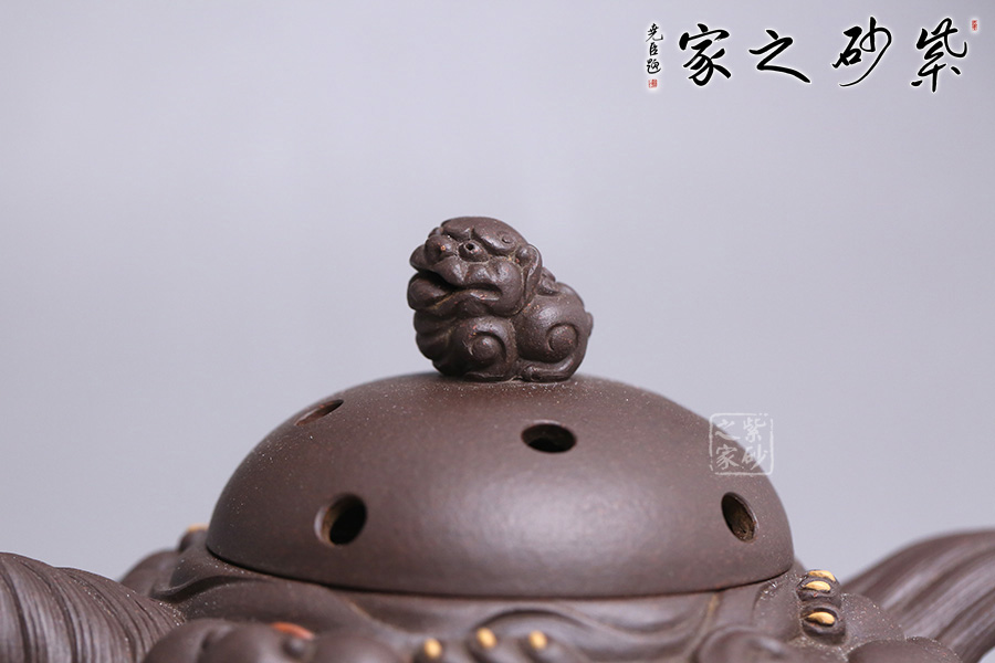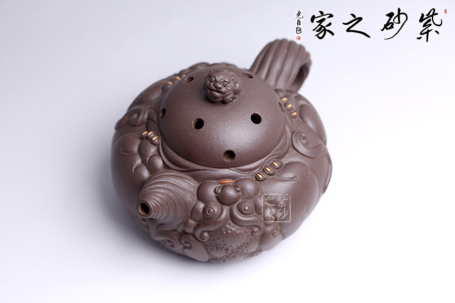 此壺是一個舞獅玩球的造型,壺身為獅子躺在祥云里,壺蓋為四爪抱住彩球,壺鈕是只小舞獅,惟妙惟肖,憨態(tài)可愛,鏤空樣式又仿佛香爐一般,茶香四溢。壺嘴和壺把皆是卷曲自然的獅毛旋轉(zhuǎn)而成,點題“獅”來運“轉(zhuǎn)”。