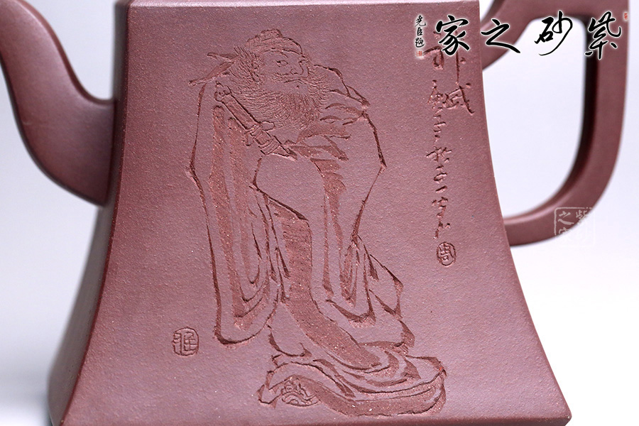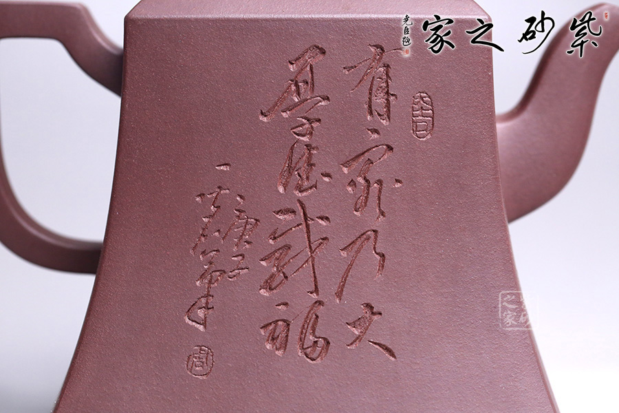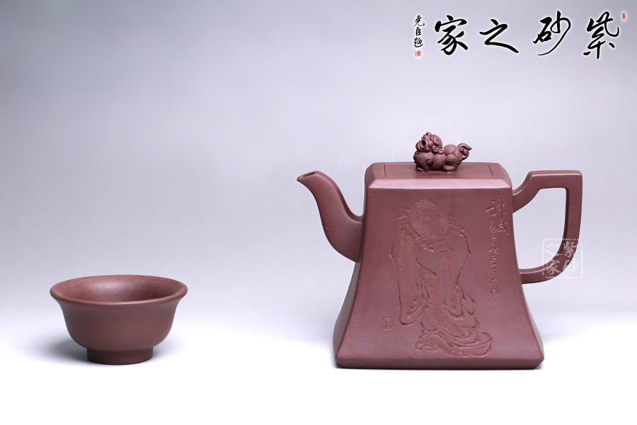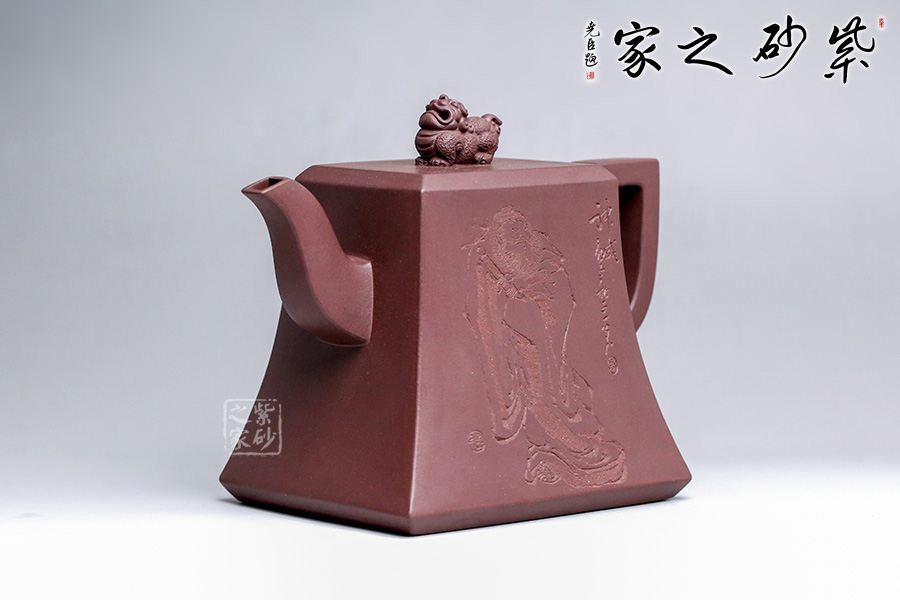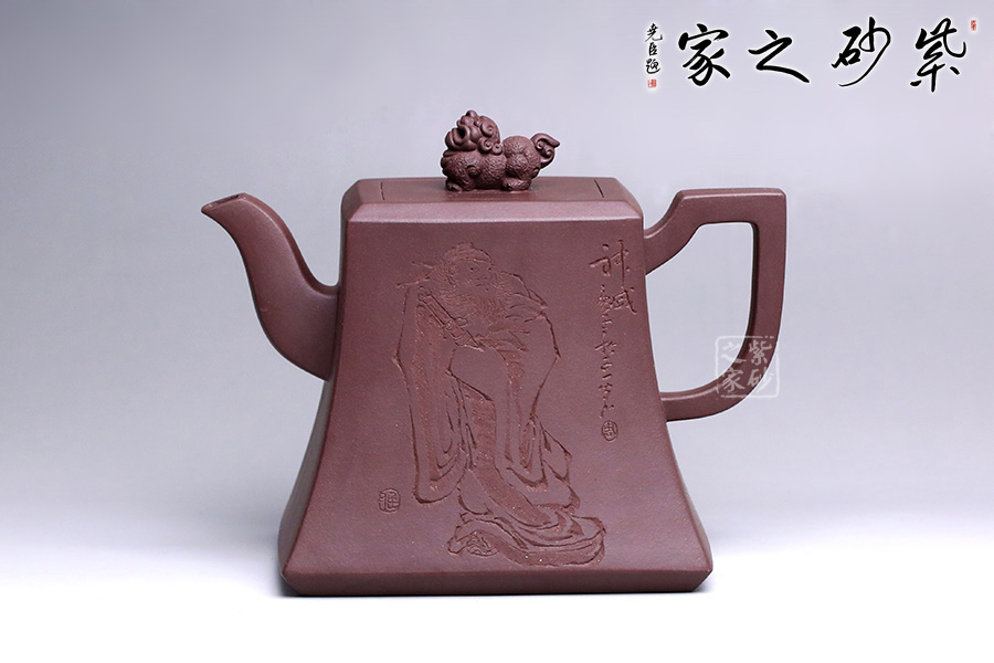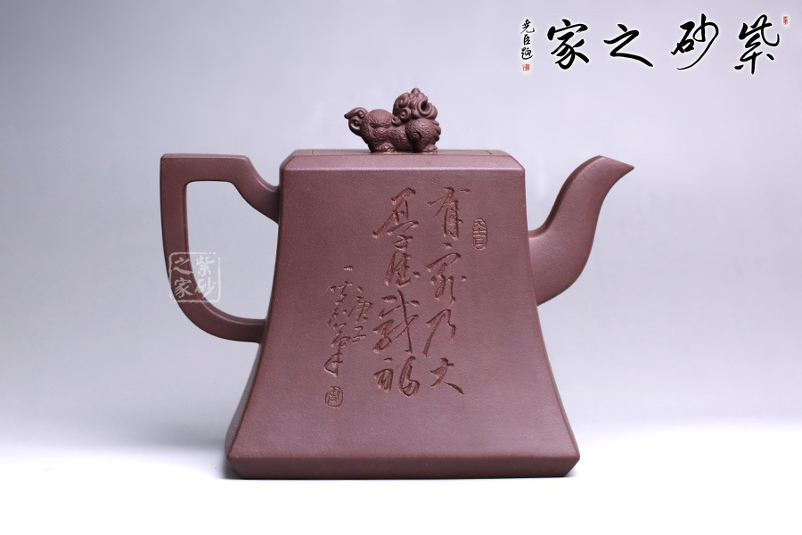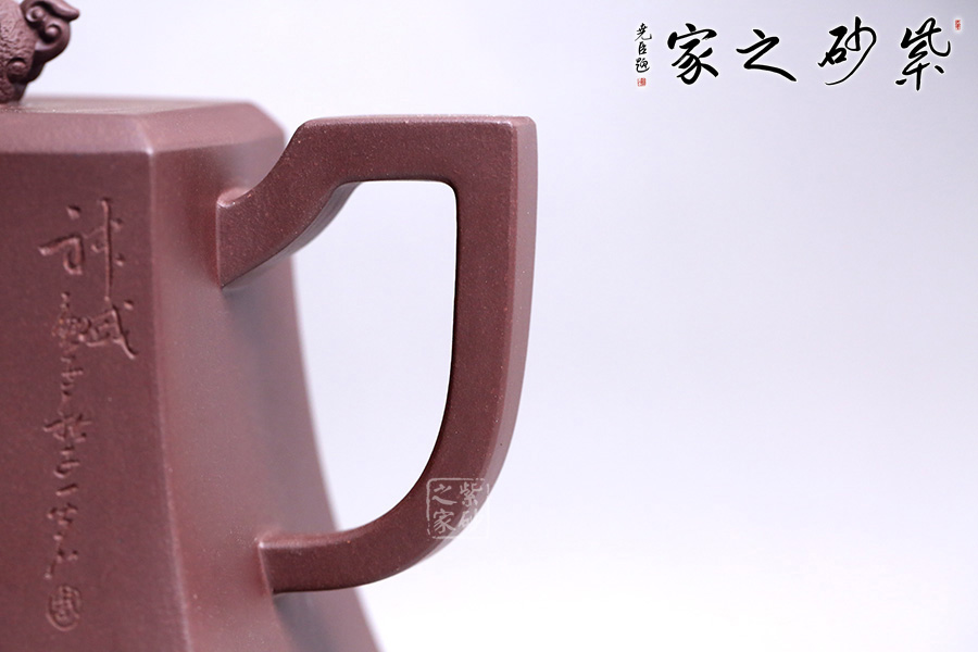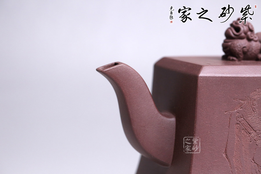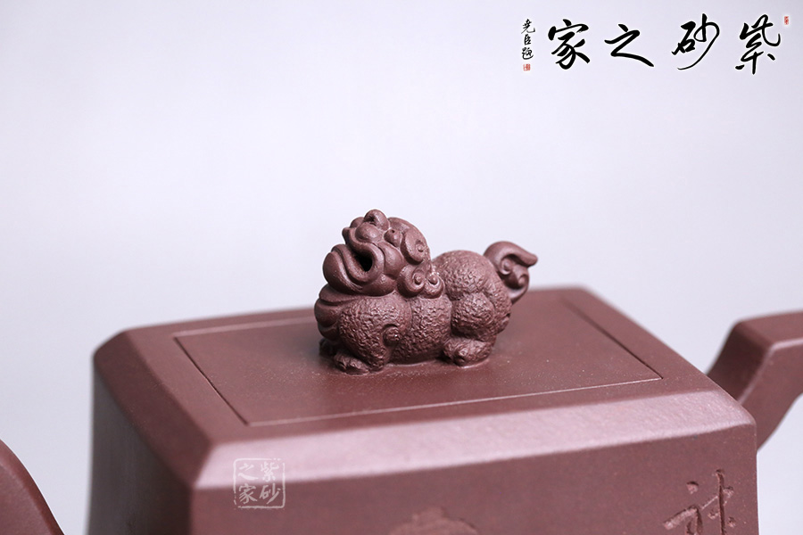 該壺精選老紫泥純手工打造,色澤質(zhì)樸內(nèi)斂,外形端莊沉穩(wěn),趣味悠然。壺身上小下大呈四方狀,有棱有角,修長穩(wěn)重,彰顯剛勁之美,更顯壺之沉厚。彎流壺嘴,彎中有方,曲中有直,大方得體。壺把線條有直有曲,拿捏平穩(wěn)又不失趣味。此壺點(diǎn)睛之筆貔貅壺鈕,寓意豐富,是轉(zhuǎn)禍為祥的吉瑞之獸。
