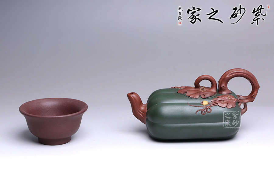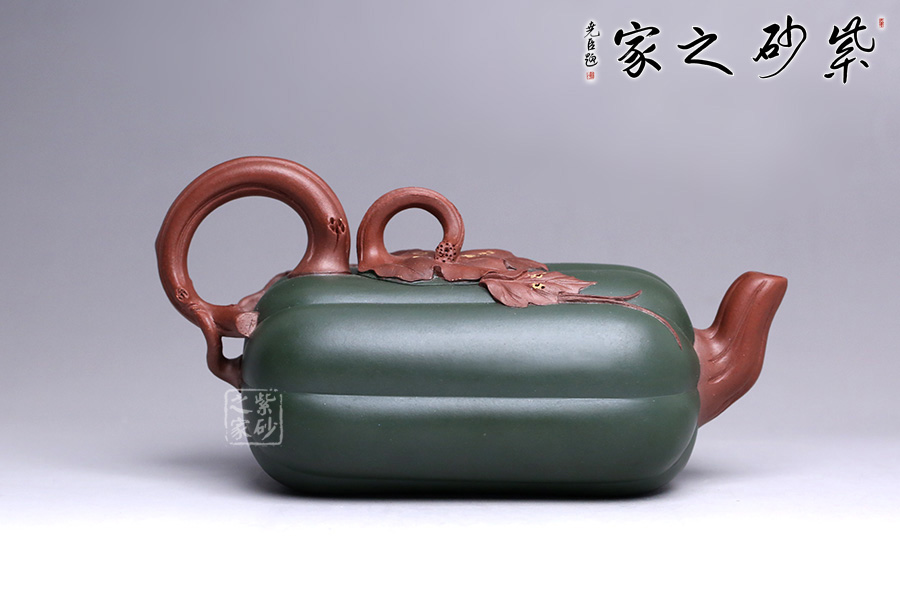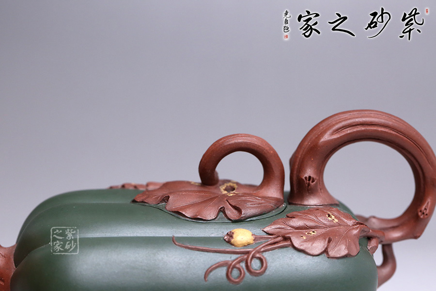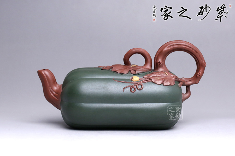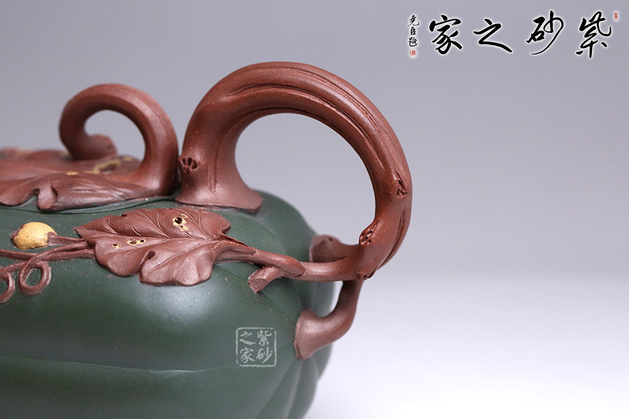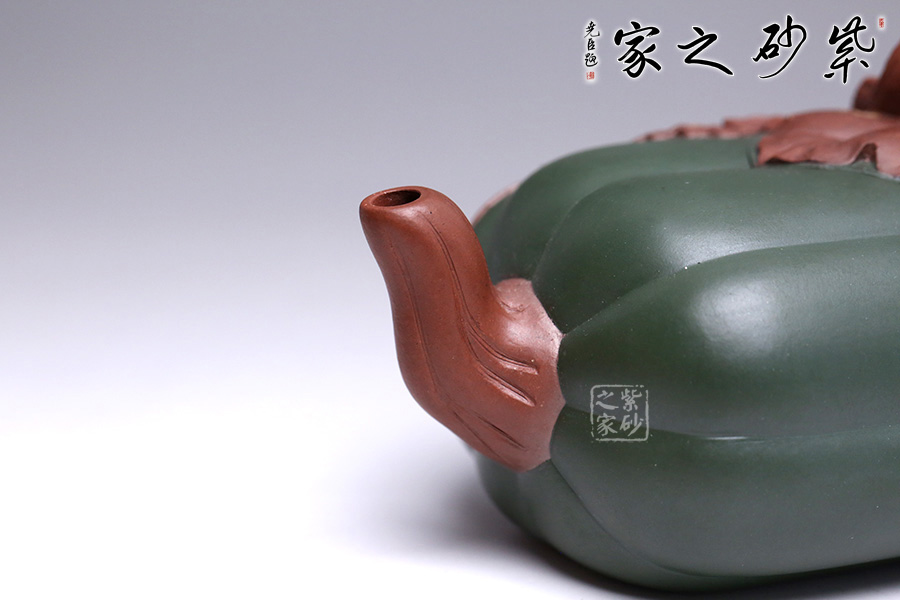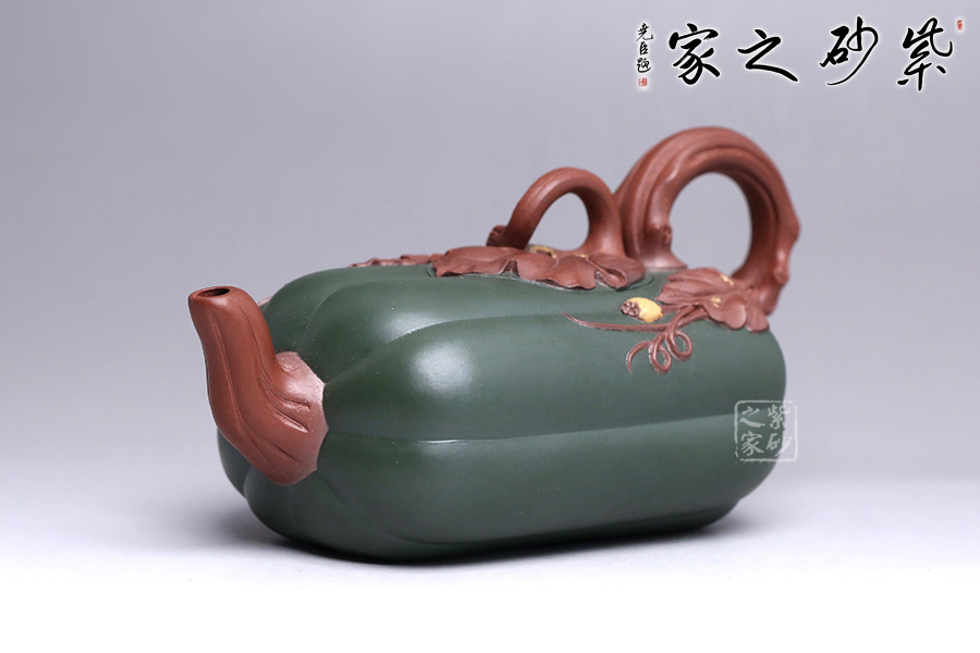 此壺似一只碩大的冬瓜,呈墨綠,瓜筋顯現(xiàn),夸張有度,形態(tài)逼真,充盈神韻。身低調(diào)內(nèi)斂,猶似熟透的瓜果,讓人有快速采摘拿去熬湯的沖動(dòng)。壺鈕和壺把皆以藤蔓為形,壺蓋則為瓜蒂裝飾,巧妙十足;壺嘴小巧可人、精致別致、創(chuàng)意極新;壺把處大方似耳穩(wěn)重,蒼老卻不失神氣;