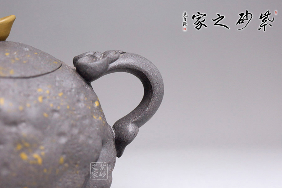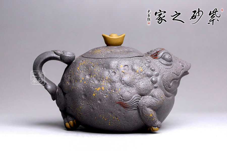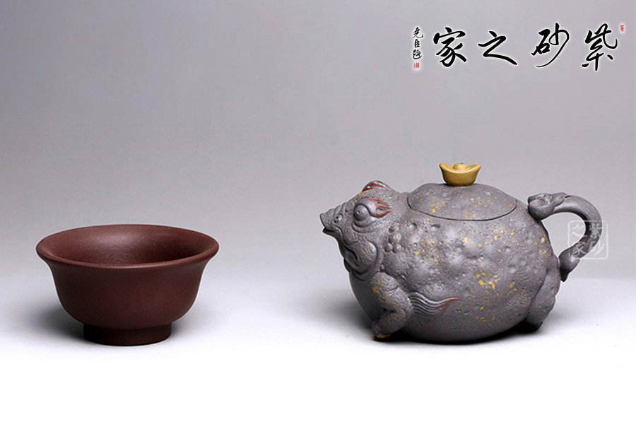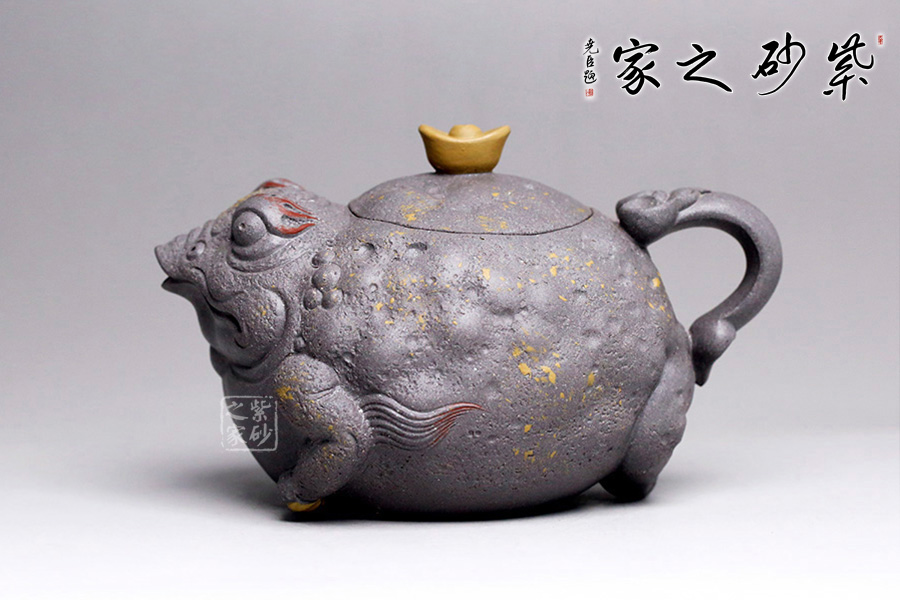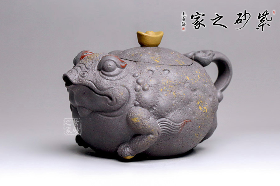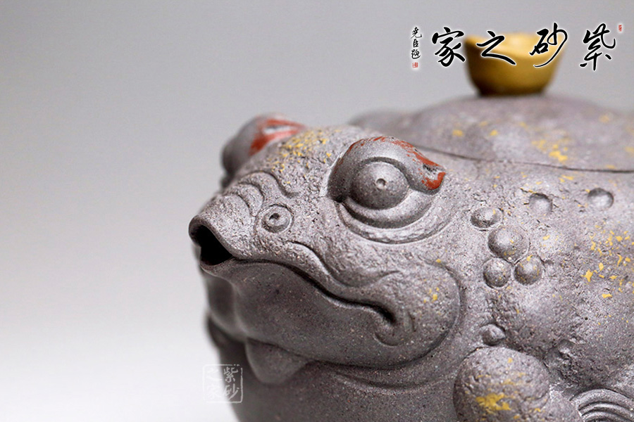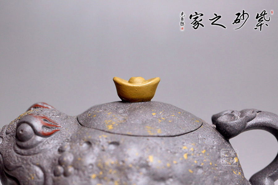 此壺極具藝術(shù)表現(xiàn)力,可與雕塑媲美的紫砂壺!金蟾為壺身,金元寶為壺鈕,彎曲的玉如意做壺把,栩栩如生,構(gòu)思精巧令人稱奇。