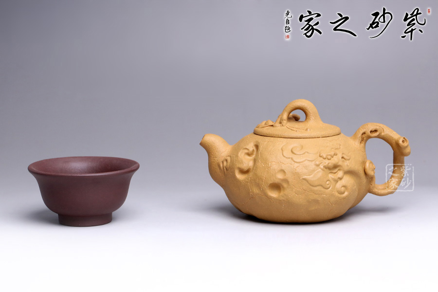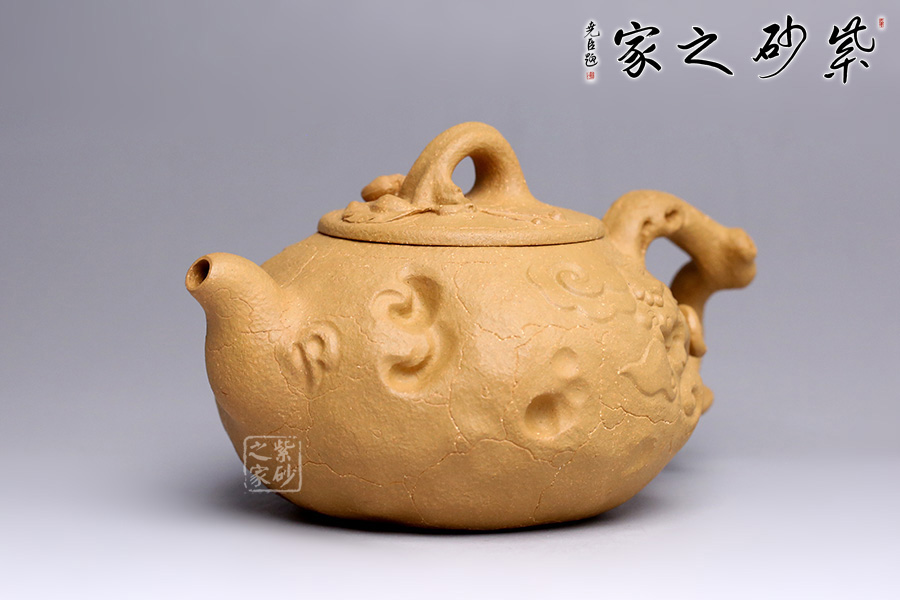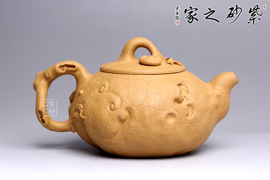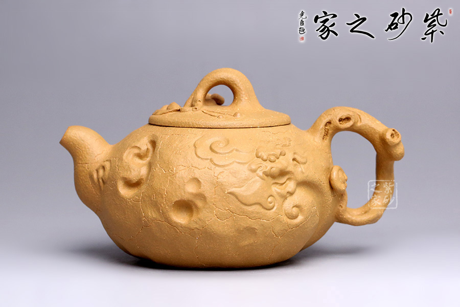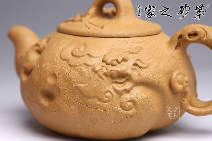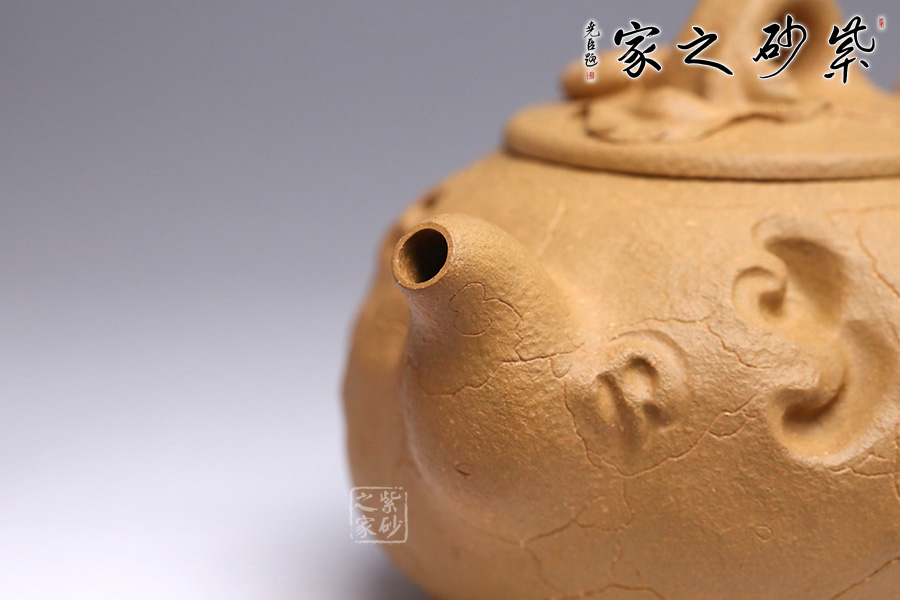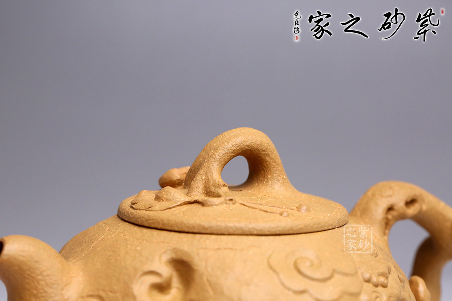 此壺是經(jīng)典供春壺的創(chuàng)新,玲瓏指嬌小靈活之意指物體精巧細(xì)致,壺把壺身接口處、壺蓋上都有一個玲瓏小巧的祥云,又似小元寶,寓意極佳。雖取名玲瓏,實(shí)際在壺身供春特有紋路中,還暗藏了一個噴吐祥云的“靈龍”。玲瓏也用來形容金屬、玉石等撞擊的聲音。壺蓋上兩個小巧的珍珠金石狀裝飾,也讓人在喝茶時仿佛聽到他們碰撞的美妙聲音。整器構(gòu)思精巧,賞玩皆宜!