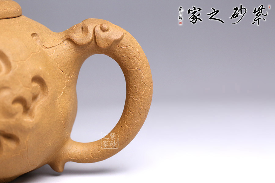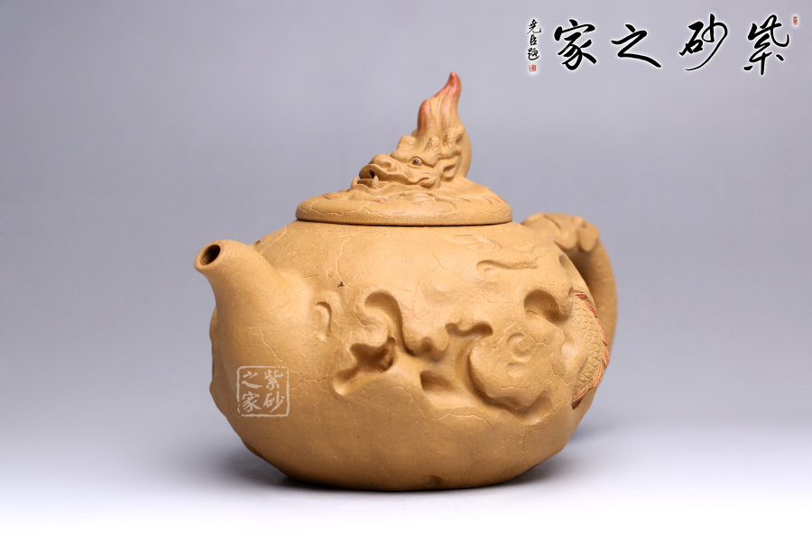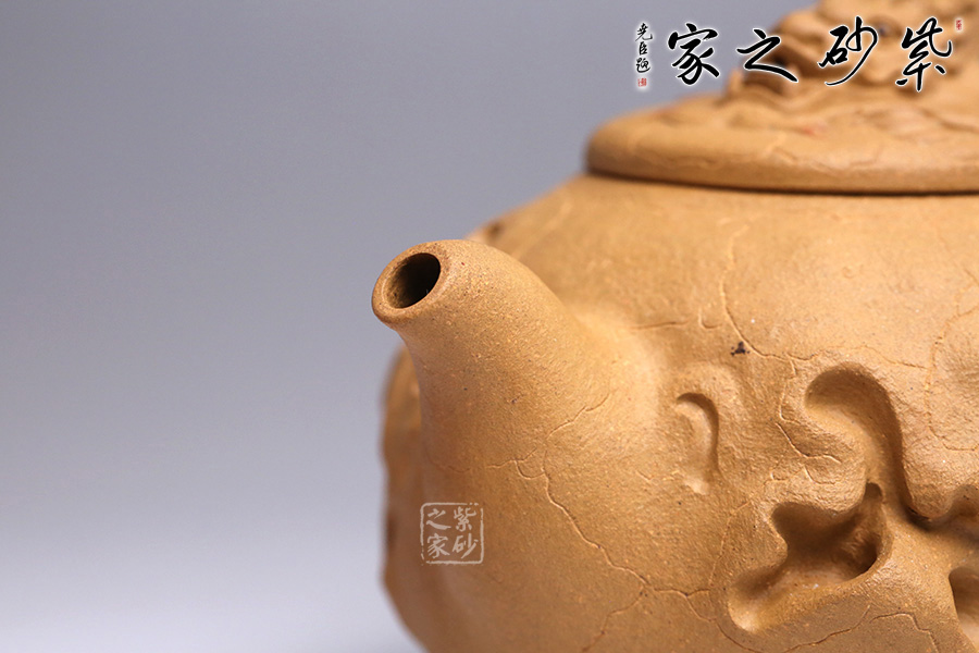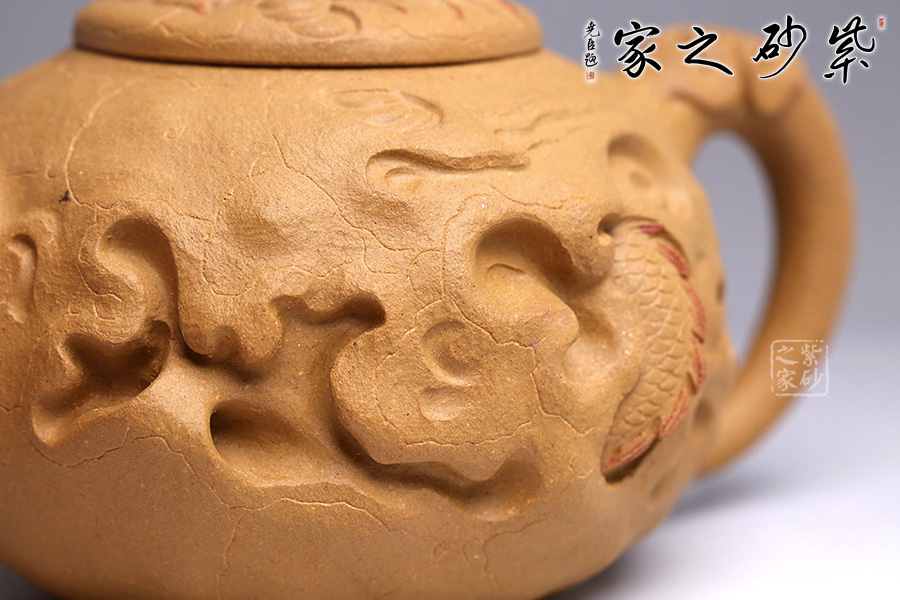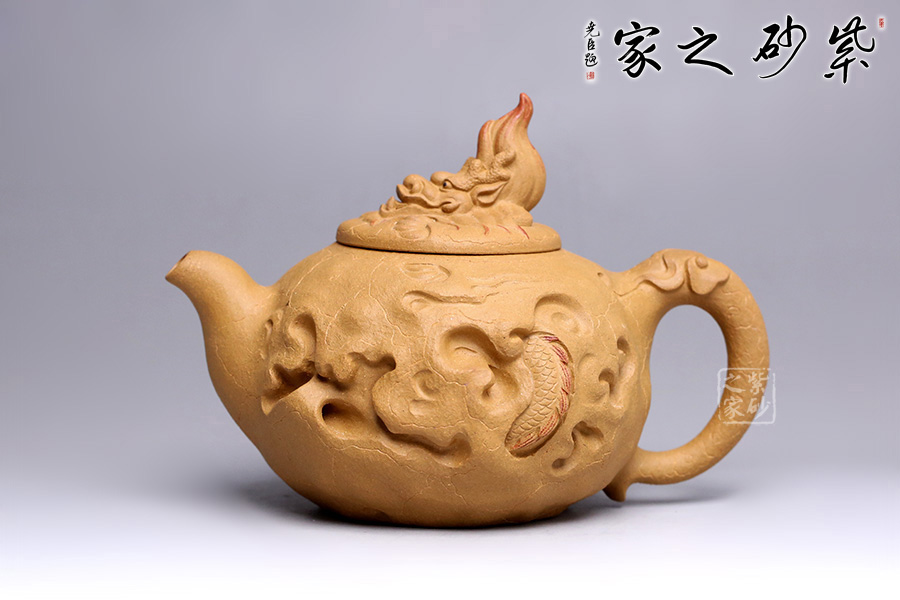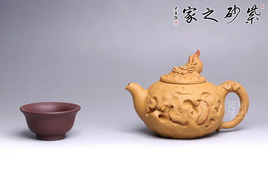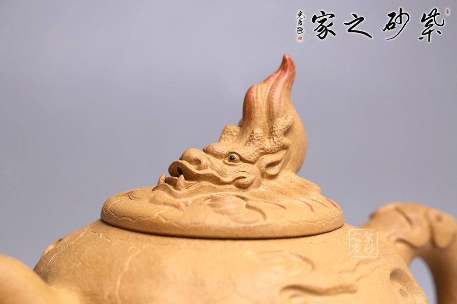 在傳統(tǒng)供春壺的器型上的創(chuàng)新,將龍元素融入壺中,供春壺的特有紋路化作云和閃電,浮雕龍身穿梭其中,壺鈕是龍頭探出云層,散發(fā)出一股無所畏懼的氣勢,寓意勇往直前、乘風(fēng)破浪,點題龍行天下。