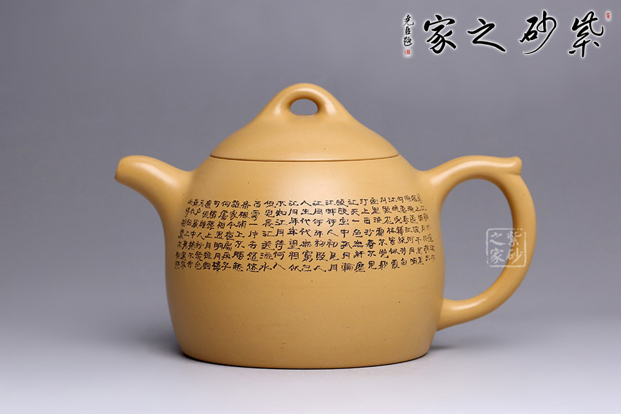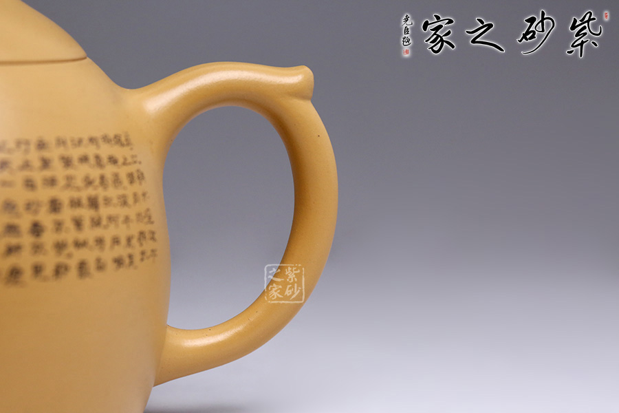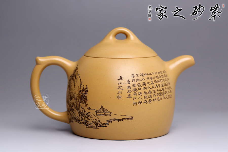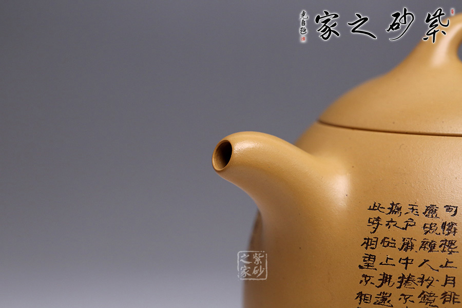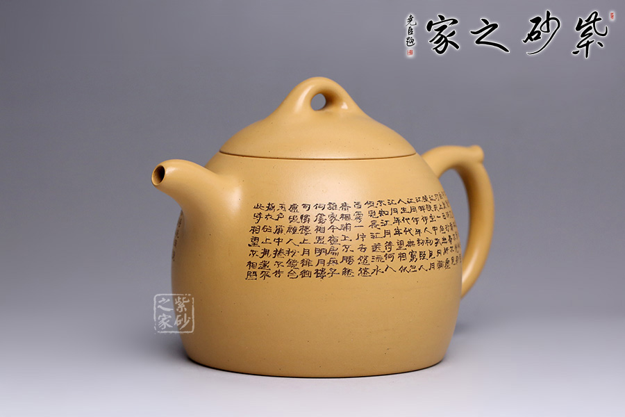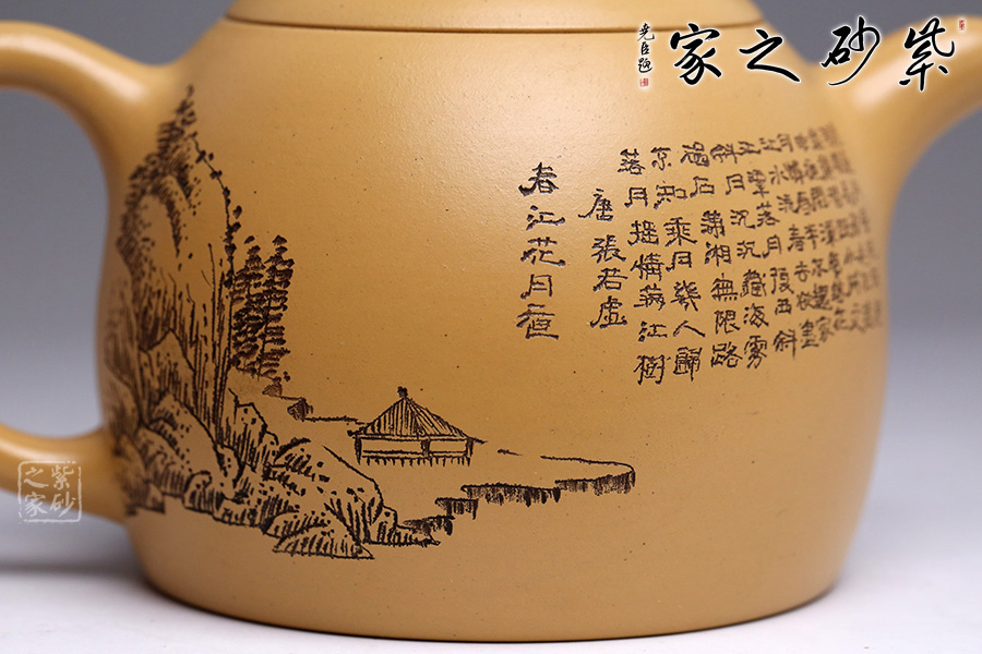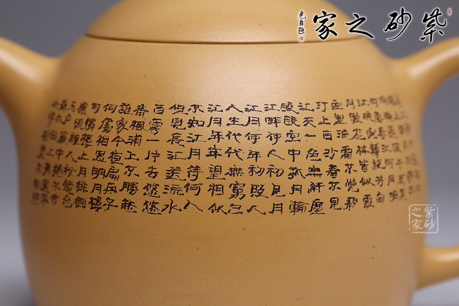 此壺名為秦權(quán)壺,仿秤砣形制,壺身高聳由下至上收斂,自然流暢;流短有勁,環(huán)耳形把手,不矯不揚(yáng);嵌蓋微鼓,亦另為截蓋制,沿與蓋品渾然一體;鈕似橋頂,壺形整體簡(jiǎn)練,古樸,大方,楊志仲之秦權(quán),借詩(shī)唱和,有古穆沉靜之感,更添了藝術(shù)的內(nèi)涵。壺身刻繪唐代詩(shī)人張若虛創(chuàng)作的七言長(zhǎng)篇歌行《春江花月夜》,配以江南山水美景,實(shí)在是美不勝收。
