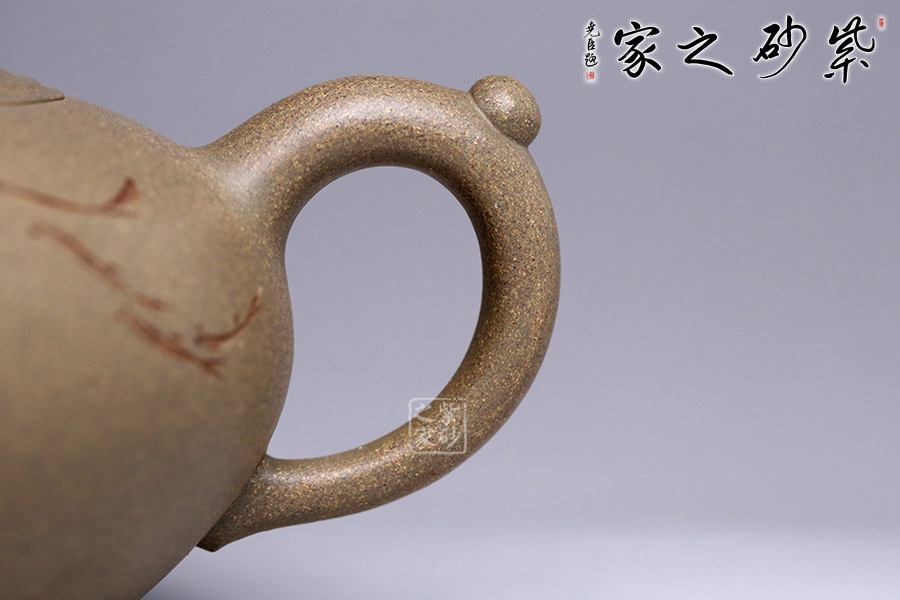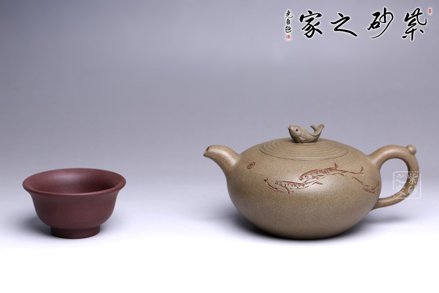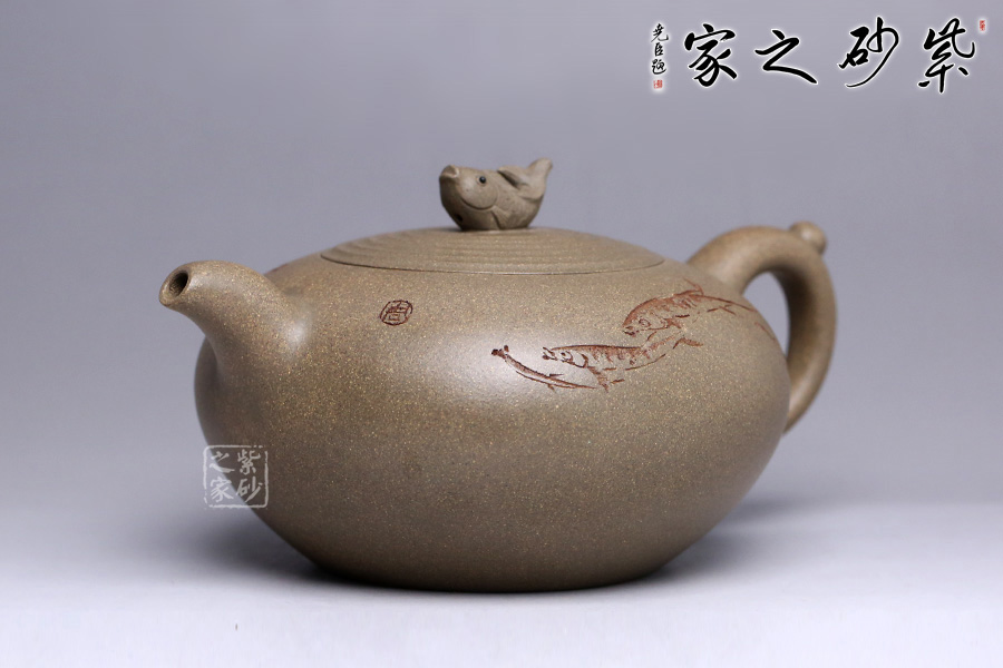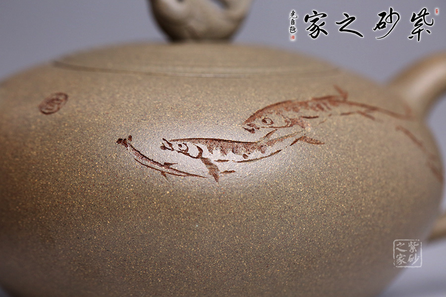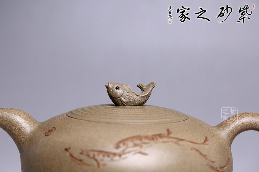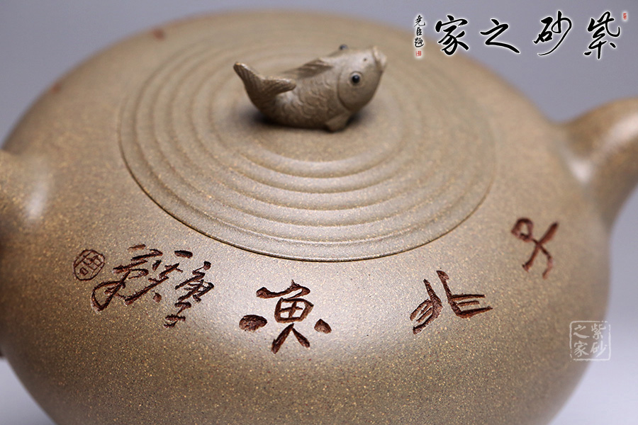 壺鈕以魚為形,栩栩如生,神態(tài)可愛,每一片鱗都清晰可見,魚尾飄逸。蓋面水波蕩起漣漪,壺身刻繪魚群在水中嬉戲之景,與壺身相配得宜,壺把一滴水珠造型,奇思妙想,自然融合,意識形態(tài)極高。