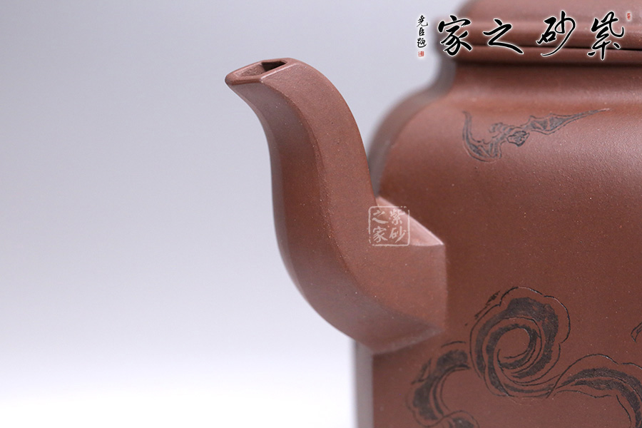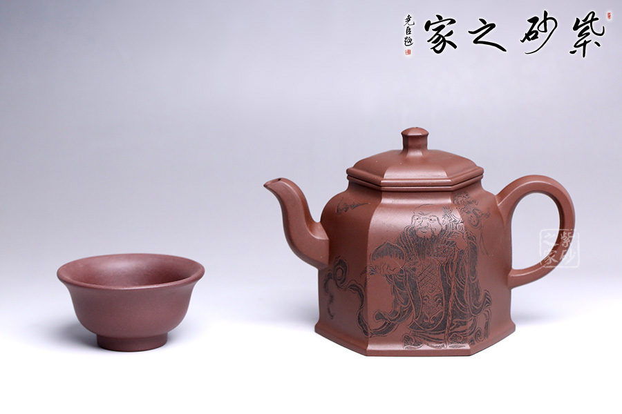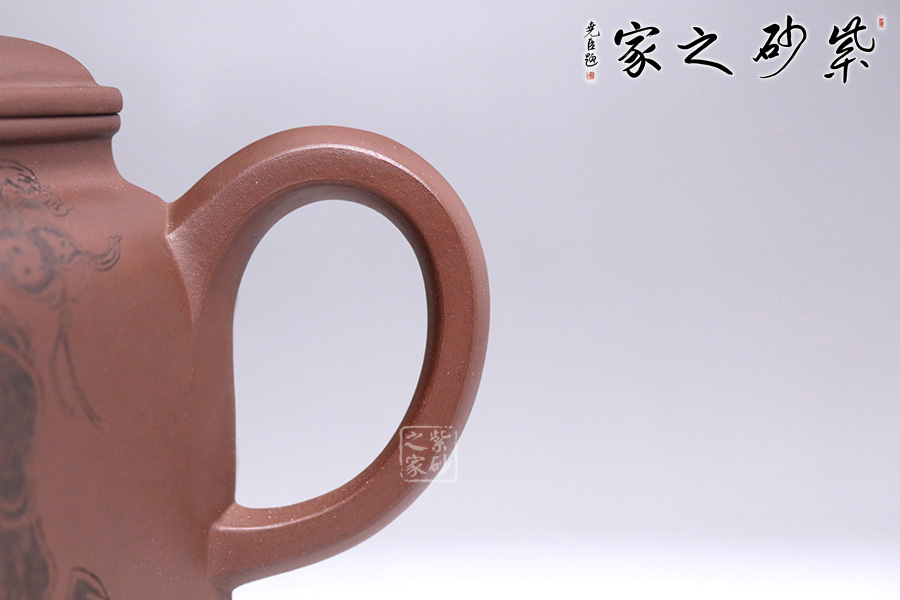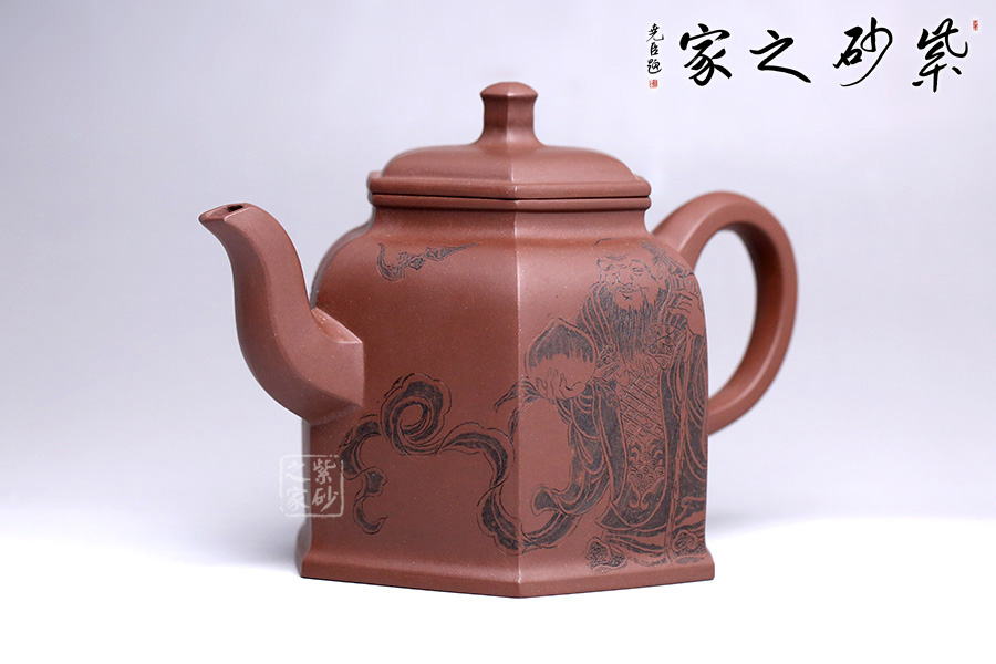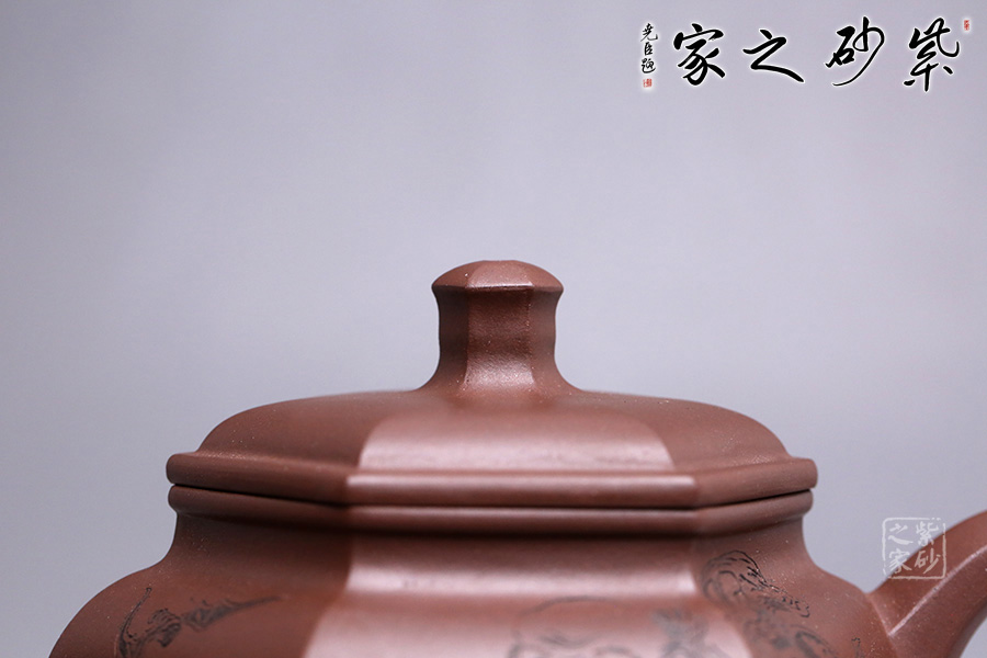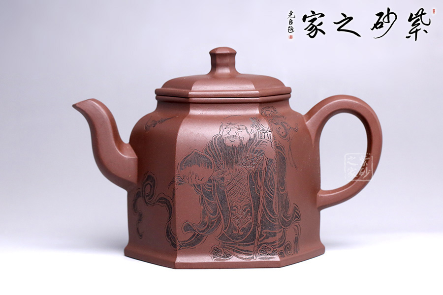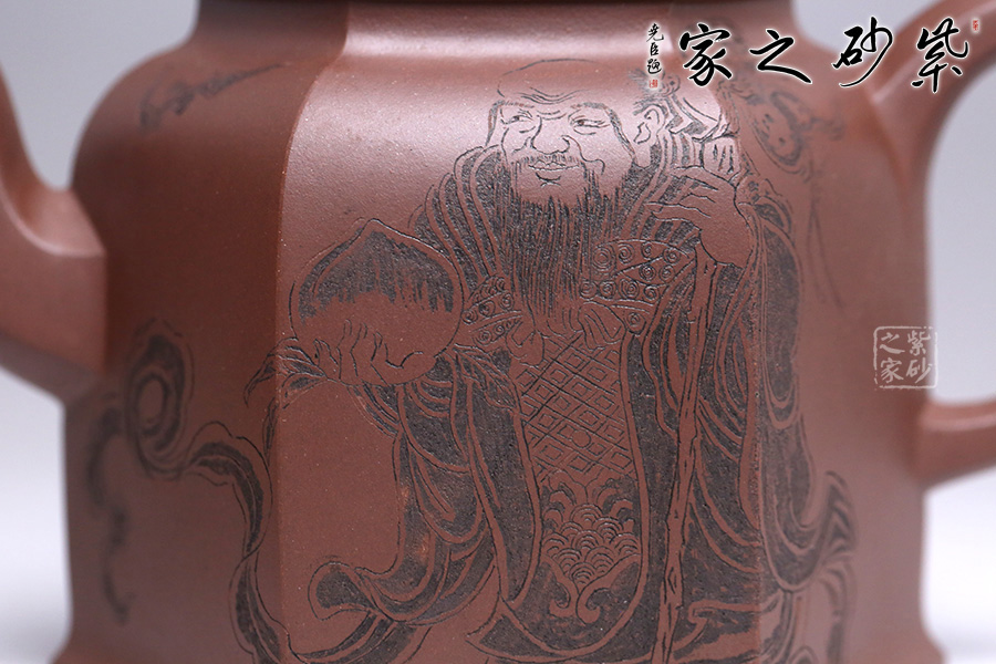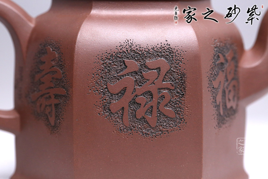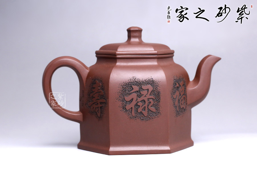 此壺為六方壺,棱角清晰,線面清爽,制作精細(xì),將方器的幾何之美塑造得十分的漂亮。壺身雕刻福祿壽,象征幸福、吉利、長(zhǎng)壽。三彎流順暢利落,耳形端把提捏稱手,壺蓋無(wú)論往哪個(gè)方向轉(zhuǎn)度皆可與壺身相對(duì)應(yīng)。