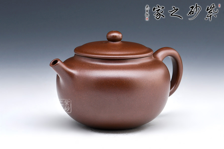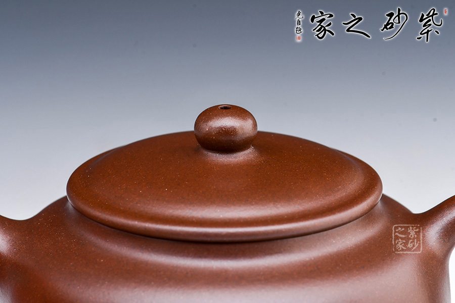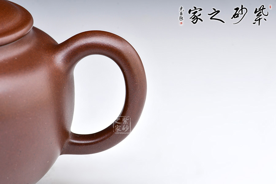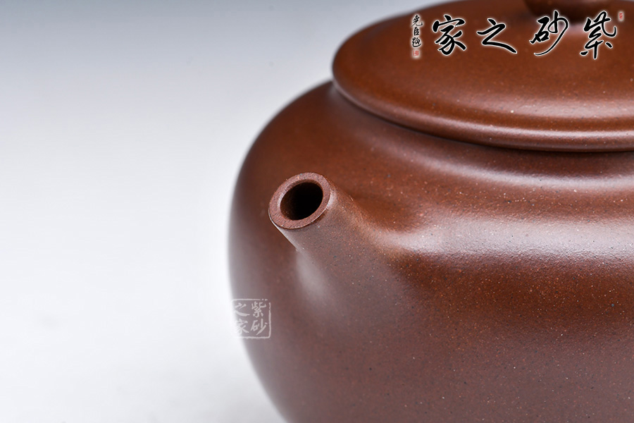 壺身圓潤,線條流暢,比例得當(dāng)。壓蓋平整,蓋上圓珠鈕亭亭玉立。壺嘴張力十足,出水流暢,斷水利落。