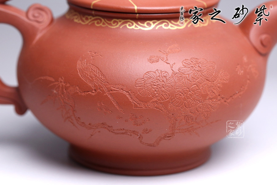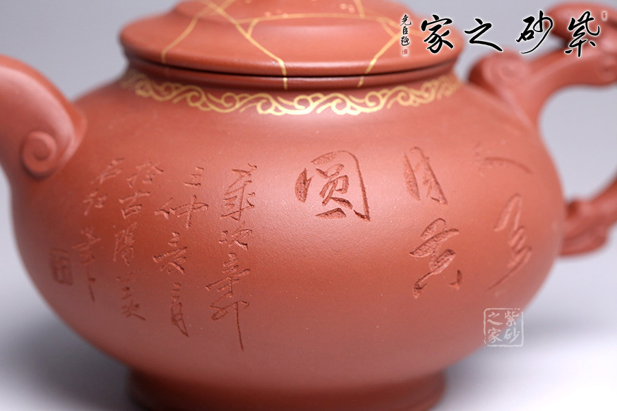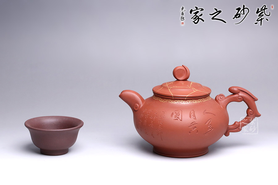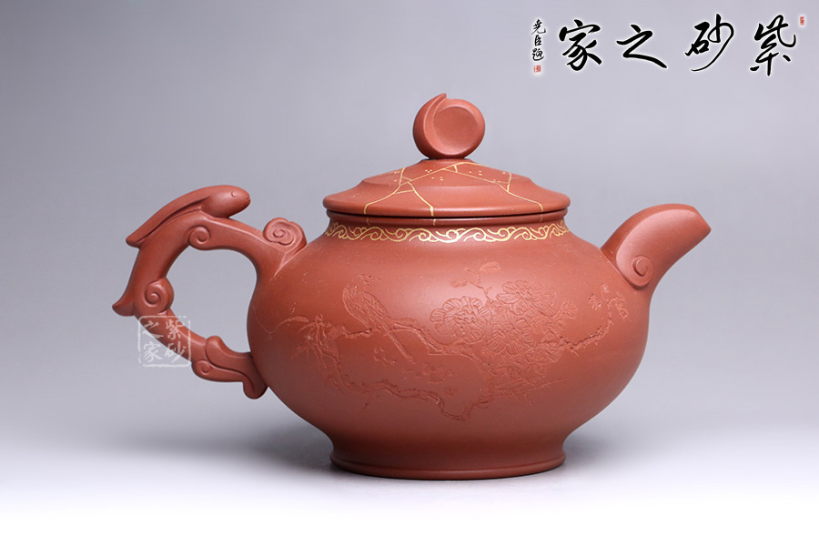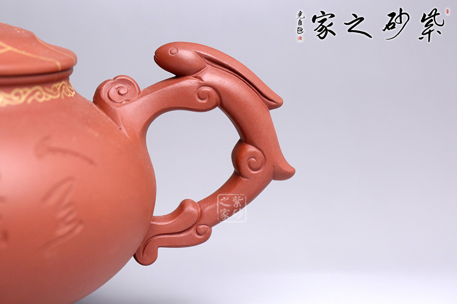 此壺造型新穎,逸美流連,溫和細(xì)膩,富有詩意。壺身圓潤,以弧度圈和的線條做到形制周正,浮雕精美。壺把玉兔造型,意為彩云追月,仙氣偏偏,起點睛之用。壺鈕別致,外形似圓月,蘊含團圓、美好的寓意。