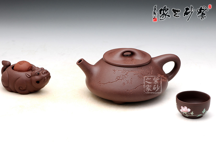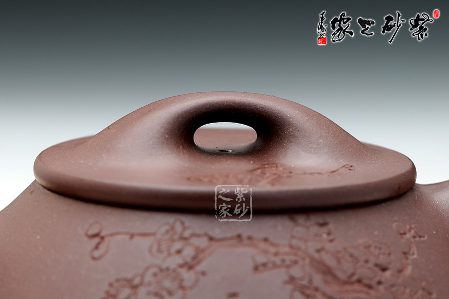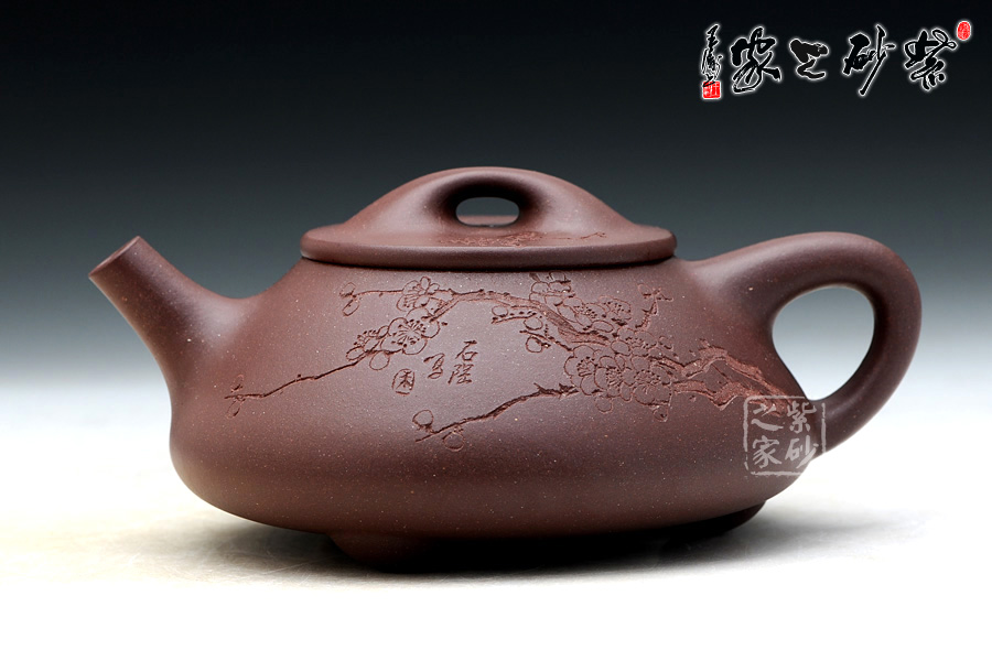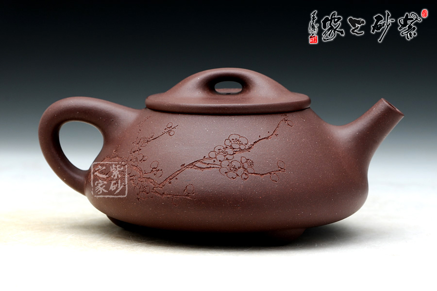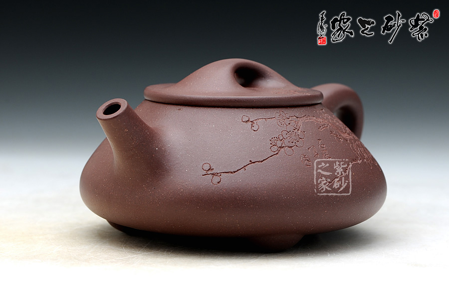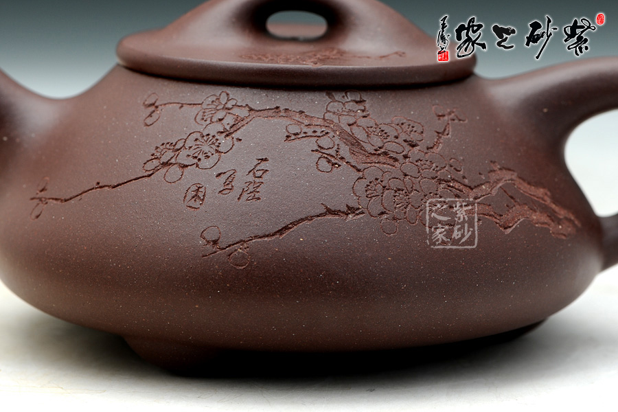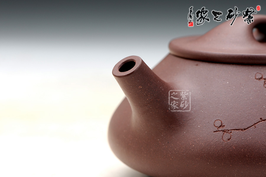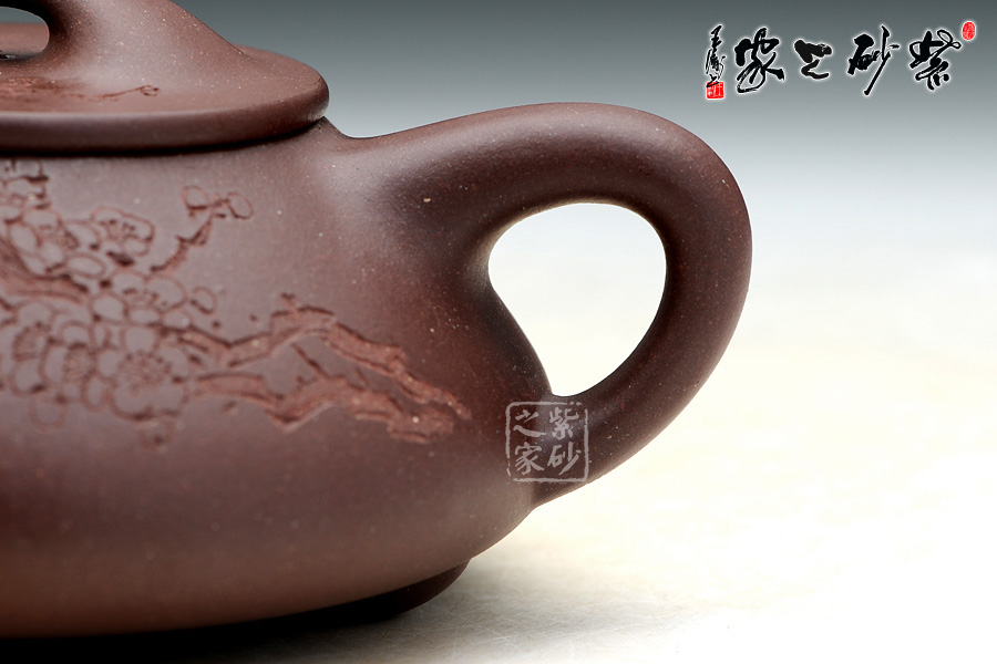石 瓢永不退不出潮流的器型之一,造型含蓋多種三角形,是一種形狀與平面的結(jié)合的美,整體壺型敦厚穩(wěn)實(shí),質(zhì)樸舒雅。壺鈕壓蓋極低,更見淳樸穩(wěn)重,壺嘴、壺身、 壺把比例協(xié)調(diào)。此壺壺身裝飾為素刻梅花,清逸高潔,寓意深刻。