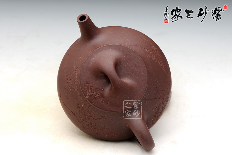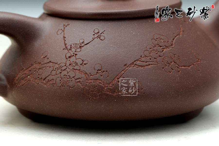 通體裝飾: 裝飾: 梅花 裝飾者:石陶(朱炳浩) 裝飾內(nèi)容: 此壺壺身由任淦庭老藝人的高徒朱炳浩(石陶)操刀裝飾,壺身通體篆刻的是梅花,疏瘦清雅,清逸高潔,寓意深刻。