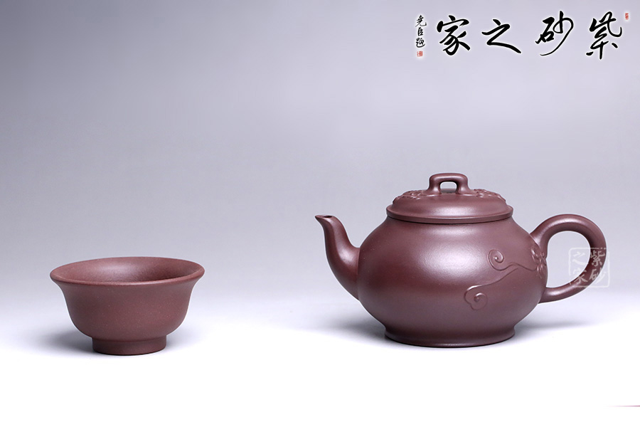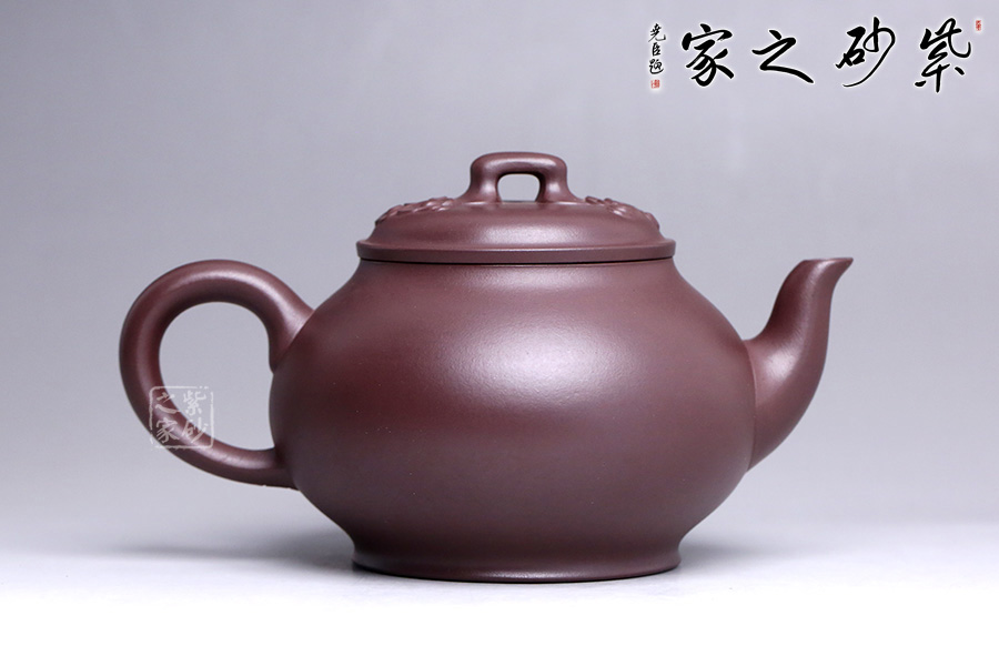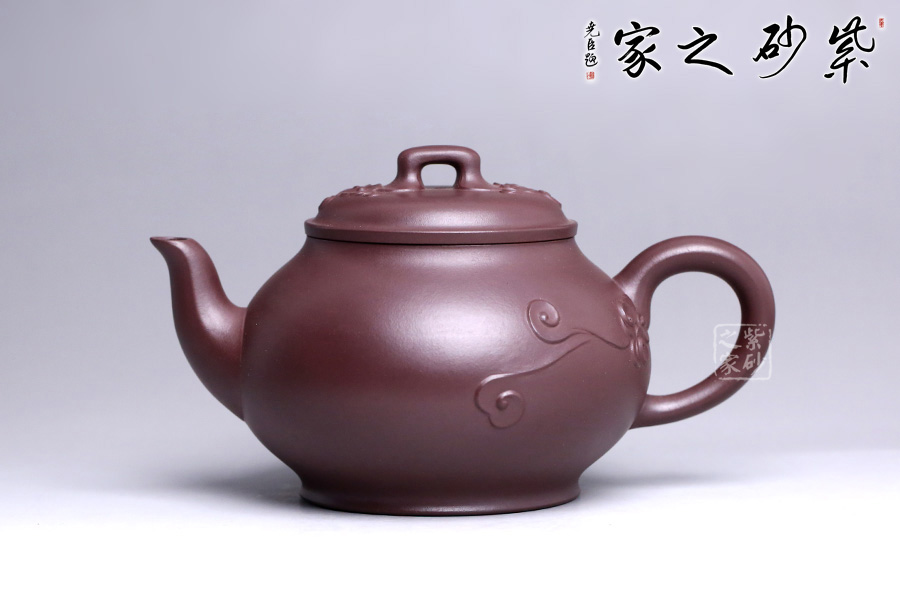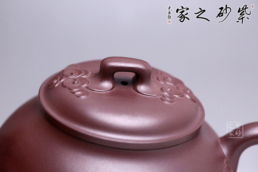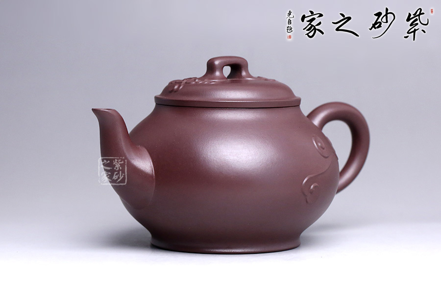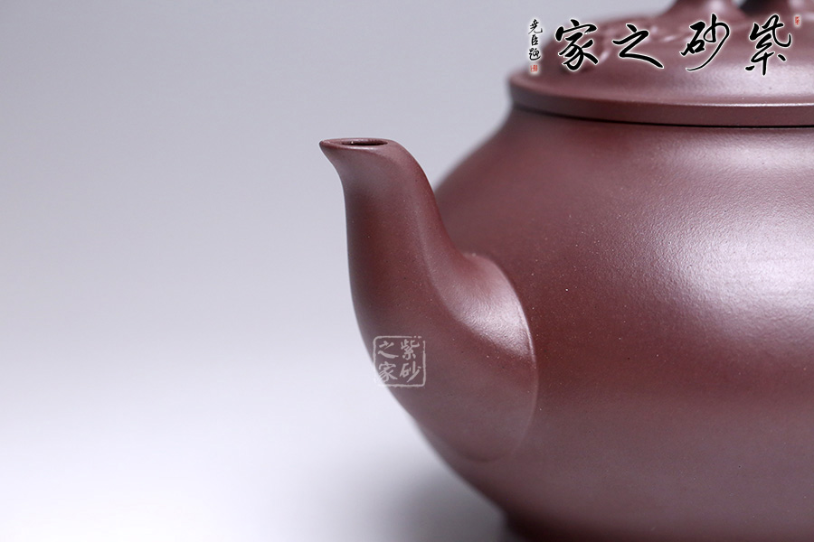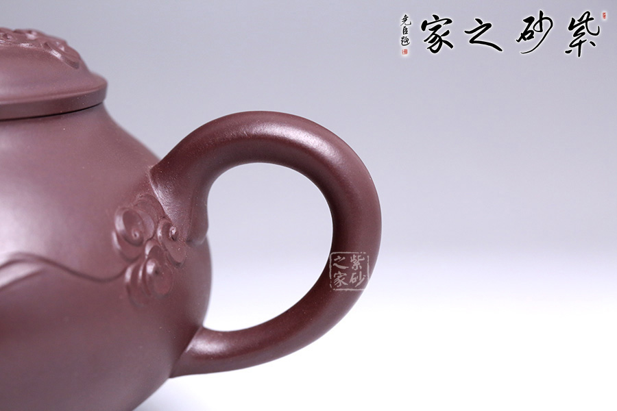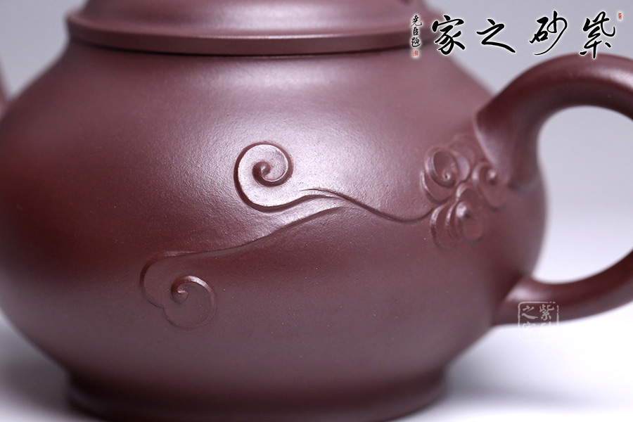 此壺圓滑飽滿,造型簡練有致。壺身比例恰當,曲線強勁有力,銜接處以如意紋飾裝點。圓圈把勻勢而起,整體骨肉亭勻,收展有度,有一氣呵成之暢。圓形壺鈕上兩個如意筋紋對稱而放,拱橋形鈕,矗立于壺蓋,提綱挈領(lǐng)一般,確立了壺的“身姿”。 整體結(jié)構(gòu)協(xié)調(diào)有致,飽滿的壺身,短而有力的直頸,平蓋極為嚴密,氣密性良好。