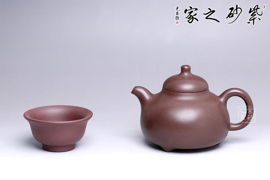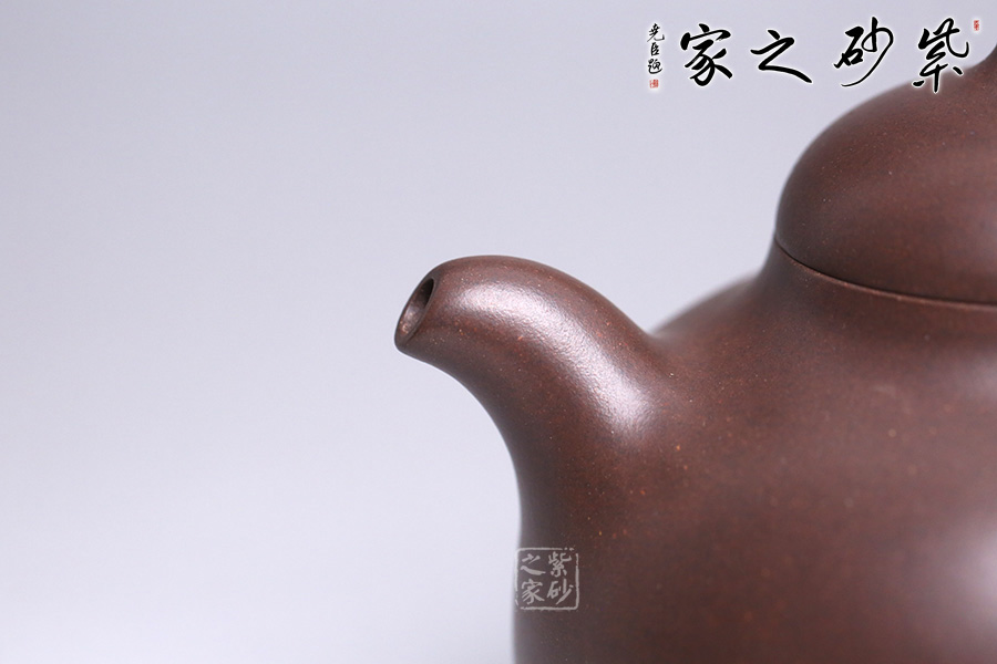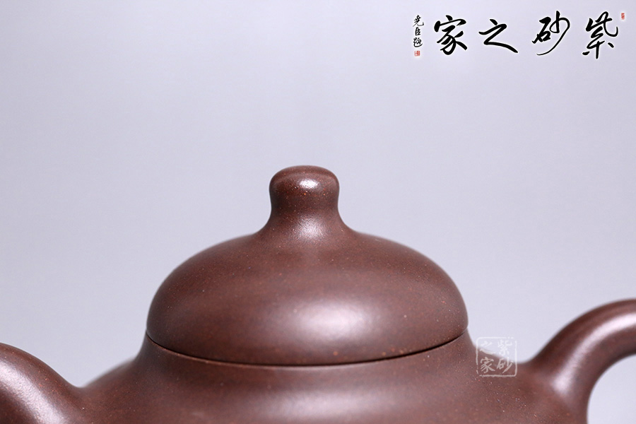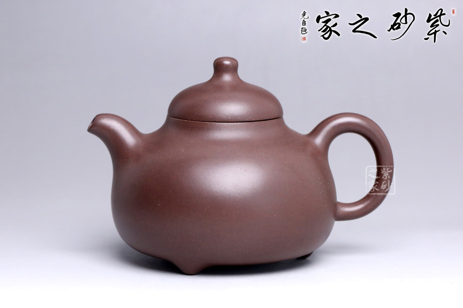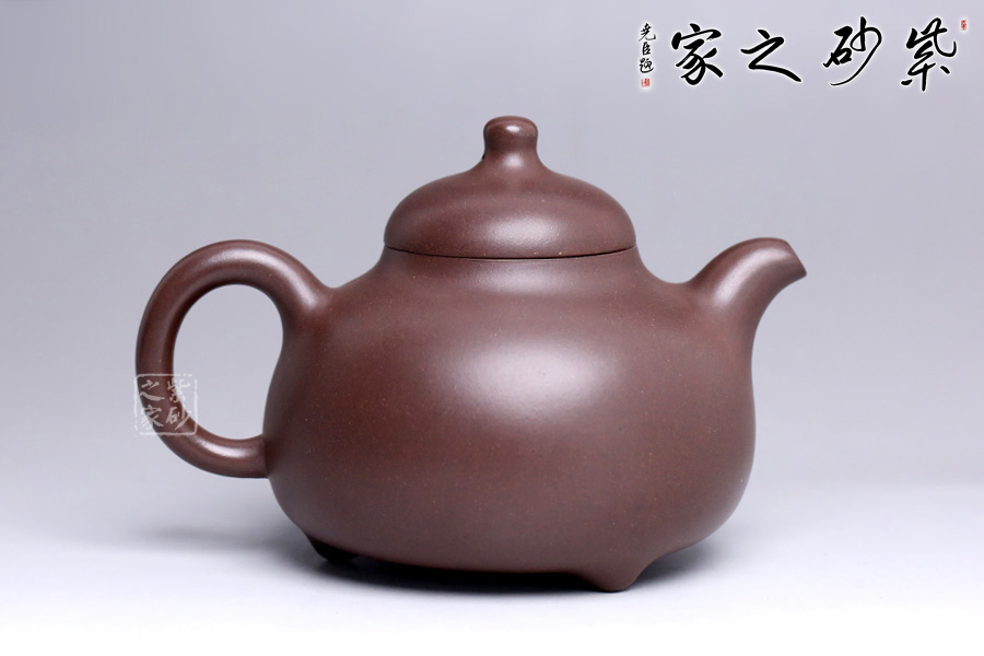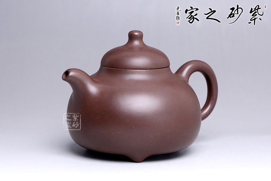 經(jīng)典壺式,壺體呈圓腹、下寬上收;短曲流、耳形柄;乳鼎鈕、三乳足。壺體清秀典雅,線條挺括流暢,色澤溫潤細膩。