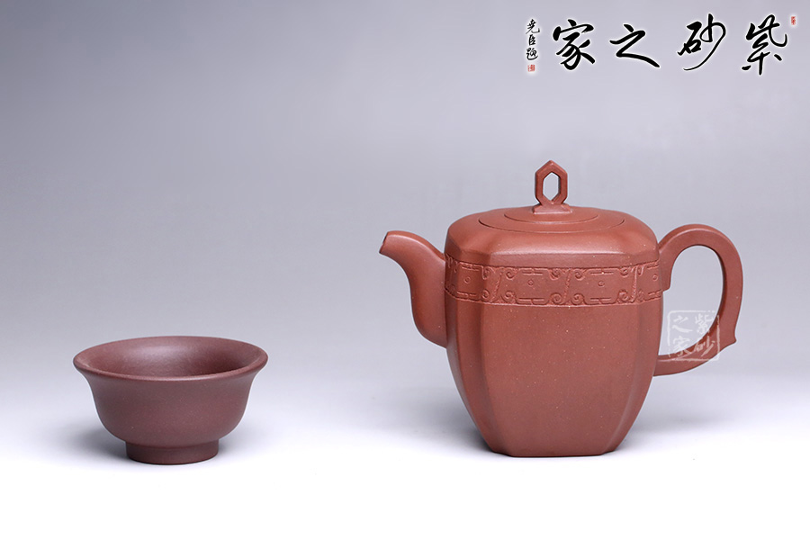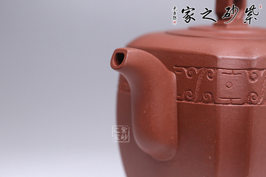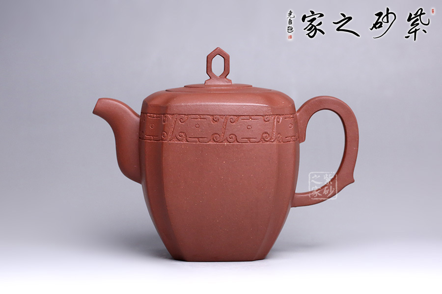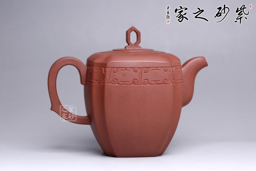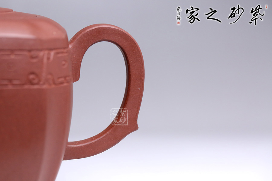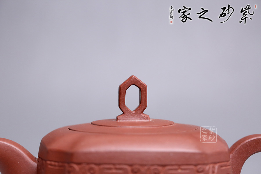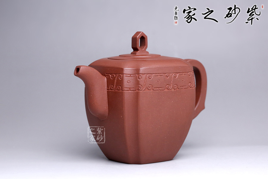 造型在經(jīng)美人肩壺的基礎(chǔ)上加以創(chuàng)新,融匯四方之韻。周身渾樸大氣,壺身骨肉亭勻,上豐下斂,輪廓清晰。鈕做六方鏤空,有迎祥得福之意,嵌蓋與壺身呼應(yīng),層層遞進(jìn),營(yíng)造豐富的層次感。流、把皆作四方狀,三彎流自然胥出,圓把挺而有力,剛中帶柔,線條流暢,過(guò)渡自然。壺風(fēng)敦厚樸實(shí),四面抽角,比方器多了一份圓潤(rùn)之美,比圓器多了一份剛毅之力,做工精細(xì),獨(dú)顯作者深厚之功底,兼具觀賞性與實(shí)用性,值得收藏。