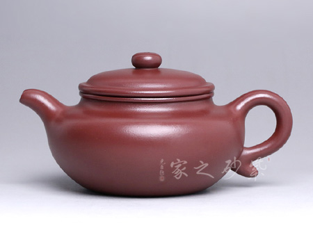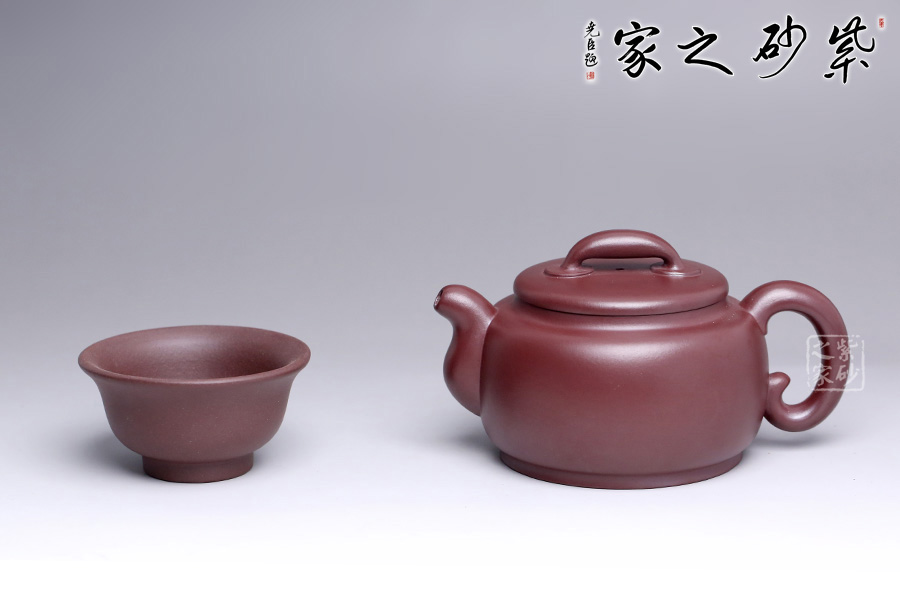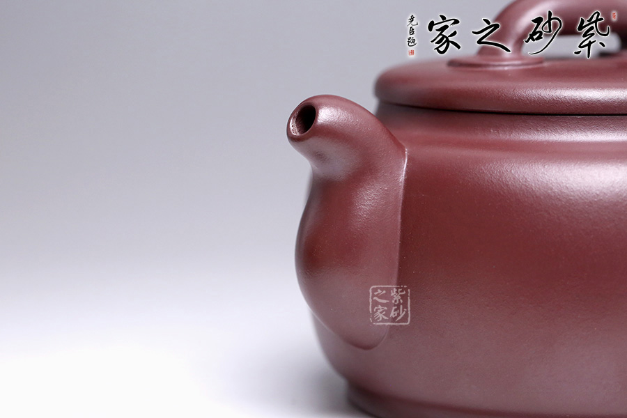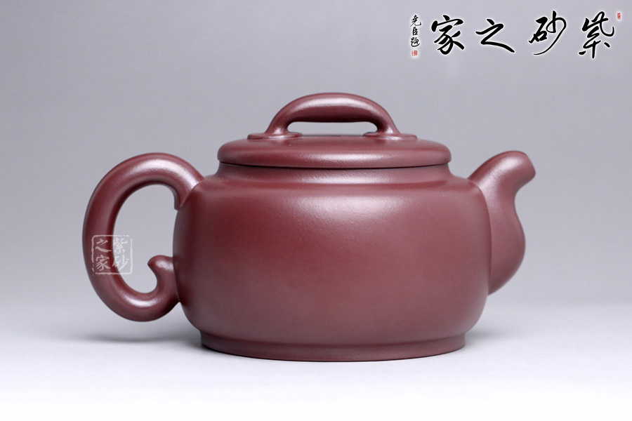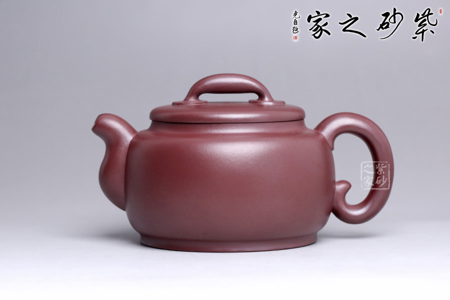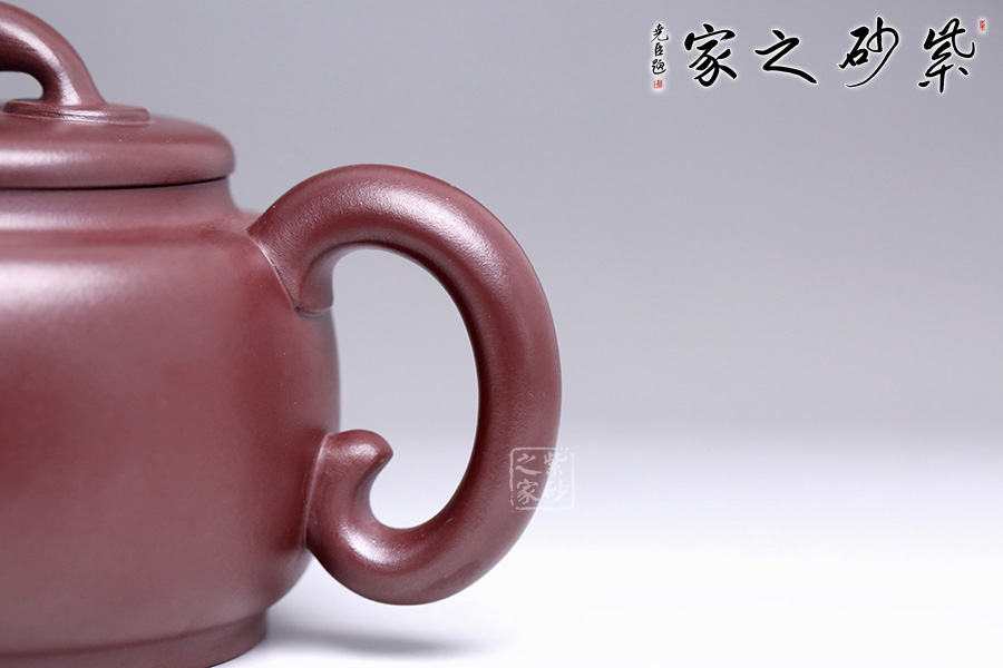 整個(gè)壺身肩線明顯,造型如玉環(huán)一般圓潤(rùn),壺鈕壺把也都是玉環(huán)抽象造型。玉環(huán),象征著美好圓滿,造型圓滿,很像家人間相處和氣、圓滿的氛圍,也寓意著家庭幸福美滿。另外玉環(huán)取名也隱喻楊玉環(huán),傳說(shuō)楊貴妃體態(tài)豐腴,姿質(zhì)豐艷,也是此壺圓潤(rùn)飽滿之意。