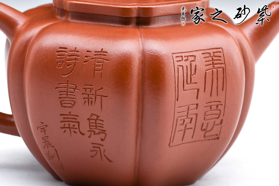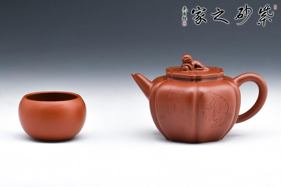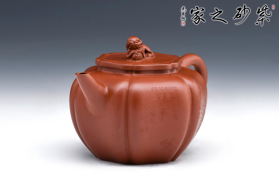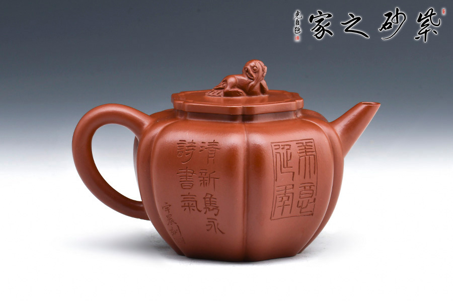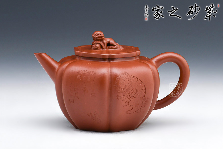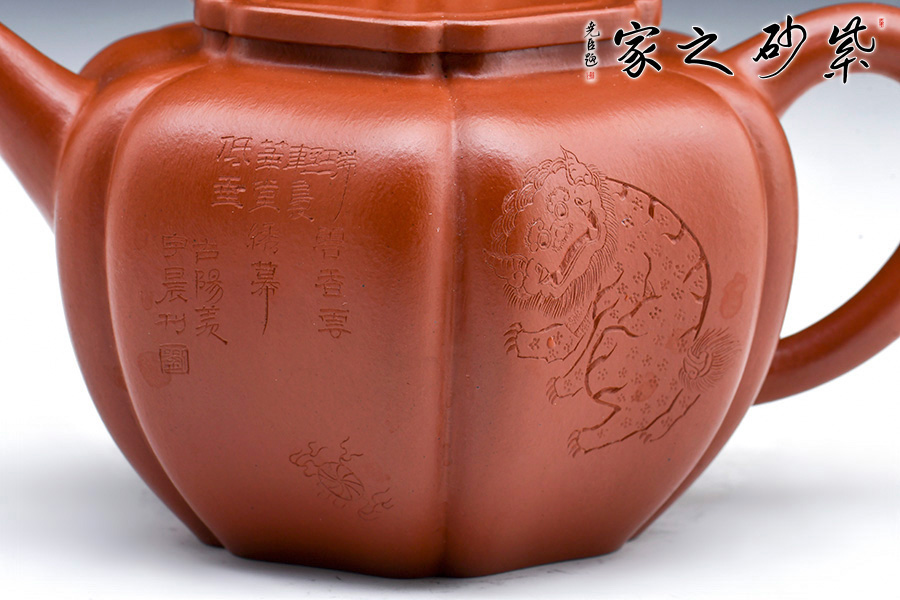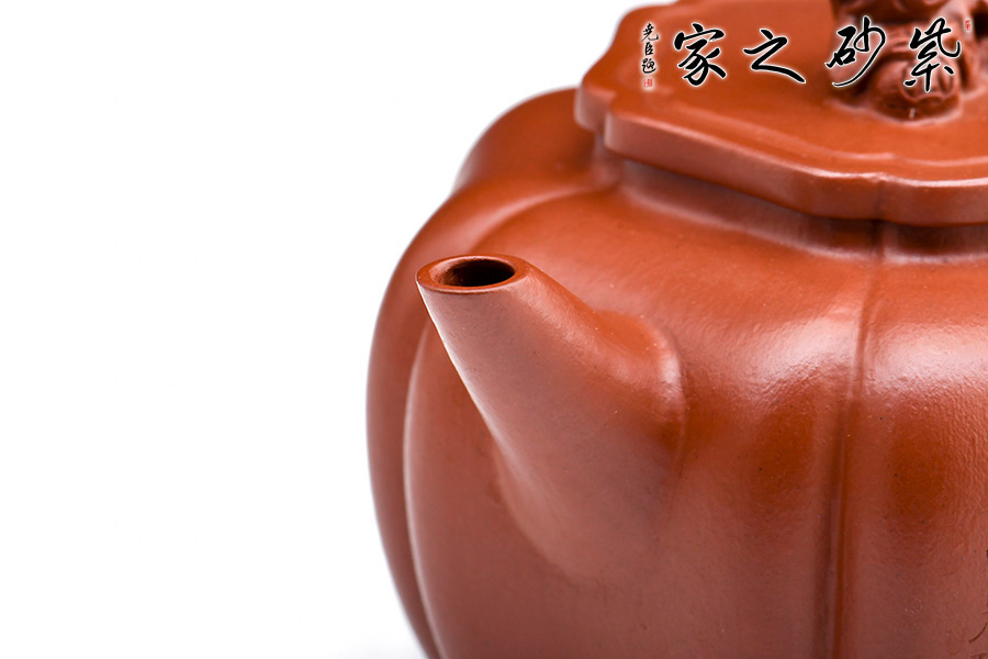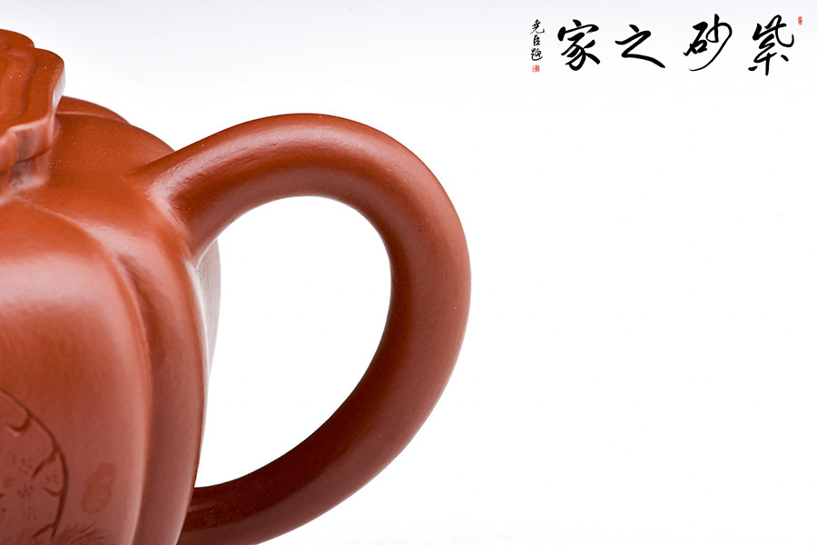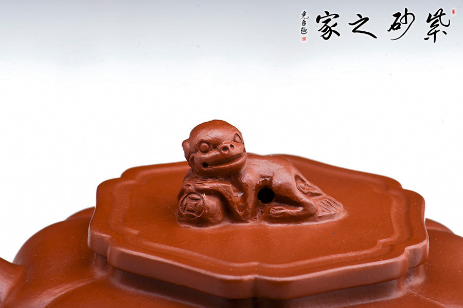 此壺筋紋等分,比例均勻,下調(diào)流暢。柔和的線條之間又有股挺拔的氣勢,非常耐看,整器協(xié)調(diào)統(tǒng)一,制作精巧,落地穩(wěn)重!壺蓋與壺身應(yīng)和,呈菱花造型。獅子玩繡球造型為壺鈕,直流長嘴,柔潤優(yōu)美,耳形環(huán)把隨勢,與壺嘴相呼應(yīng),氣韻舒暢。選用原礦朱泥制作而成,泥質(zhì)細(xì)膩,以手撫之溫潤綿密。觀之整器,為實用的精品,也是欣賞和把玩的藝術(shù)品,值得推薦。