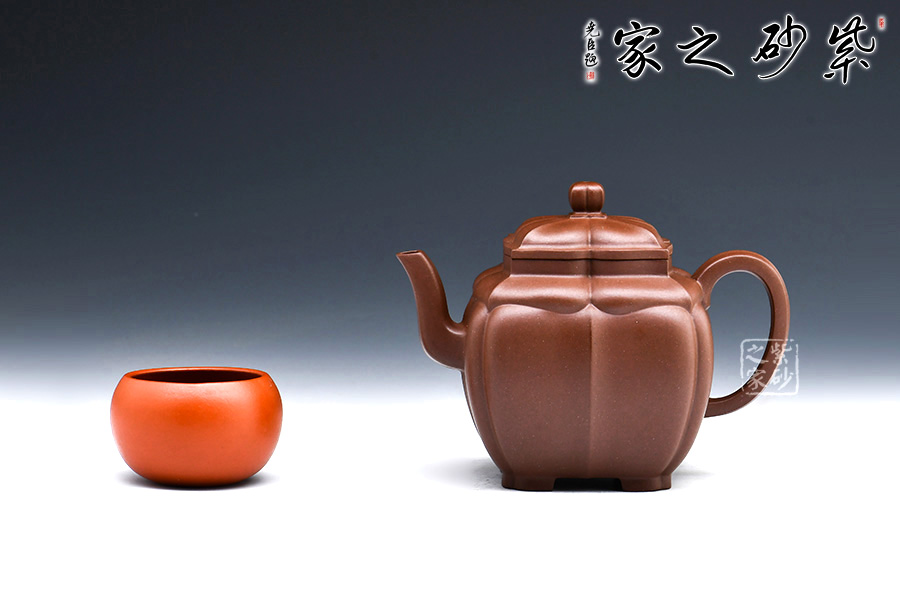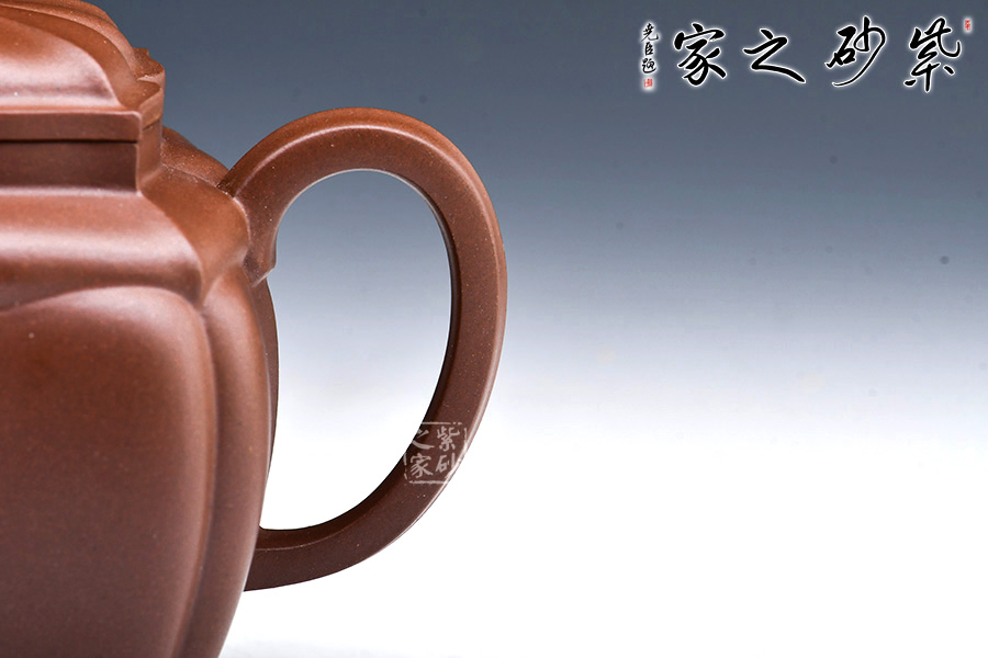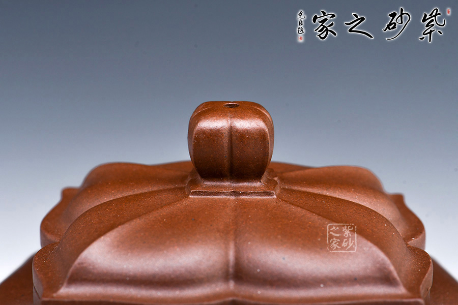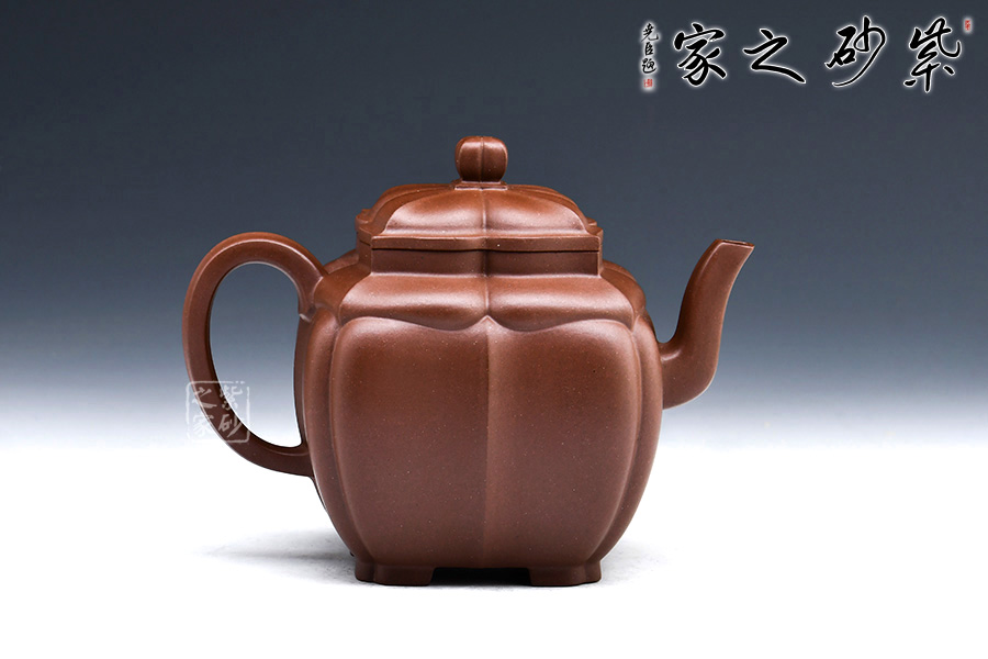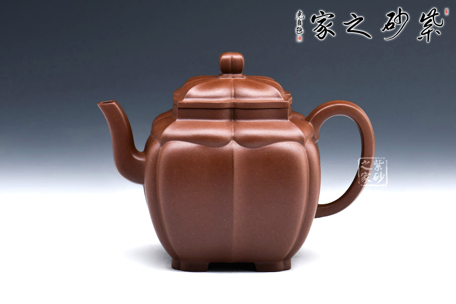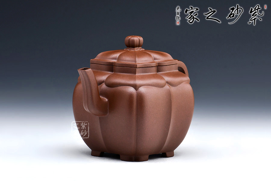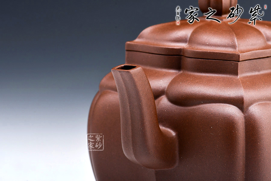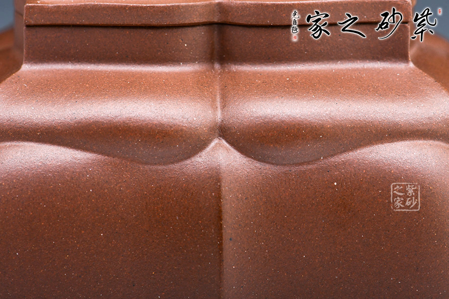 此款“四方菱花”是一款極具代表性的筋紋器造型壺,菱花做工精美,造型古雅。整壺四方造型出落得美麗大方,壺筋紋明理清晰,明暗有度,有棱有廓,權(quán)衡比例。菱花壺鈕與壺身一致,彎流式壺嘴胥出自然,把彎曲恰體,端握方便,整個(gè)菱線自壺頂至壺底相交成一點(diǎn),分毫不差。壺蓋面面可置換,技藝精湛。