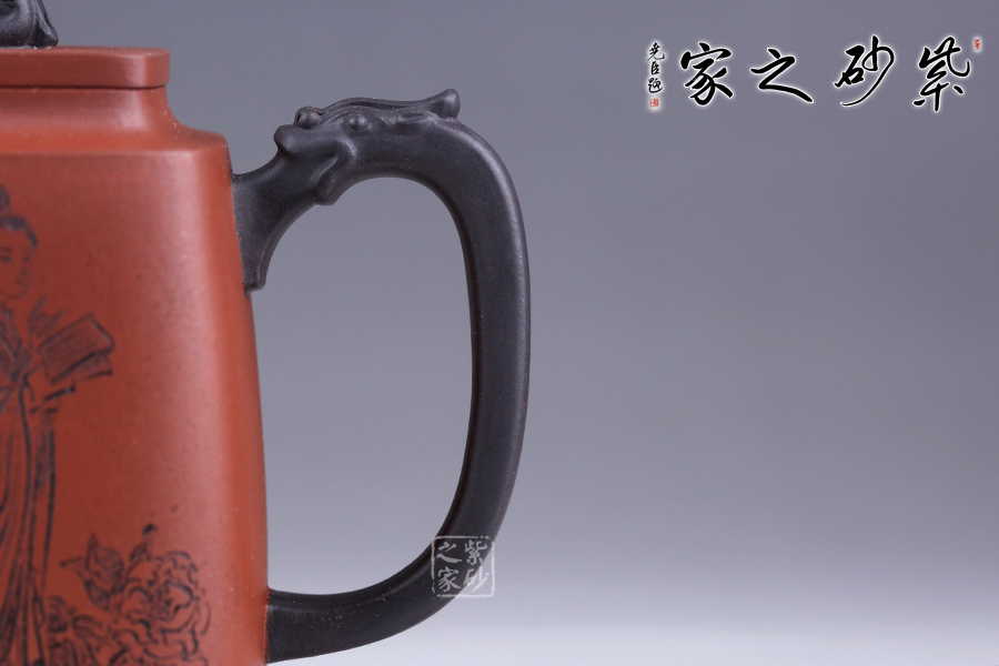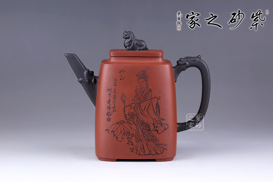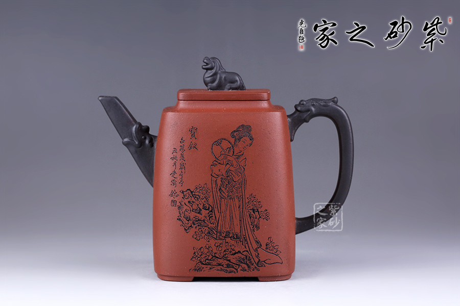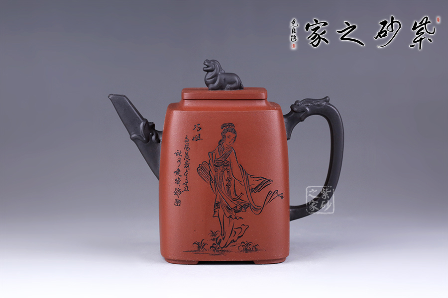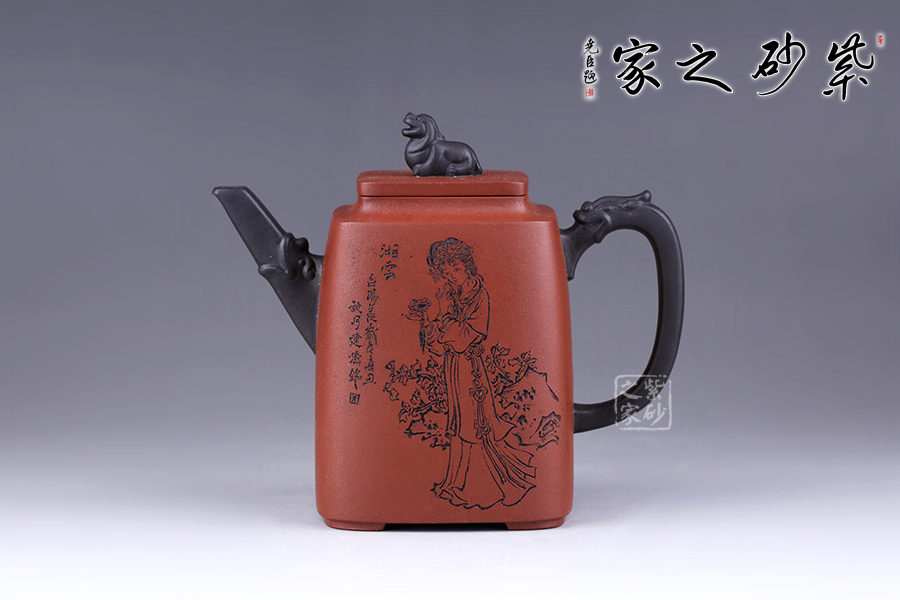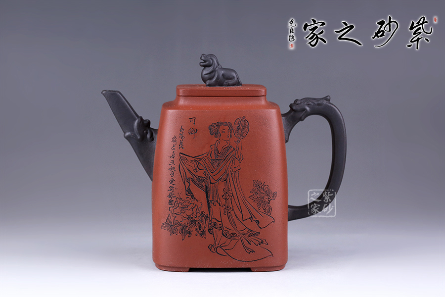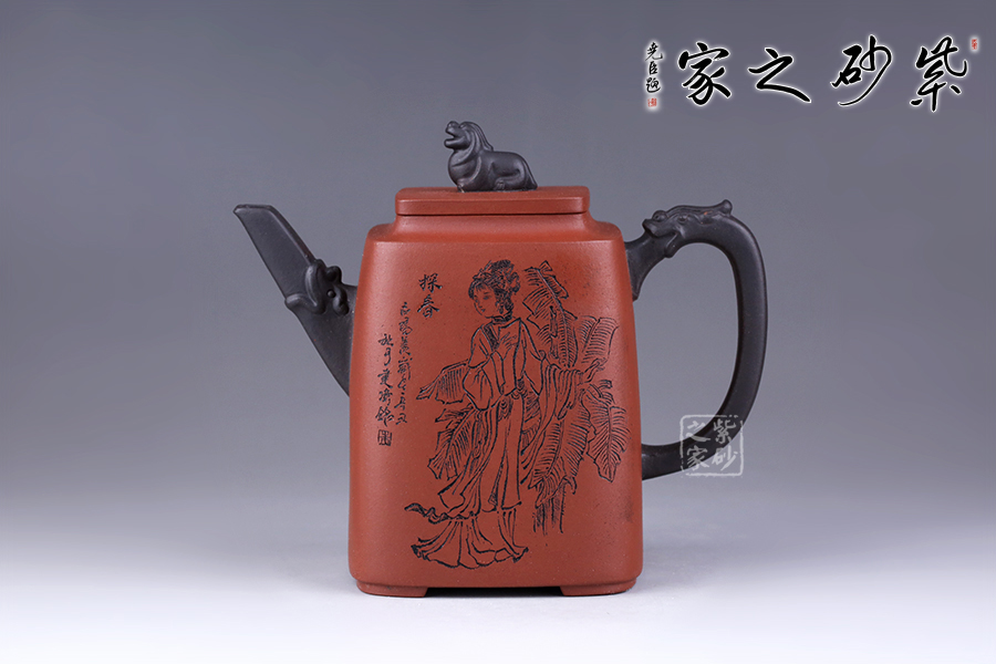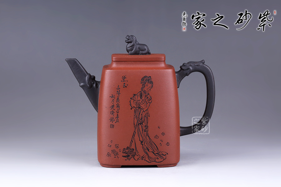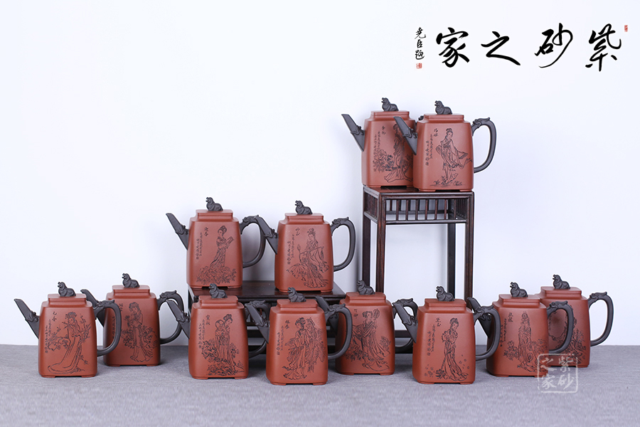 十二金釵套壺,由享有“雙色泥一絕”的美譽朱建偉老師創(chuàng)作完成。每把壺選取古典名著《紅樓夢》中十二金釵仕女為人物題材,壺身人物神韻、動作、服飾刻畫生動傳神,非常具有收藏價值。此壺型呈四方,上窄下寬,線條流暢直挺底部。壺身、壺嘴、壺蓋、壺鈕、壺把皆為方形,塊面挺括,線條利落。蓋鈕似獅,形狀威武,此乃點睛之筆。