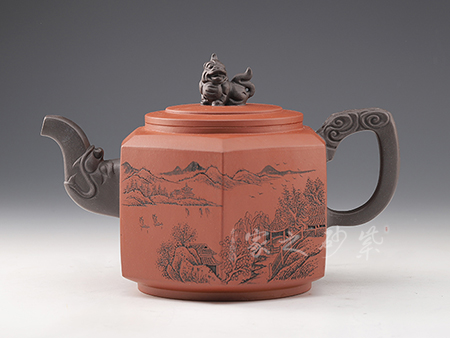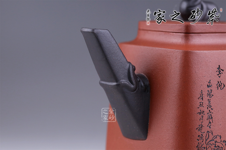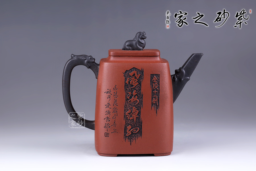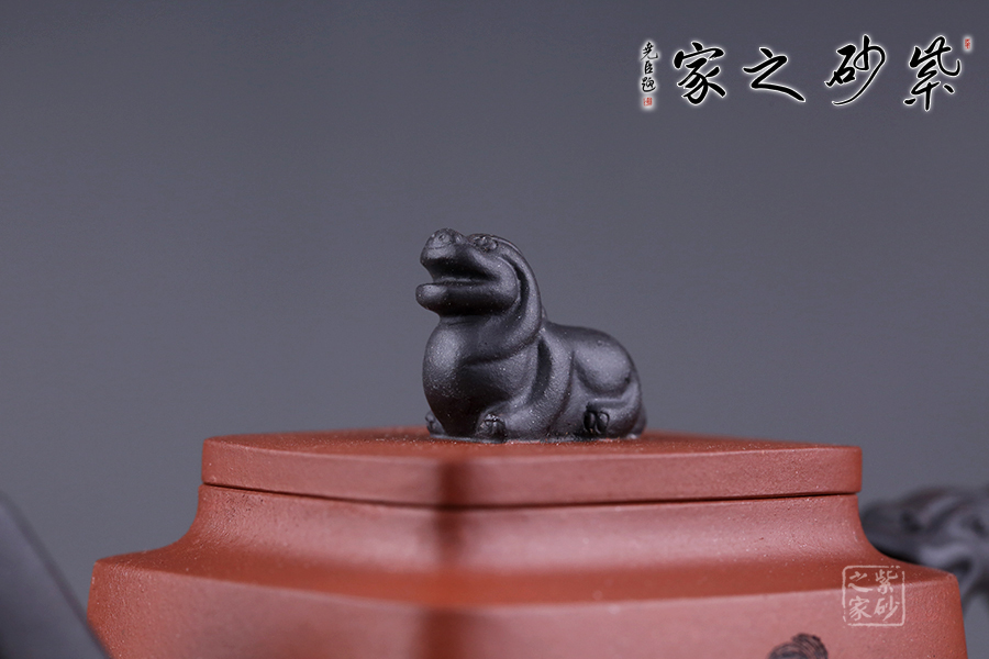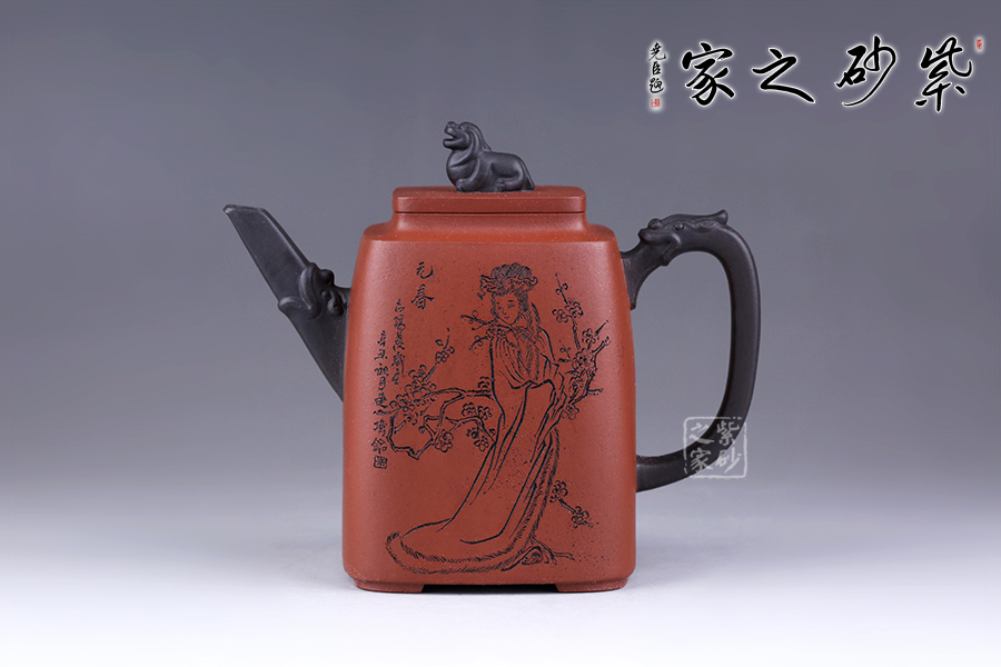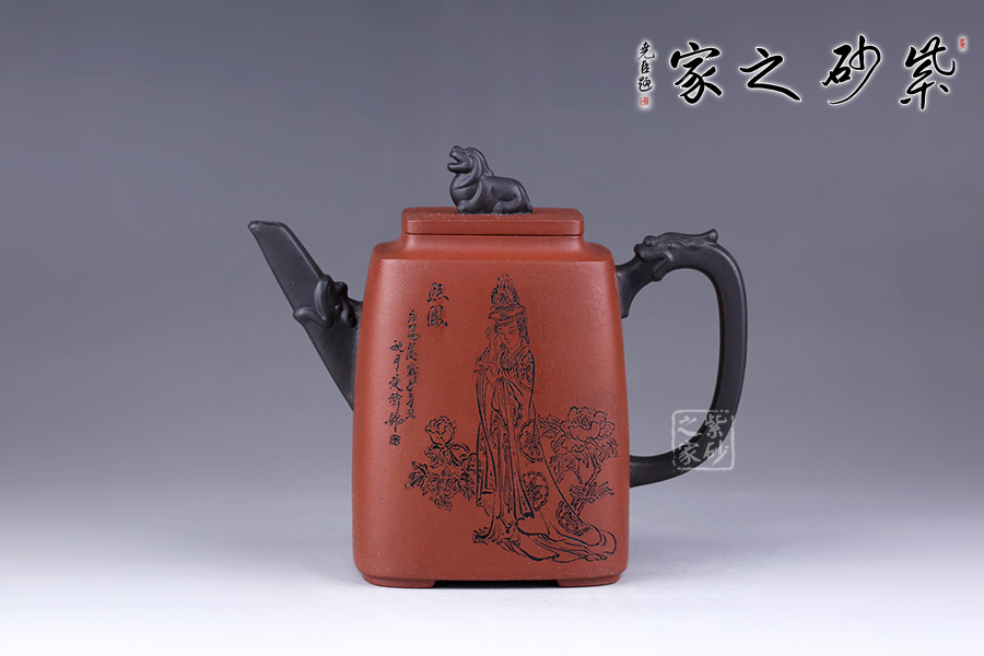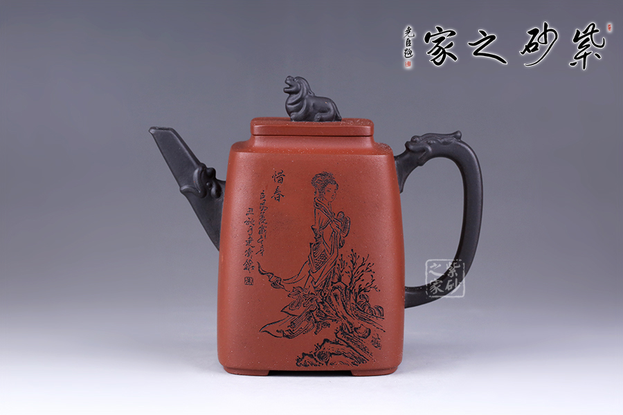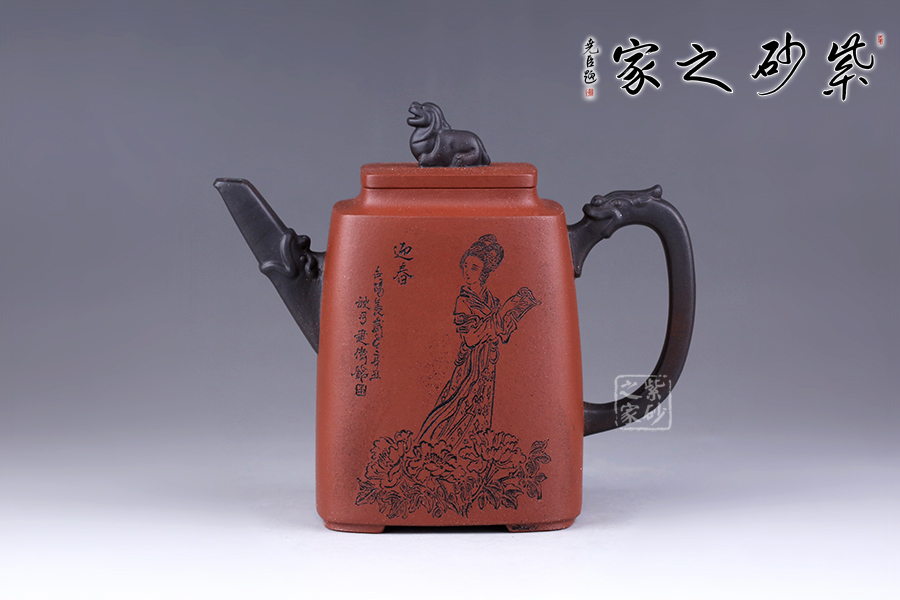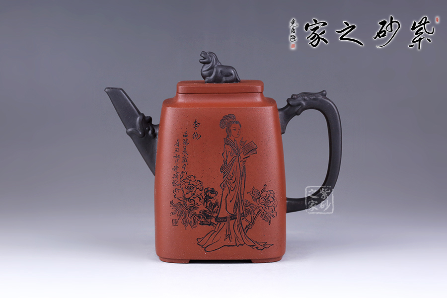 十二金釵套壺,由享有“雙色泥一絕”的美譽朱建偉老師創(chuàng)作完成。每把壺選取古典名著《紅樓夢》中十二金釵仕女為人物題材,壺身人物神韻、動作、服飾刻畫生動傳神,非常具有收藏價值。此壺型呈四方,上窄下寬,線條流暢直挺底部。壺身、壺嘴、壺蓋、壺鈕、壺把皆為方形,塊面挺括,線條利落。蓋鈕似獅,形狀威武,此乃點睛之筆。