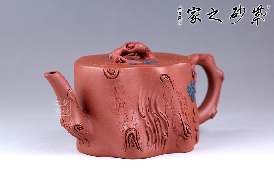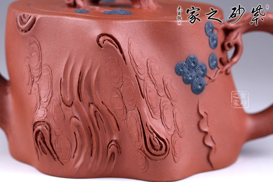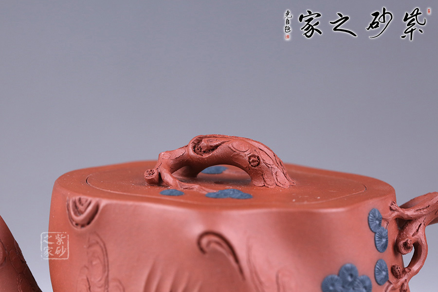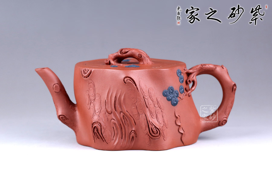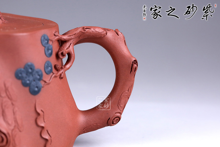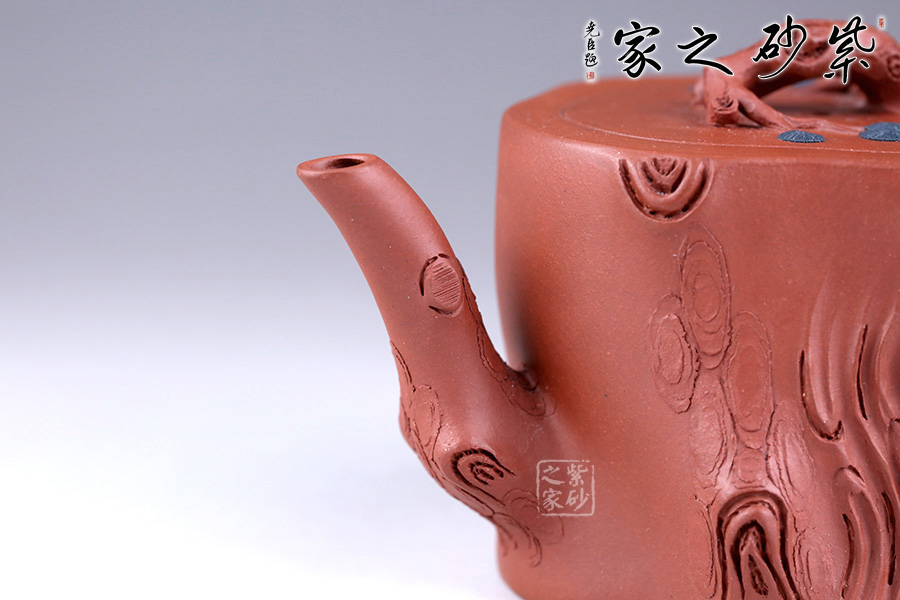 整件松段壺泥塑工藝精美,層層迭迭,將古松蒼老之外皮塑造的分外相似。壺面樹皮的斑駁蒼勁,體現(xiàn)了生命的堅韌;松針的精細刻繪,體現(xiàn)了盎然的生機。壺鈕更是巧取松節(jié)一段,匍匐貼合于蓋上,其上松針青綠,極其逼真。壺把亦有松針相連,生動而形象。整壺氣勢古樸,集審美、藝術(shù)、實用、工藝于一體。
