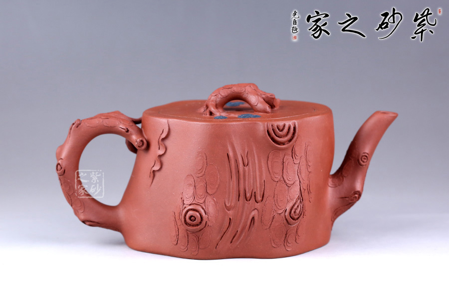 此壺乃是一件仿生作品,其造型古樸,壺身,流,把,蓋皆做松樹枝節(jié),平口,作淺圈足。
