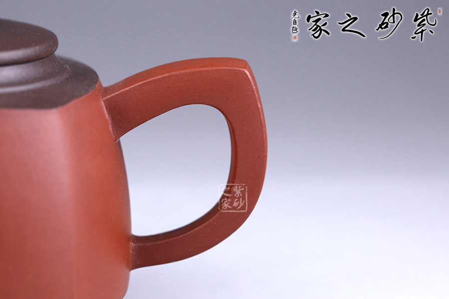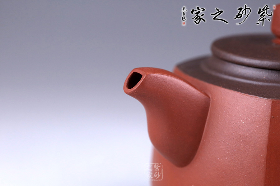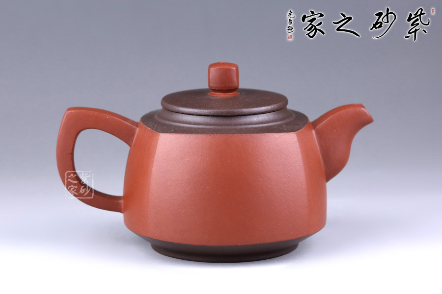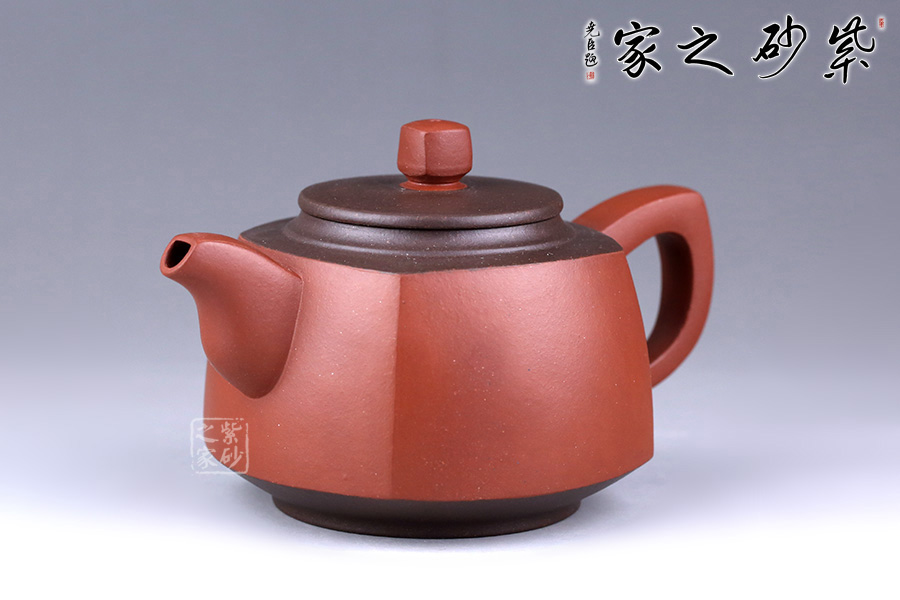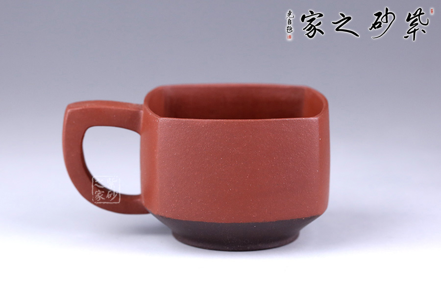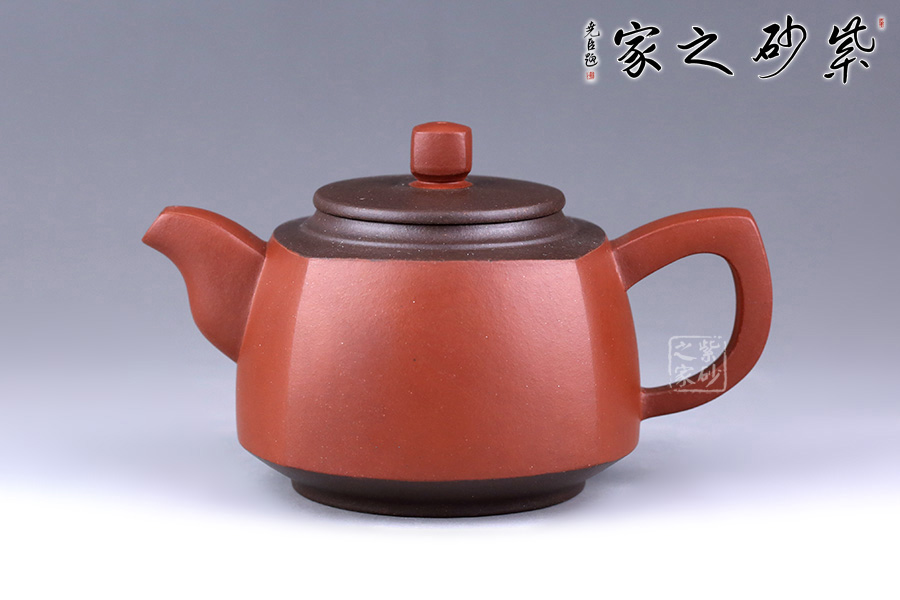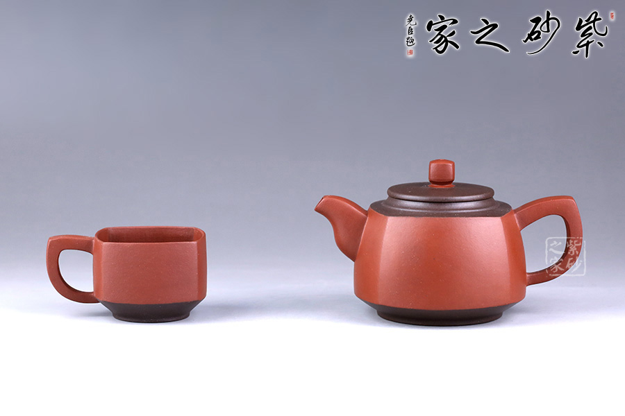 此組合造型優(yōu)雅、古樸、端莊,方圓結合。整個壺身呈四方的輪廓,而蓋與底皆呈圓形,極具趣味和思想;這是一款雙色泥作品,采用的是精品清水泥與紫泥拼制而成,以上下分層交疊而成,整個壺身共分四層,分別是壺鈕、壺肩、壺身、壺底,雙色交界處做得尤為清晰,恰到好處,融為一體而涇渭分明,從壺身內(nèi)壁可以看出是真實的泥料相接,并非以顏料調(diào)制而成。杯似壺身,制作工藝精湛,是一組不可多得的套壺組合。