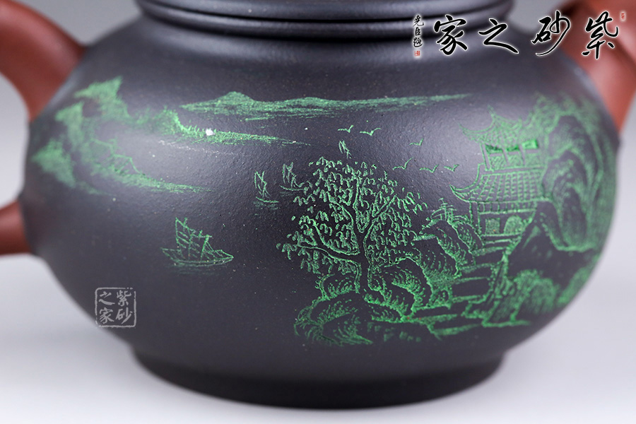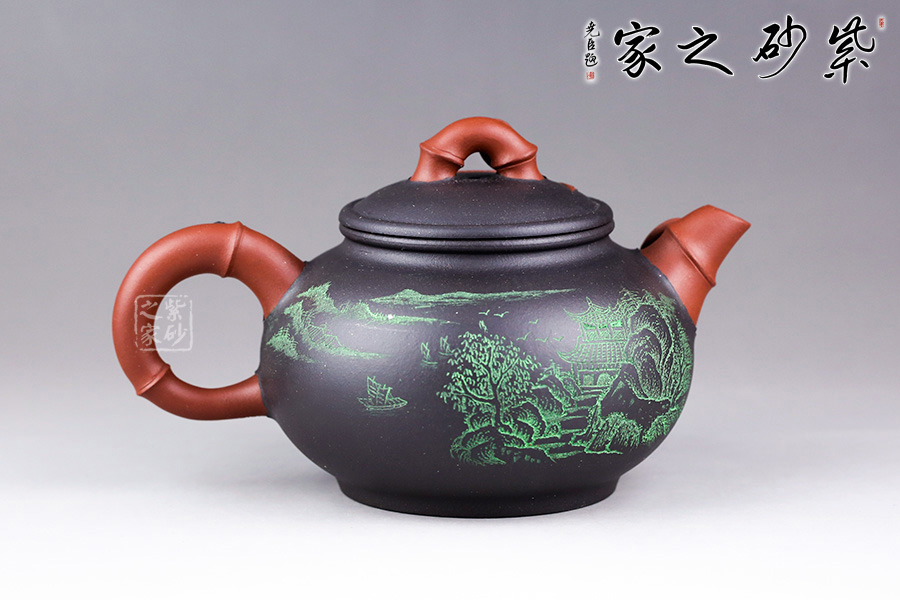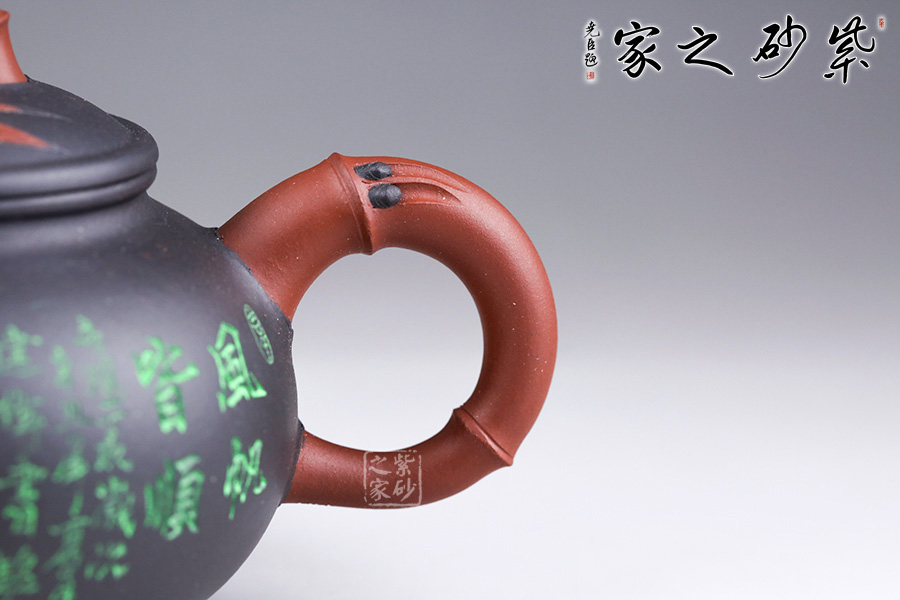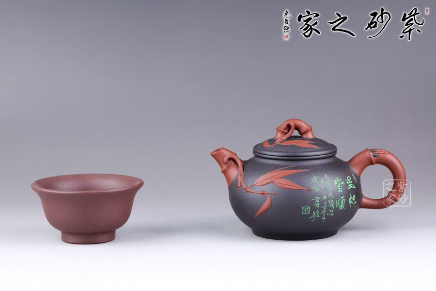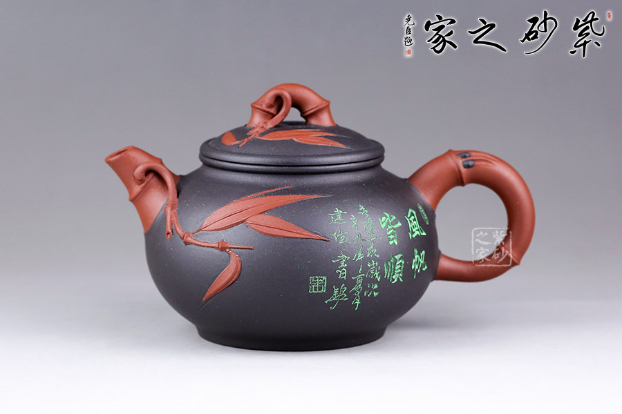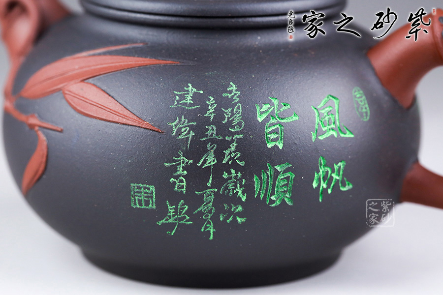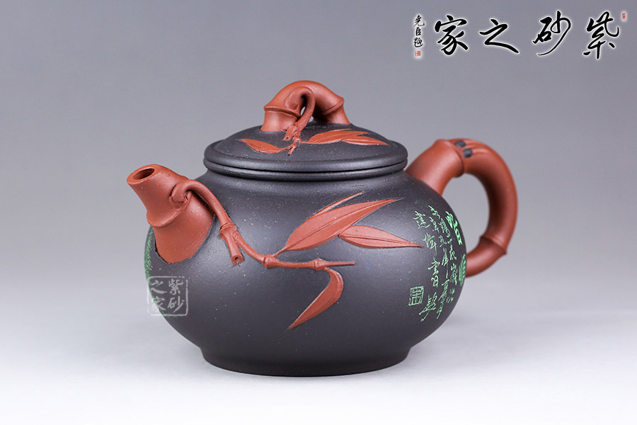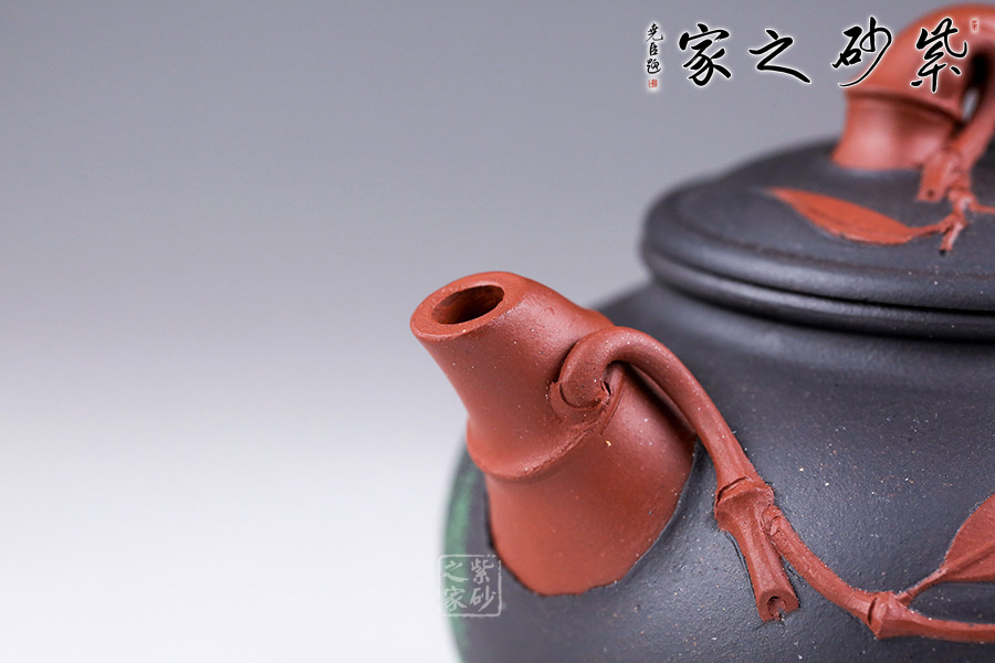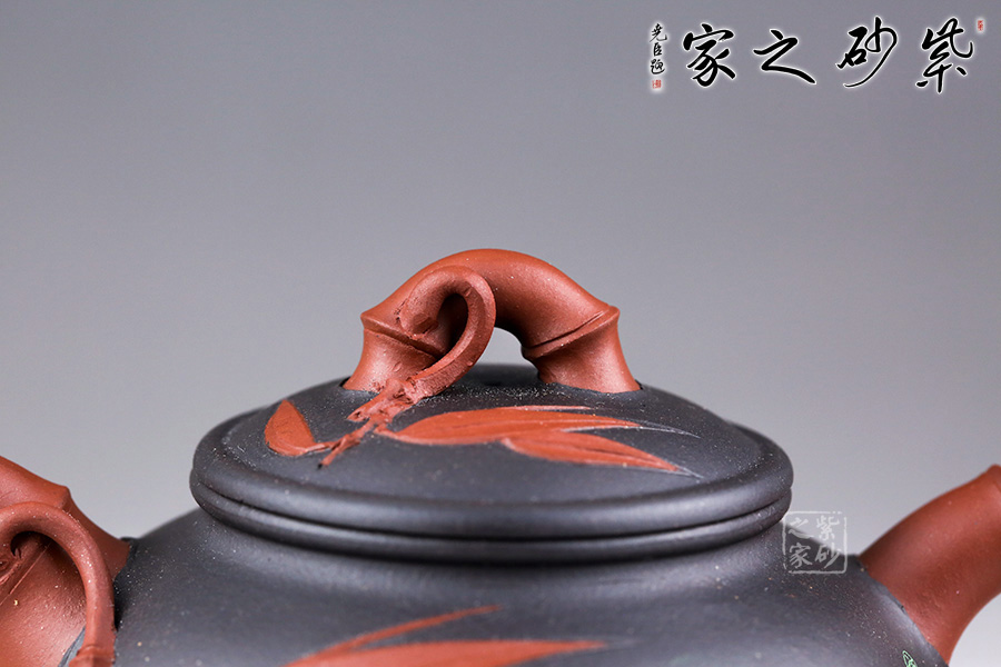 此壺造型別致,雙色泥料制作,相互呼應(yīng),色澤和諧得體,制壺手藝充分展示了朱建偉老師的制壺特點(diǎn)。另外,朱建偉老師還擅長(zhǎng)裝飾手法玩裝金銀鑲嵌、堆泥貼花。 壺身光潔細(xì)膩,圓潤(rùn)飽滿,雙面刻繪,細(xì)節(jié)精細(xì),工藝十分精湛。壺把、壺鈕和壺嘴都是竹形,竹節(jié)逼真,制作工藝十分細(xì)膩。壺嘴處一枝竹葉延伸到壺身,幾片小竹葉,舒展有姿似風(fēng)中飄動(dòng),疏密有致。寓意一帆風(fēng)順,傳達(dá)最美好的祝福。