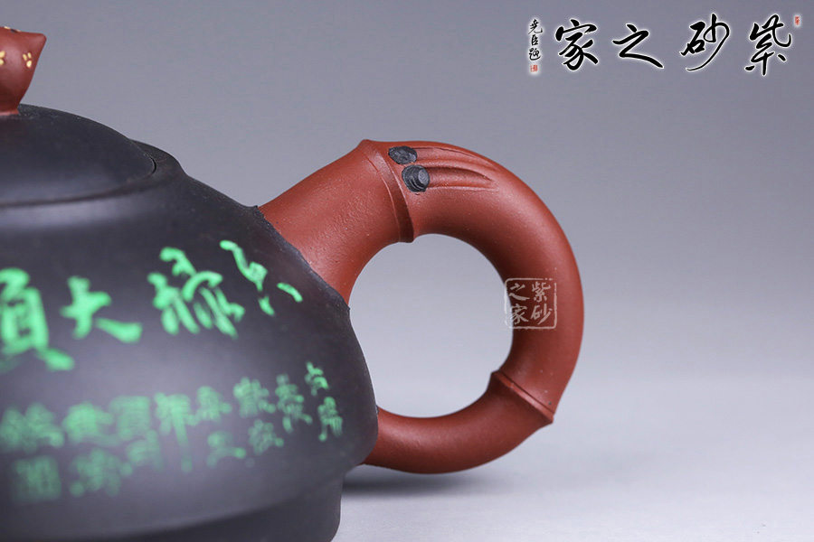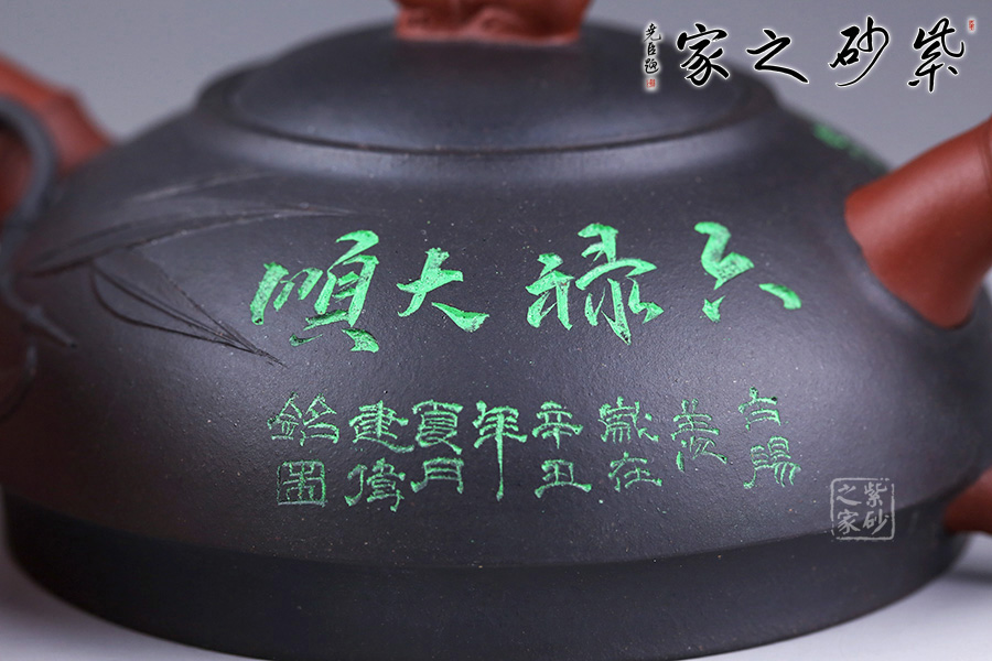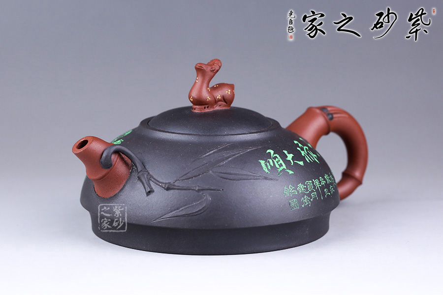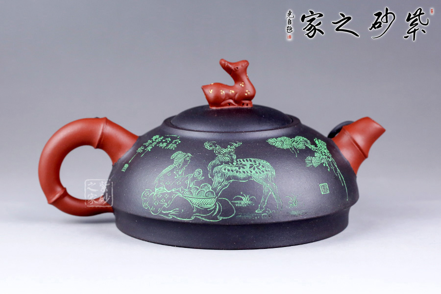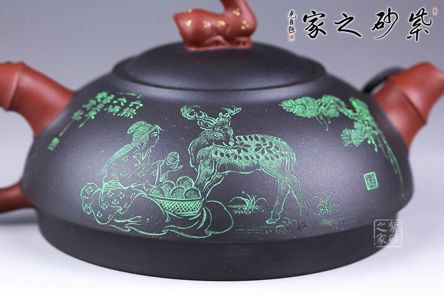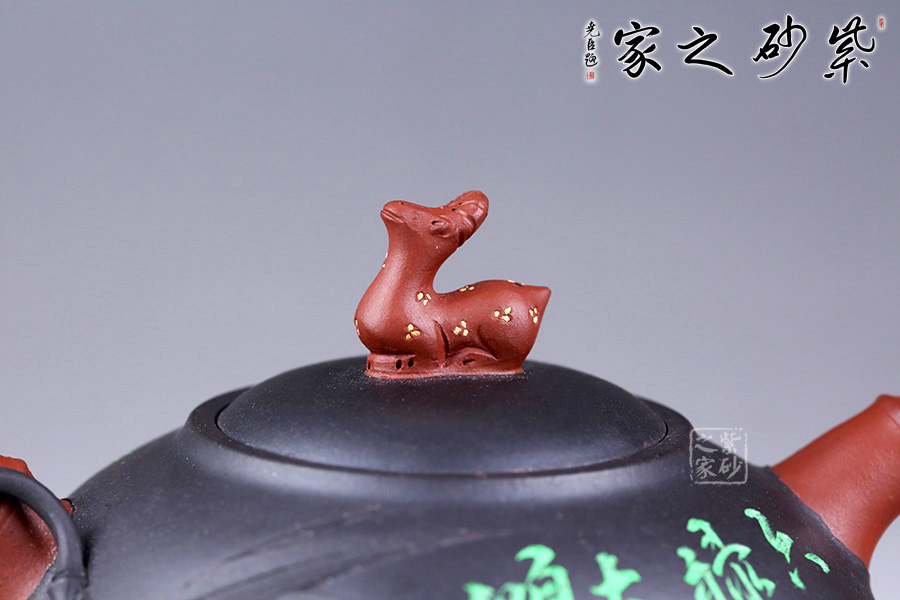 另外,壺身還采用了朱建偉老師精擅的雙色泥料特種工藝,壺身正面繪制的是“六祿大順”四個字,意蘊吉祥;壺身反面孩童喂鹿,細節(jié)刻畫精細。整壺創(chuàng)新十足,是一款不可多得的紫砂作品。