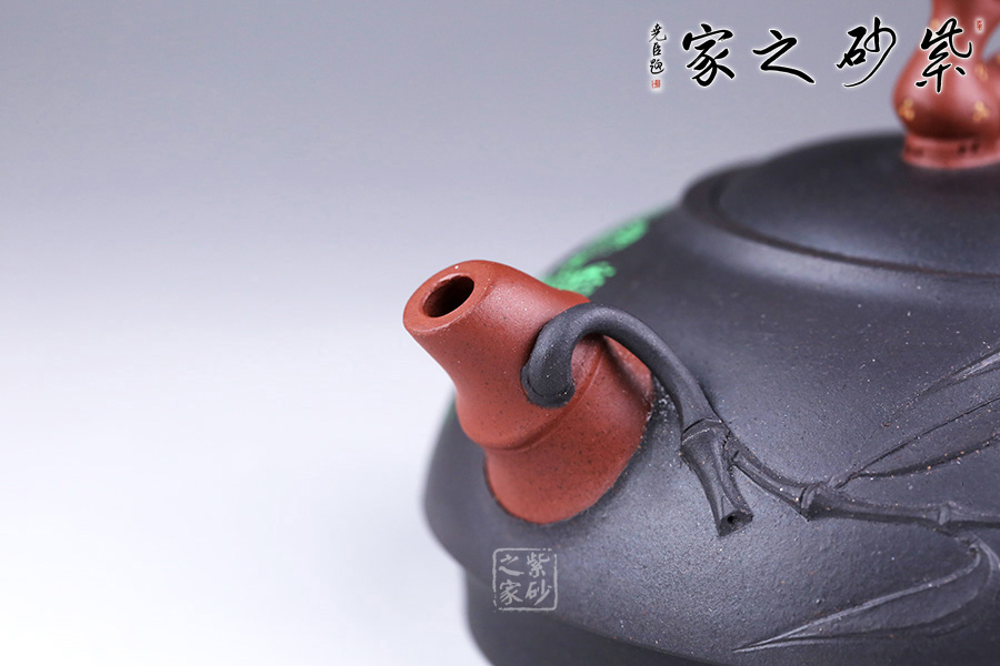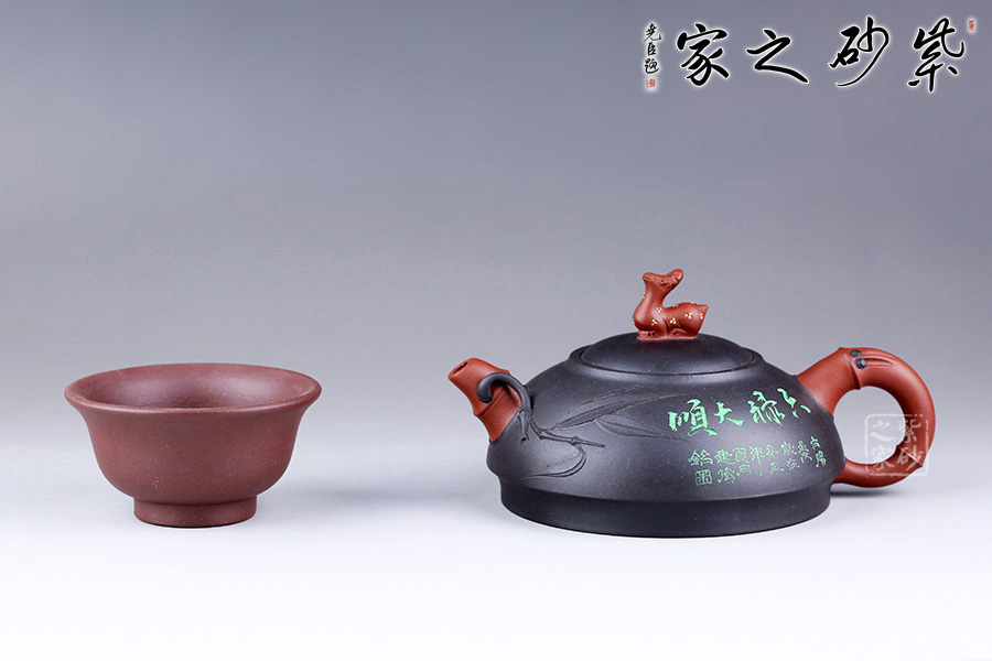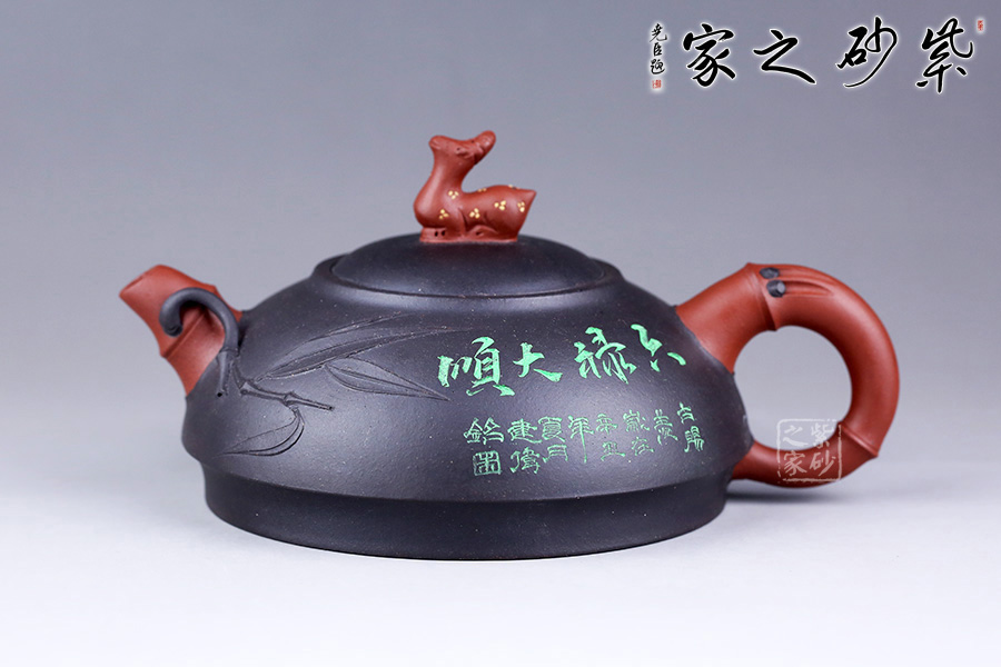 此壺圓而扁,線條流暢,流把竹節(jié)造型,一變嘴二節(jié)竹節(jié)裝飾而成,一只竹葉飄然而出,耳形端把三節(jié)竹節(jié)裝飾。壺鈕造型別出心裁,取一只神鹿為形,以鋪砂的工藝表現(xiàn)神鹿身上的斑紋,閃著金色的光芒,鹿諧音為“祿”,是招財聚福 之意。嵌蓋設計,壺頸略高,形成強勁的壓蓋之勢,壺身呈一只倒扣的碗形,且壺底邊緣向內收縮一圈,使壺身更加挺立,古拙而富有老味。整款壺竹韻清疏,韻味不失,毫無矯飾,意蘊深長。