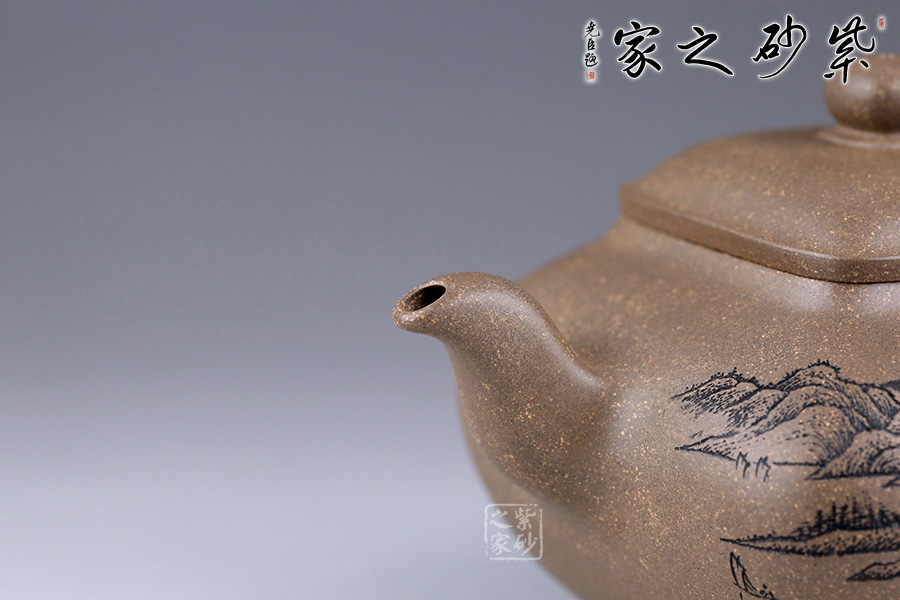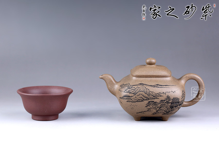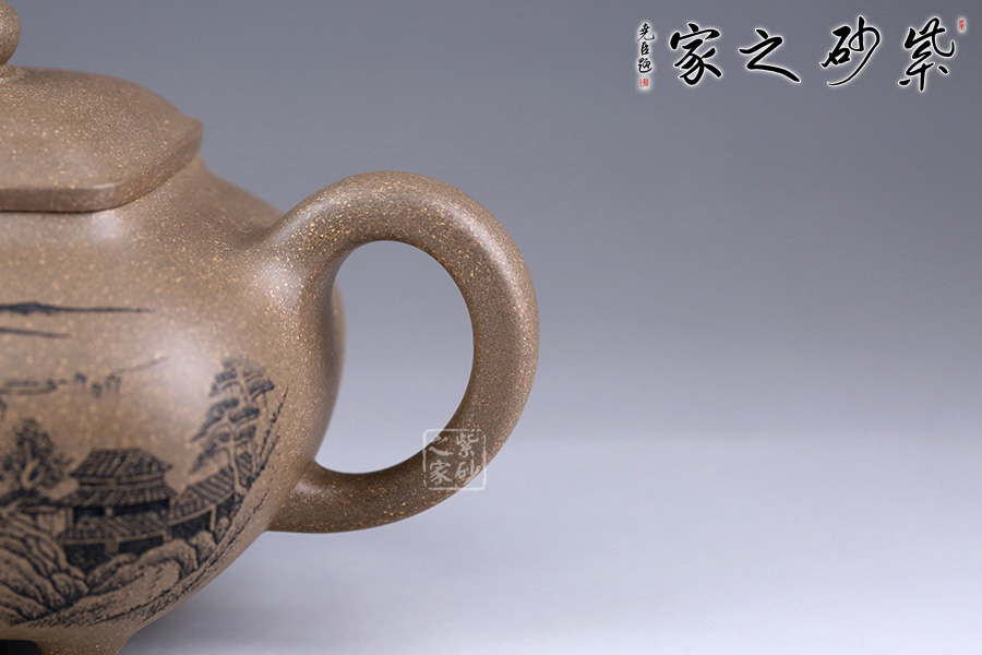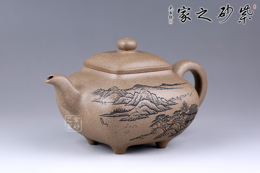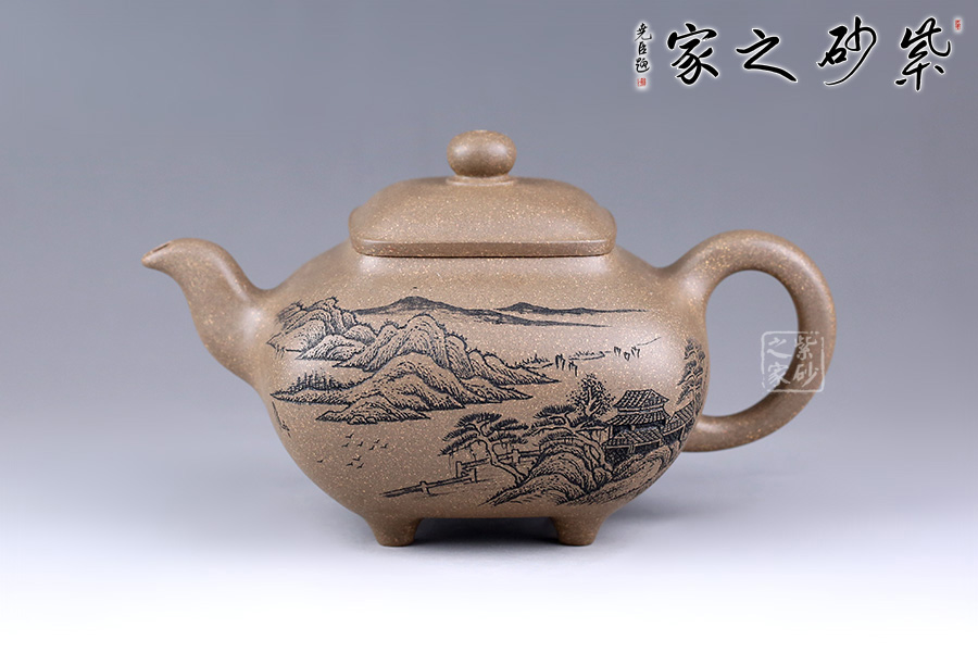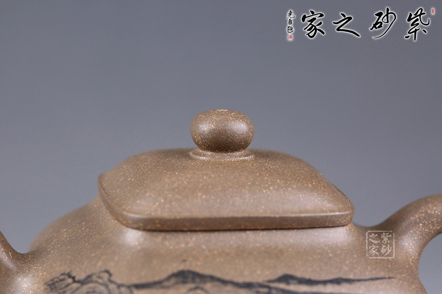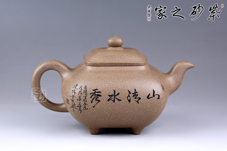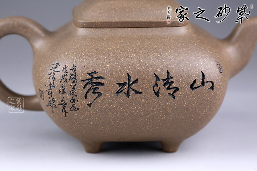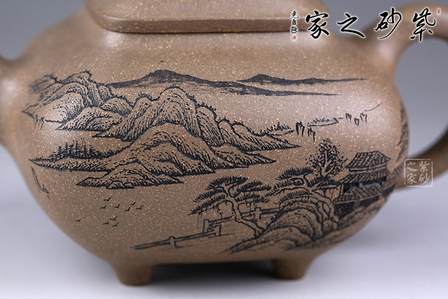 此壺方中見圓,肅靜雅致,過渡自然和緩,毫無凝滯之感。壺身為四方造型,略顯扁圓狀。壺身正面刻繪山水之景,細(xì)節(jié)刻畫細(xì)膩,線條清晰可見;反面刻繪壺名“山清水秀”銘清逸瀟灑,充滿了力量,正反兩面相互呼應(yīng),貼合主題。四鼎足設(shè)計使得此壺更加有視覺效果,立體感更強(qiáng)。彎嘴胥出,耳形把隨身勢。四方蓋,如意橋形鈕與壺身呼應(yīng),觀之整器,做工精細(xì),實乃收藏實用之佳品。