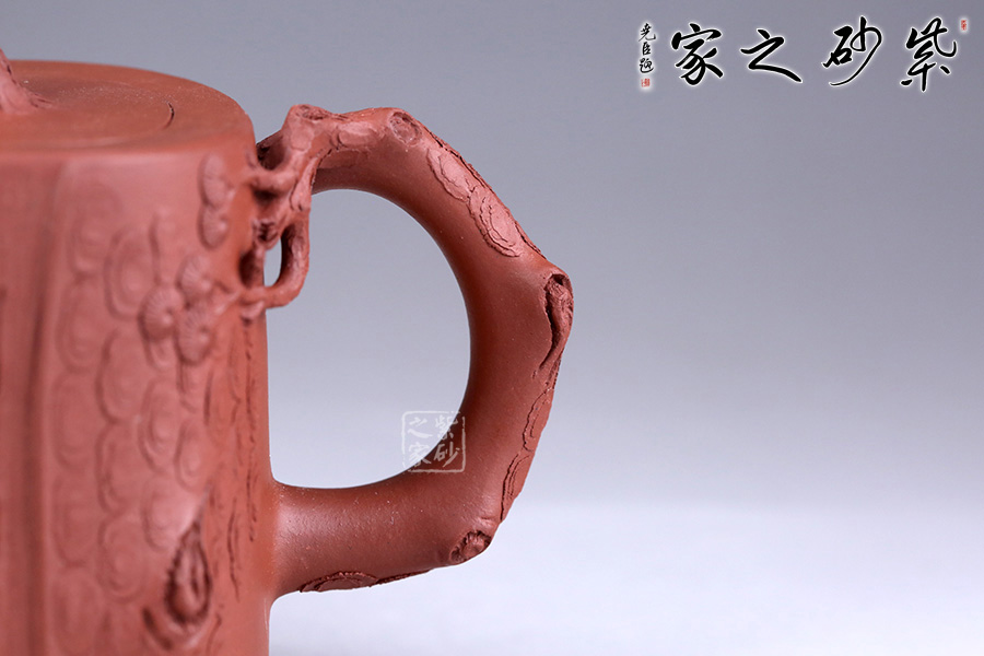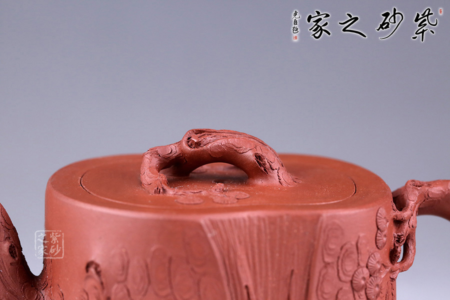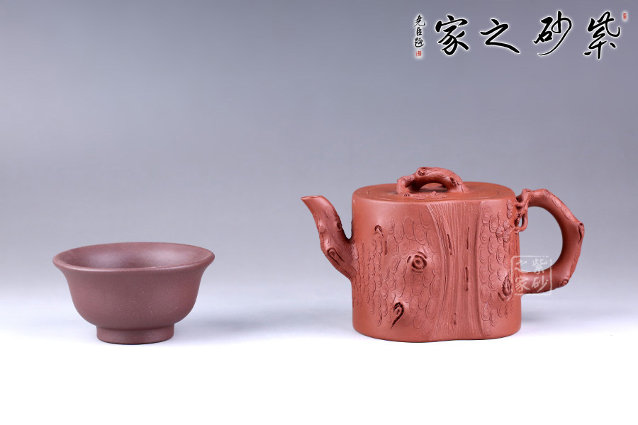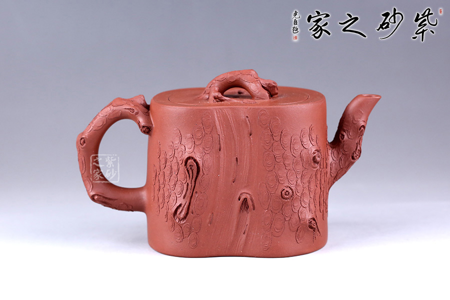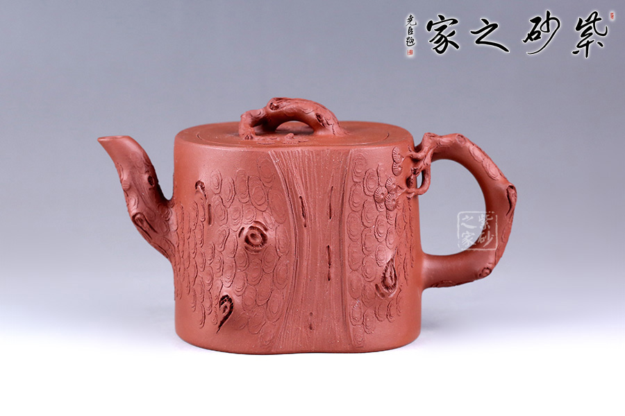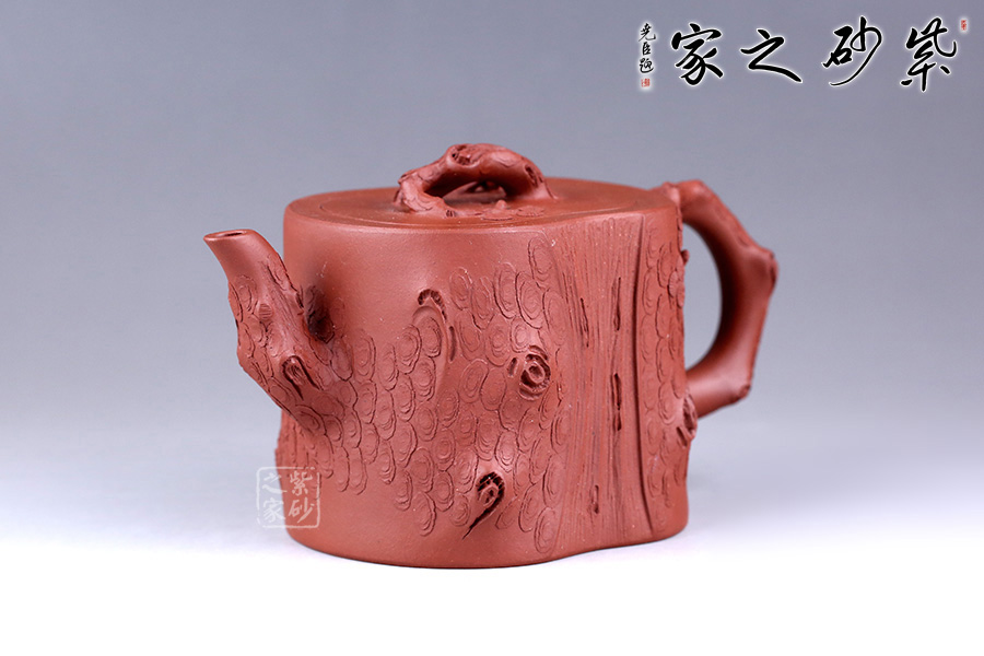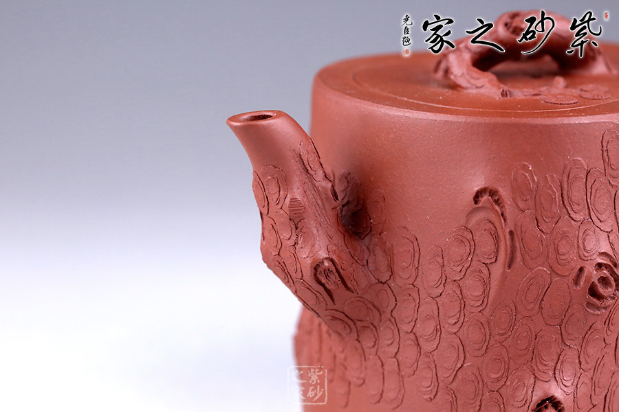 松樁壺,紫砂花貨的經(jīng)典名品。整壺以一段松樹(shù)樁為造型,以寫(xiě)實(shí)的手法,通過(guò)運(yùn)用各種雕塑技法,展現(xiàn)松樁老干遒勁斑駁的肌理,松枝傲骨的不屈與高潔,使松樁之鐵骨冰姿引起觀者共鳴,感悟生命的氣魄。 壺身為一段松樹(shù),松枝為流、把、鈕,流、把明接處及壺身,貼以圈圈樹(shù)皮裝飾,更是形似樹(shù)樁。