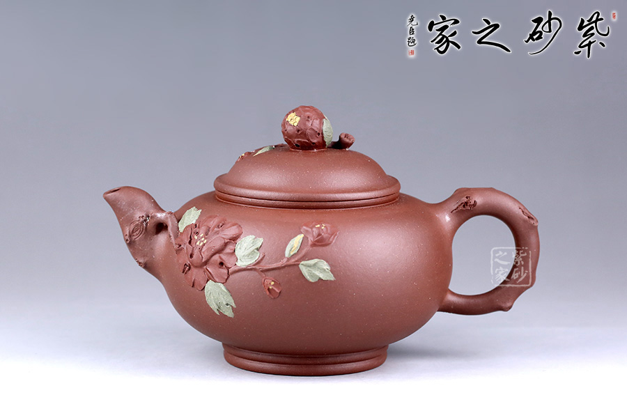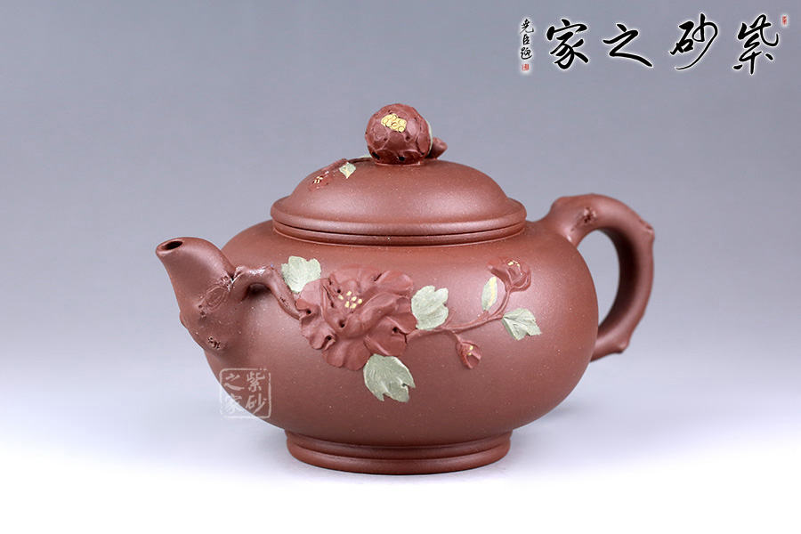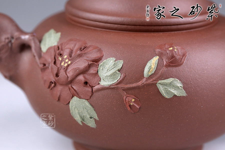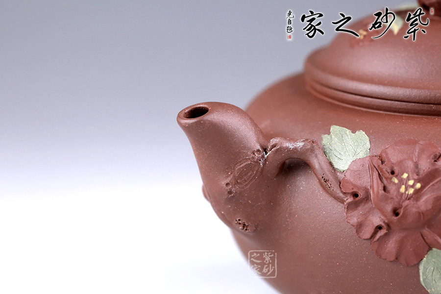 此壺造型別致,以“花”命名,創(chuàng)意十足。壺身通體圓潤(rùn),細(xì)膩緊致,壺把、壺嘴似樹(shù)干,樹(shù)皮的粗糙和凹凸感都特別真切。壺嘴處一枝花延伸到壺身上,花朵綻放,以鋪砂的工藝點(diǎn)綴花蕊,制作工藝逼真,形態(tài)栩栩如生。壺鈕似花苞,含苞待放與壺身花朵遙遙相望。