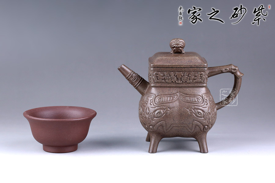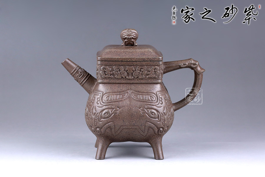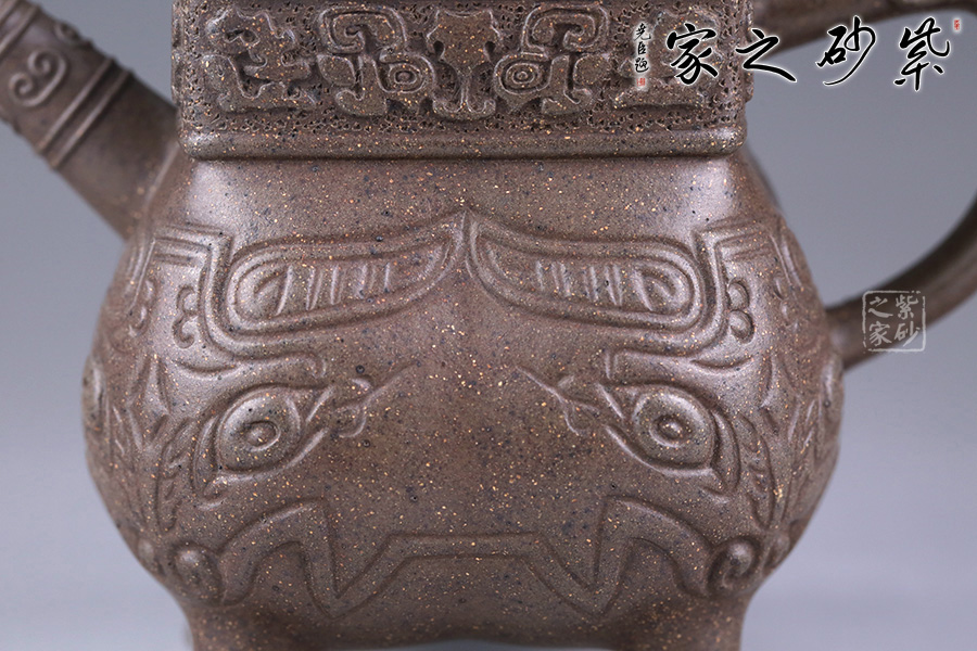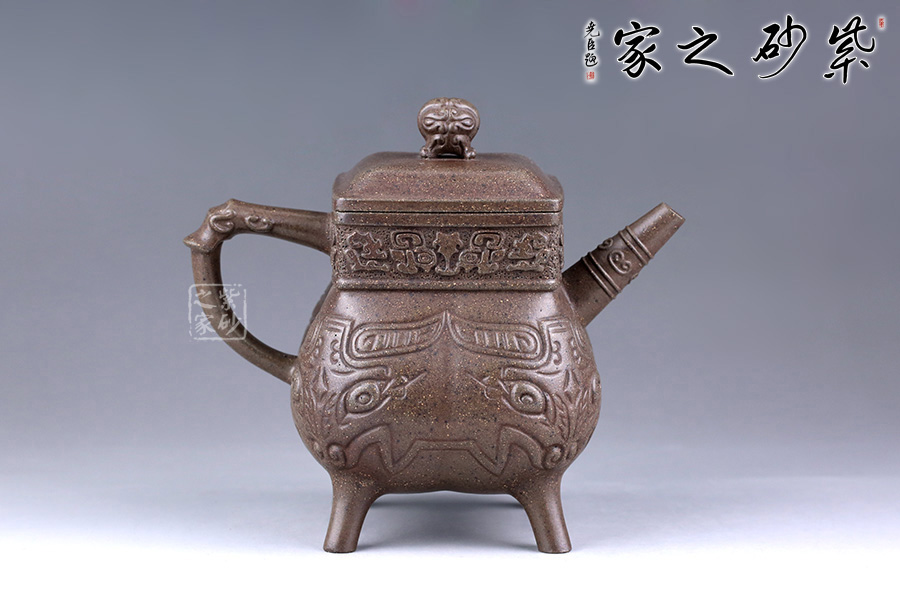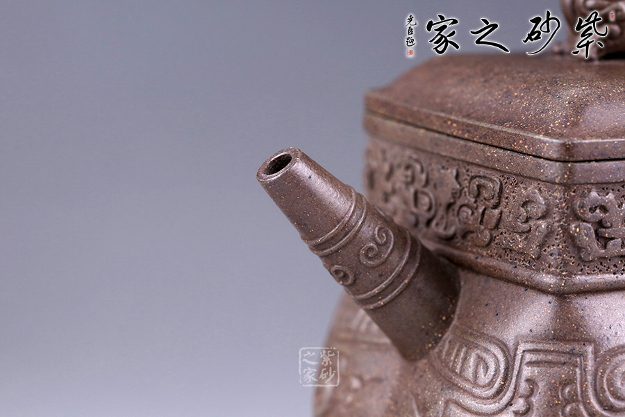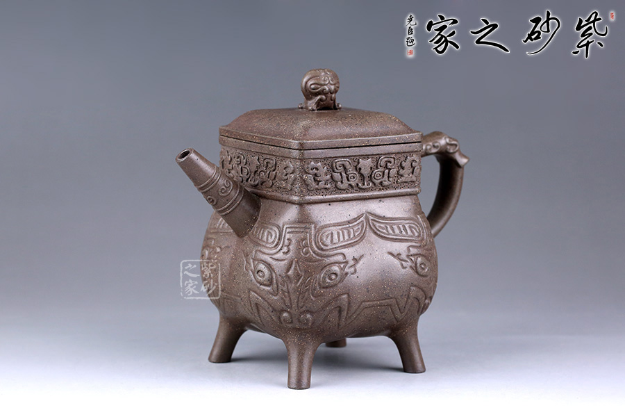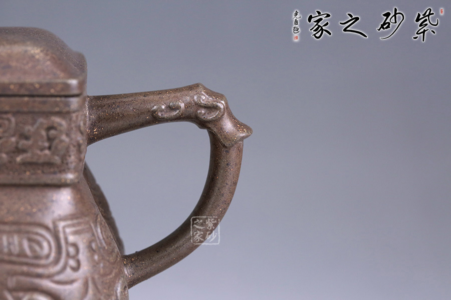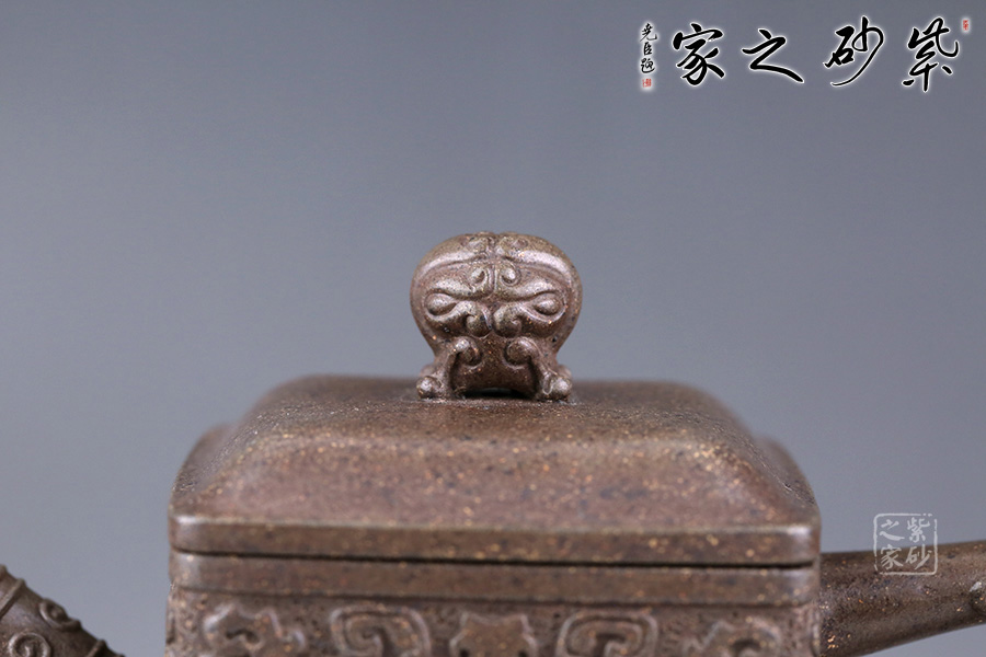 此壺名為“四方菱龍壺”,雖為方壺,卻方中不失圓融,圓融中仍保端正。此壺在方的骨架中轉(zhuǎn)出曲折的線條與平面,靈活運(yùn)用技巧,添加一些神秘的花紋紋樣,讓剛毅的屬性添入婉轉(zhuǎn)柔順,整把壺更加充滿流動(dòng)感。 直形壺嘴,挺拔有力,出水方便;壺把彎折有度,拿捏平穩(wěn);蓋面高聳,其上壺鈕精巧別致,更顯得此壺的神秘大氣。此種壺型足可見(jiàn)作者的深厚的制壺功底及裝飾技巧,用于收藏投資具有極大的升值空間。