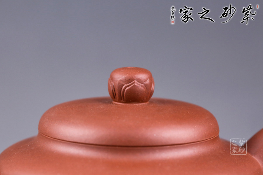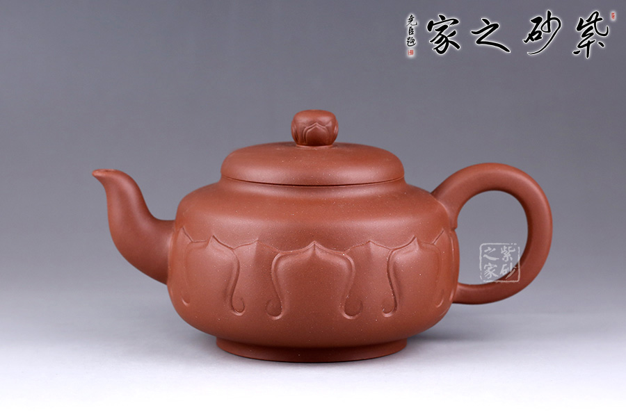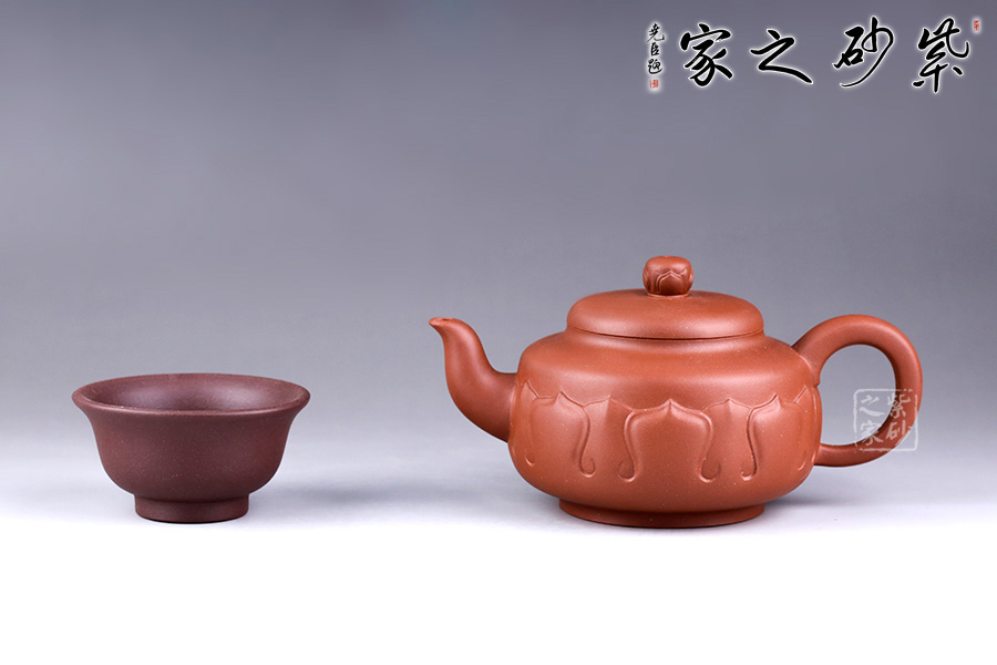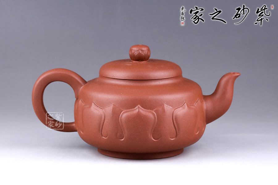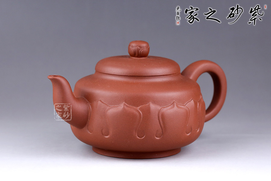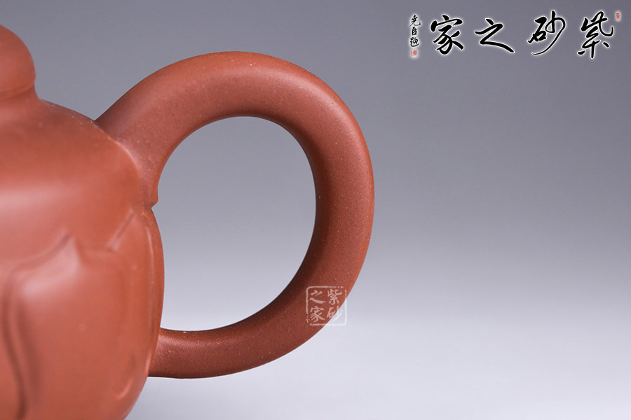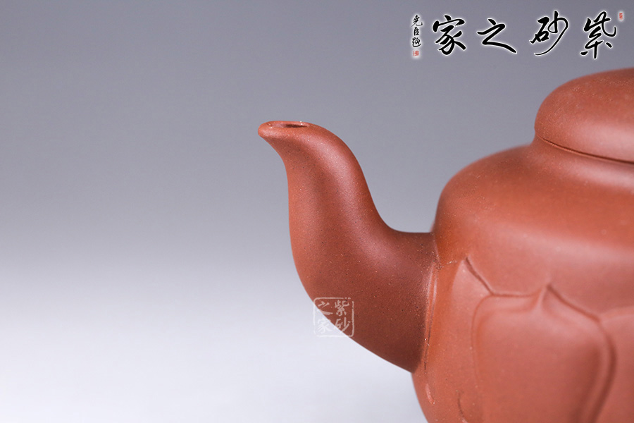 此壺以荷花為基形,器身似花苞待放,壺體由正開的花瓣交叉構(gòu)成,妙趣橫生。壺身泥繪清韻荷花、自在游魚,所謂“荷塘清趣”,深得風(fēng)骨,寫意傳神。三彎流,出水爽快;耳形壺把,端握舒適。整體造型弧線優(yōu)美、線條流暢,視覺感也極為舒適。