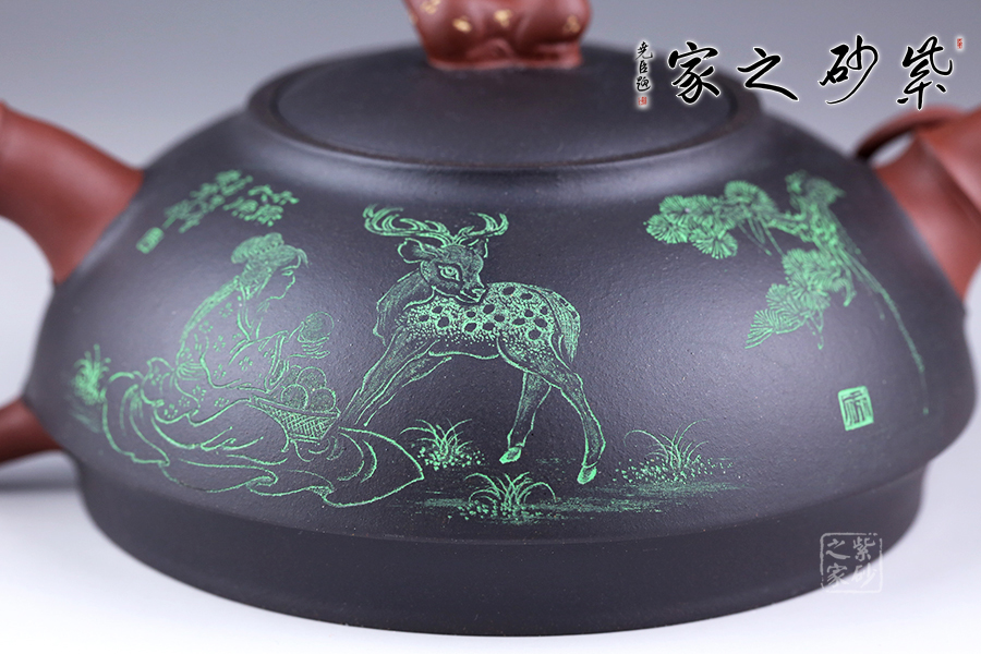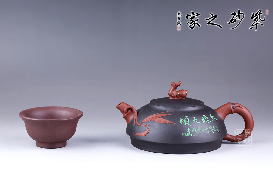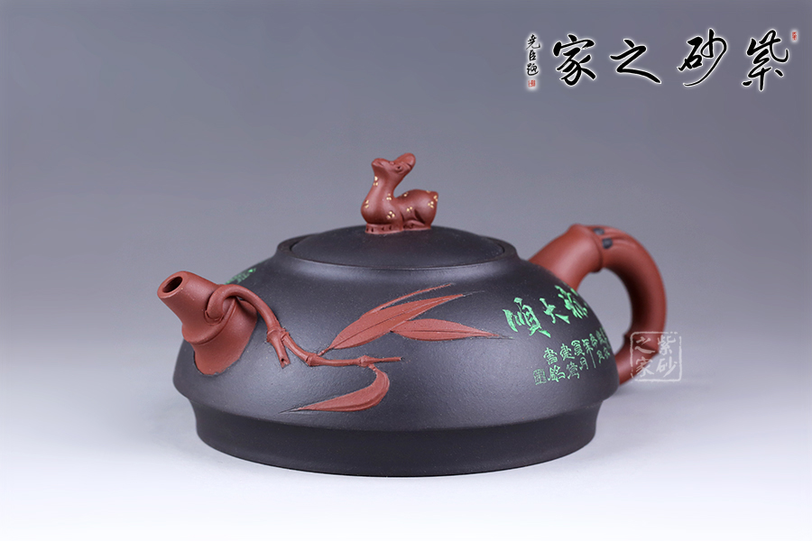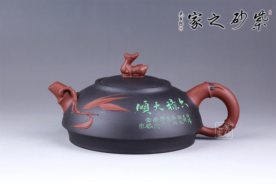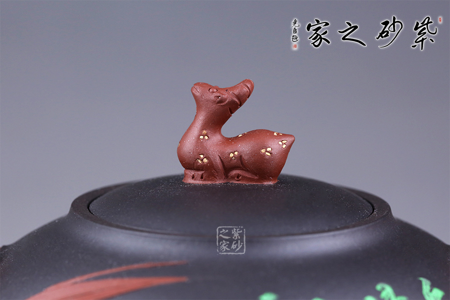 此壺圓而扁,線條流暢,流把竹節(jié)造型,一變嘴二節(jié)竹節(jié)裝飾而成,一只竹葉飄然而出,耳形端把三節(jié)竹節(jié)裝飾。壺鈕造型別出心裁,取一只神鹿為形,以鋪砂的工藝表現(xiàn)神鹿身上的斑紋,閃著金色的光芒,鹿諧音為“祿”,是招財聚福 之意。嵌蓋設(shè)計,壺頸略高,形成強(qiáng)勁的壓蓋之勢,壺身呈一只倒扣的碗形,且壺底邊緣向內(nèi)收縮一圈,使壺身更加挺立,古拙而富有老味。整款壺竹韻清疏,韻味不失,毫無矯飾,意蘊深長。