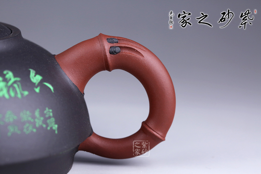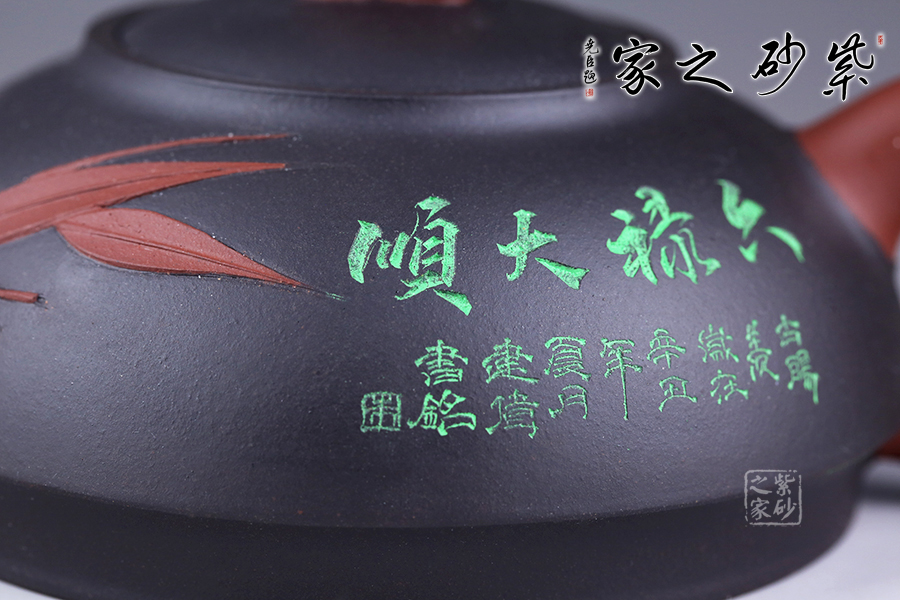 另外,壺身還采用了朱建偉老師精擅的雙色泥料特種工藝,壺身正面繪制的是“六祿大順”四個字,意蘊吉祥;壺身反面繪制的是“富貴福大順”五個字,更有招財、祈福之意,是精品中的精品。