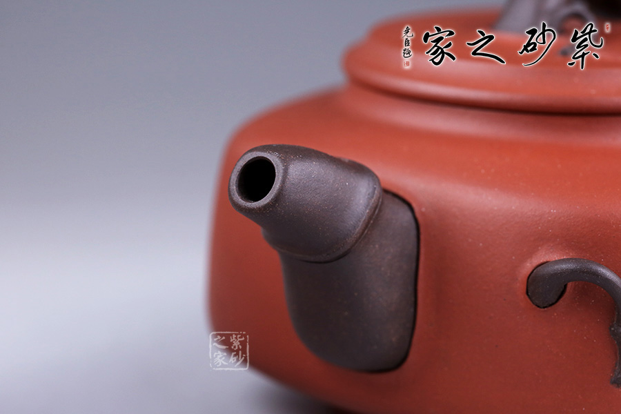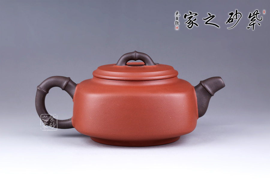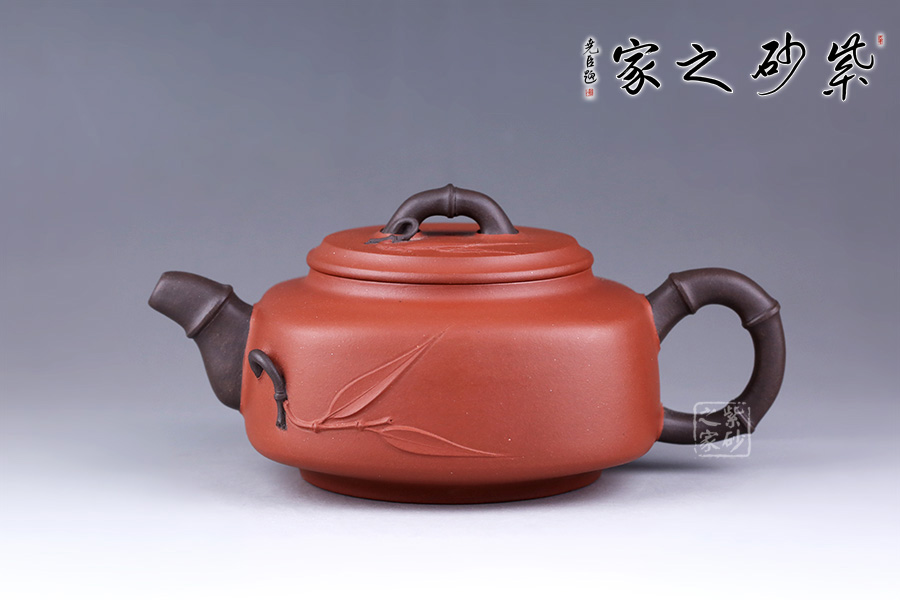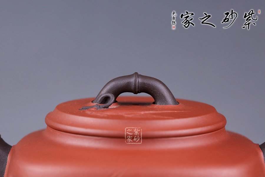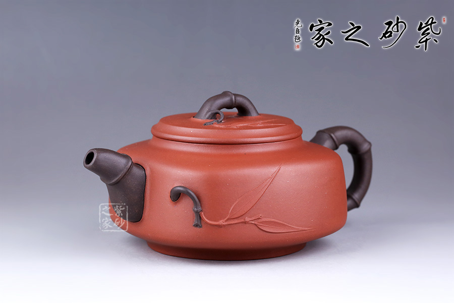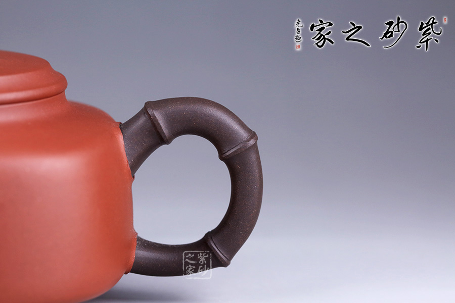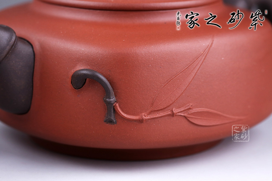 此壺采用朱建偉老師最擅長的雙色泥制作手法,泥色運用恰到好處,創(chuàng)新十足。壺身圓而扁,線條流暢。壺把、壺鈕與壺蓋均為竹節(jié)造型,在壺把之處,又伸出一節(jié)細枝,三兩片葉子裝飾在壺身,靈氣畢現(xiàn)。整壺融入竹的元素,看起來自然生動,極富生活氣息,各部位處理精氣十足,同時方圓造型留給人們無限遐想,是一把名副其實的實力派好壺!