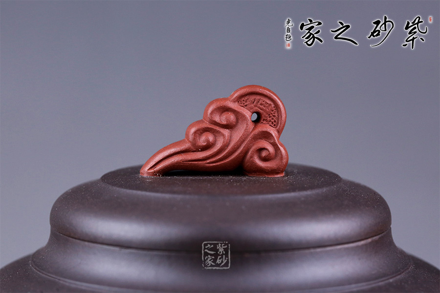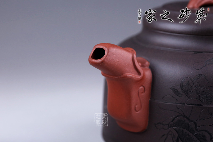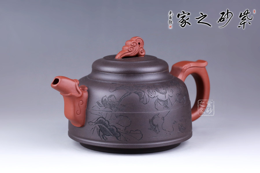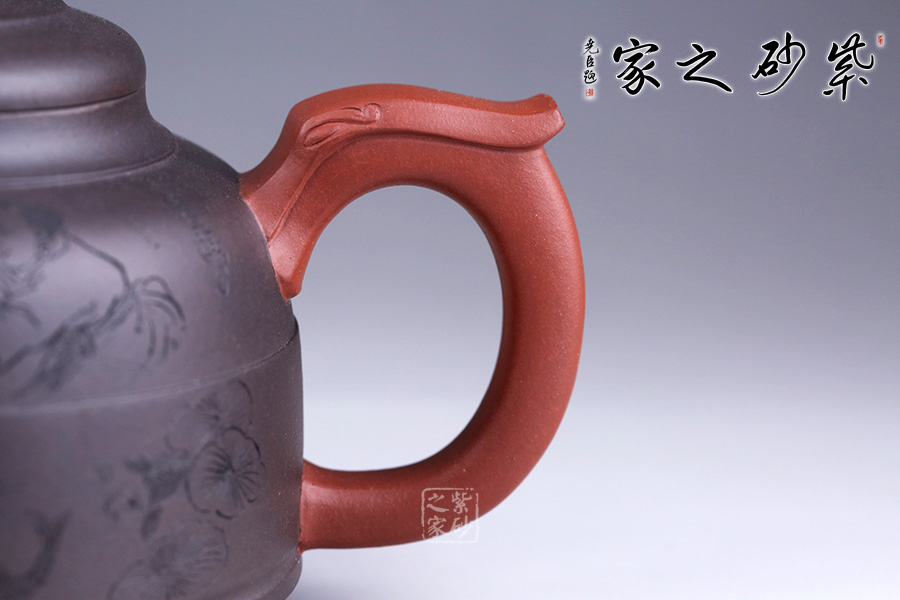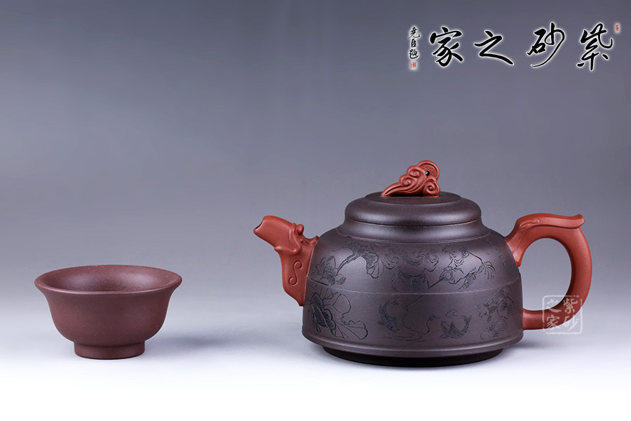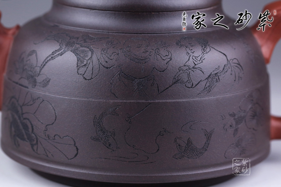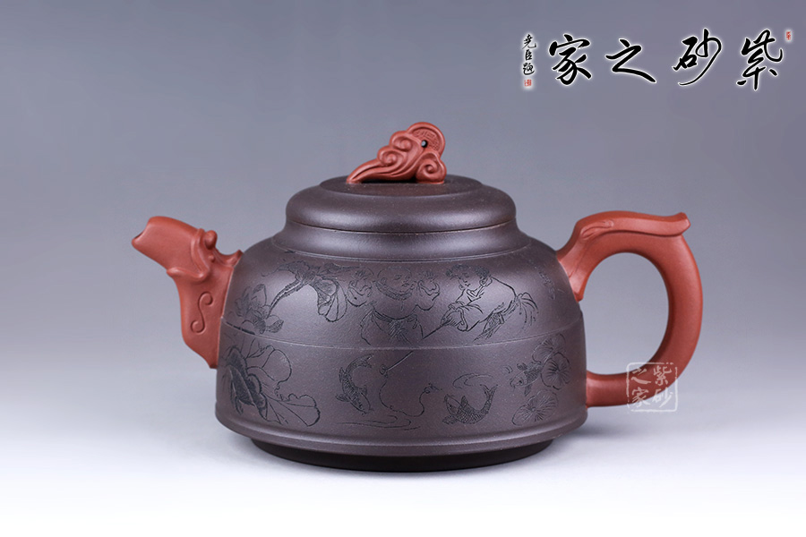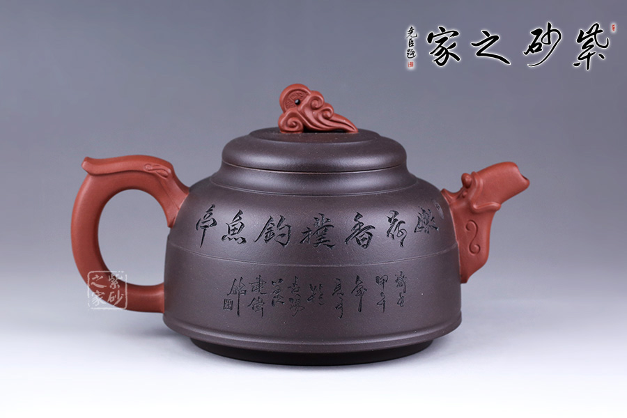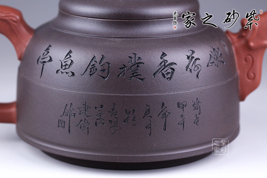 此壺采用朱建偉老師最擅長的雙色泥制作手法,泥色運用恰到好處,整體端莊大氣。 壺身似一個倒扣的碗,線條流暢,正中間一條圓線分割而來,比例恰當;壺身正面刻繪兩人嬉戲垂釣之景色,反面刻繪詩句“嫩荷香撲釣魚亭”,前后景與詩句相呼應,又點名壺意。 壺嘴似龍頭,壺把似龍尾,似一條龍貫穿壺身。壺蓋似碗底,倒扣壺身。蓋紐造型獨特,如意銅錢裝飾,有著非常美好的寓意。